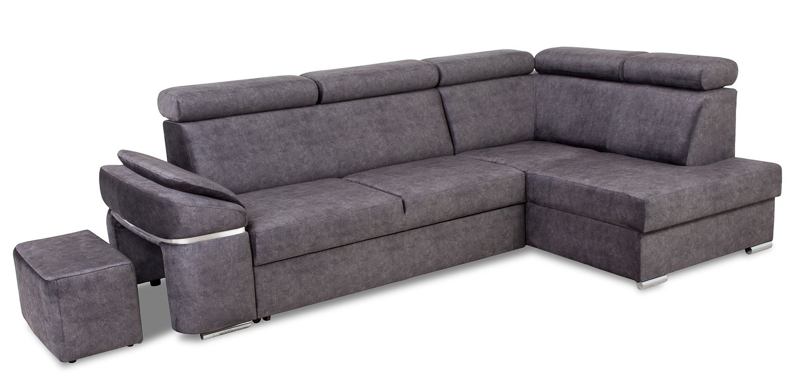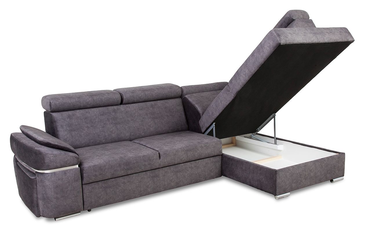 Jednym z praktycznych rozwiązań, które oferuje narożnik Palermo, jest pojemnik na pościel. To idealne miejsce do przechowywania kołder, poduszek czy innych tekstyliów, co pomaga w utrzymaniu porządku w salonie. Narożnik posiada także dodatkową pufę, która chowa się w jednym z boków mebla. Bok ten jest wyposażony w ozdobną wstawkę chromową w podłokietniku, co dodaje narożnikowi nowoczesnego i stylowego wyglądu.