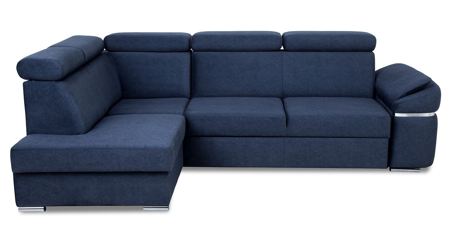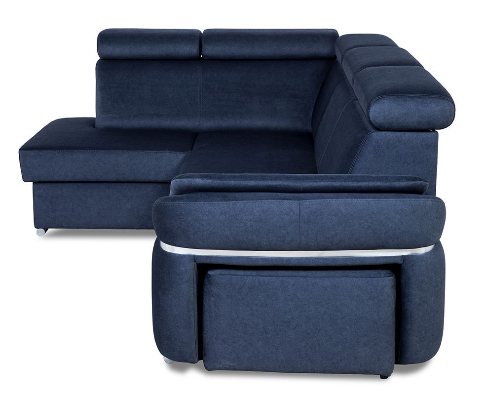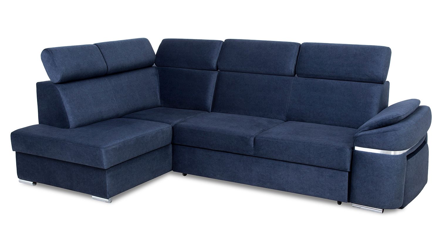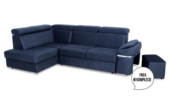 Narożnik Palermo dostępny jest w wersji prawej lub lewej, co umożliwia dostosowanie go do układu pomieszczenia. Dodatkowym atutem jest pufa chowana w jednym z boków mebla, co daje dodatkowe miejsce do siedzenia lub możliwość podparcia nóg. Bok ten jest ozdobiony chromowaną wstawką w podłokietniku, co nadaje narożnikowi jeszcze więcej elegancji.