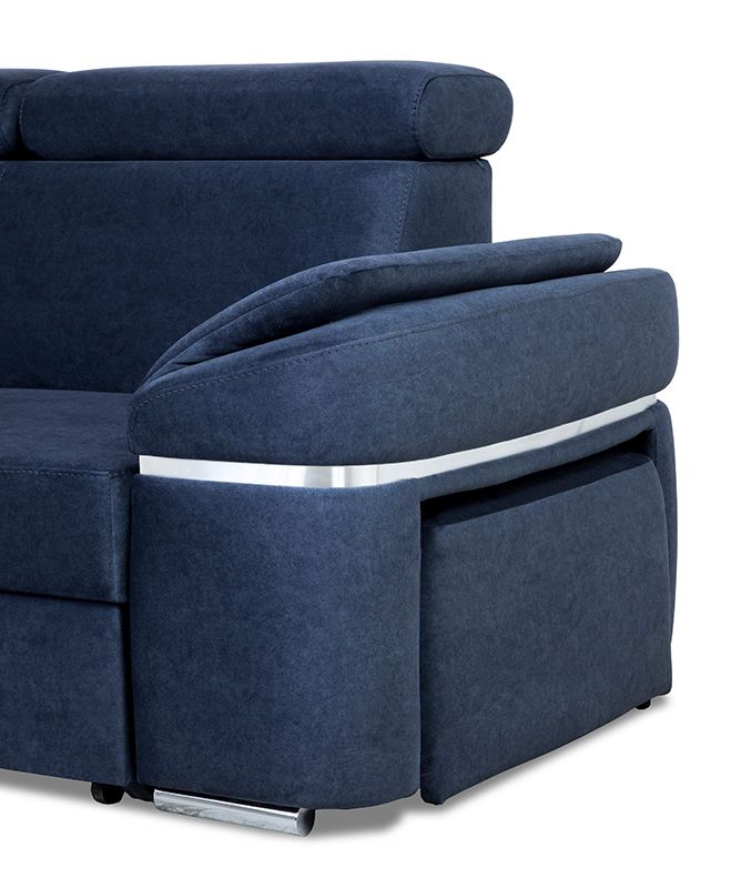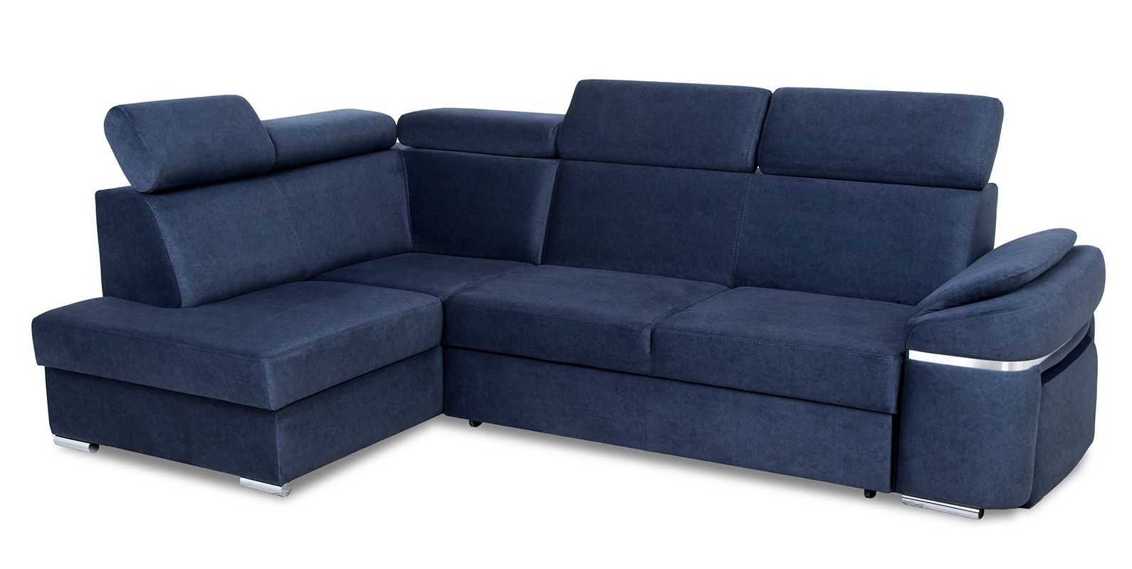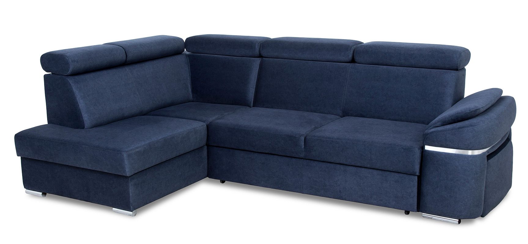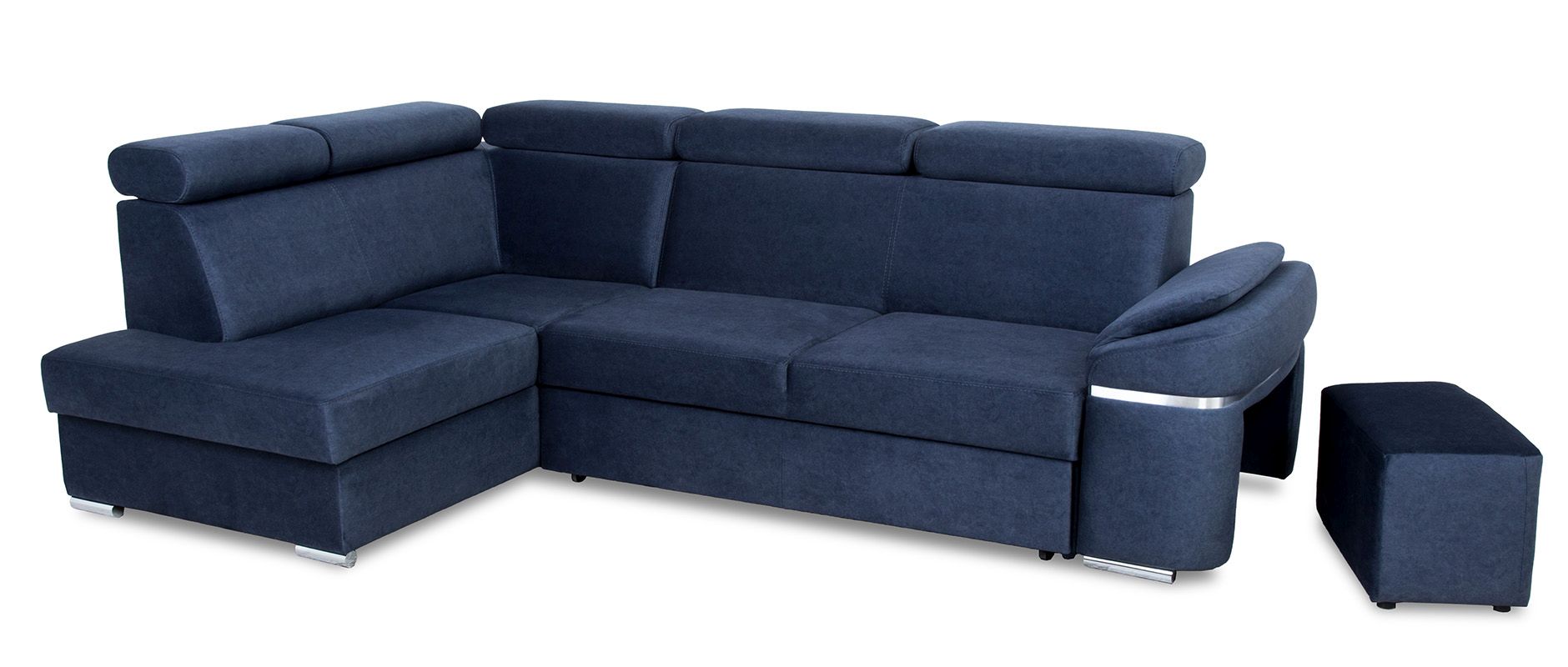 Narożnik Palermo dostępny jest w wersji prawej lub lewej, co umożliwia dostosowanie go do układu pomieszczenia. Dodatkowym atutem jest pufa chowana w jednym z boków mebla, co daje dodatkowe miejsce do siedzenia lub możliwość podparcia nóg. Bok ten jest ozdobiony chromowaną wstawką w podłokietniku, co nadaje narożnikowi jeszcze więcej elegancji.