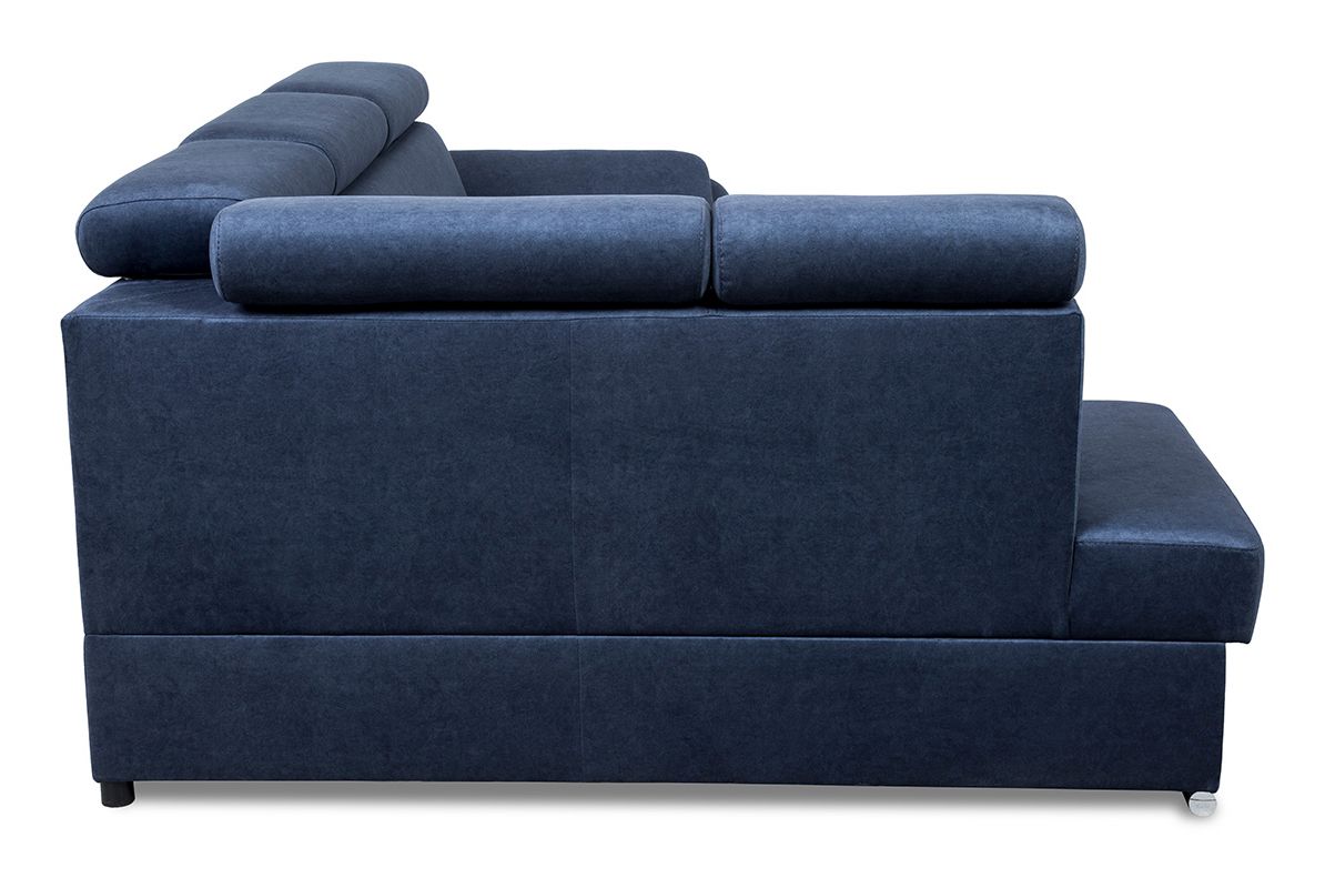 Tapicerka narożnika wykonana jest z tkaniny Whisper w kolorze granatowym. Jest to welurowy materiał, przyjemny w dotyku i charakteryzujący się subtelnym cieniowaniem, co nadaje meblowi interesujący efekt wizualny. Tkanina Whisper jest również bardzo wytrzymała i odporna na użytkowanie, co gwarantuje długowieczność narożnika.