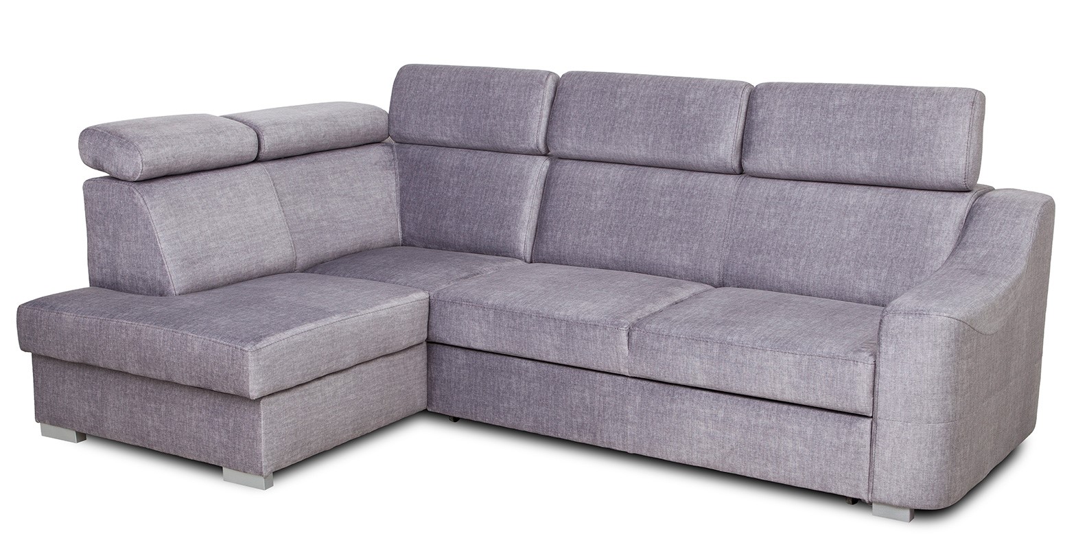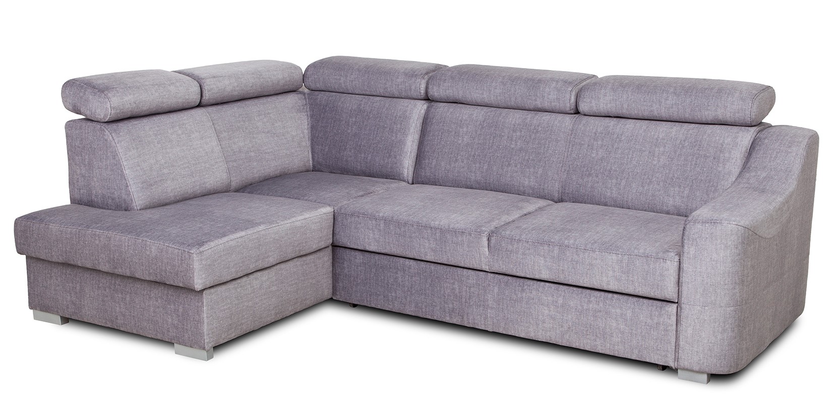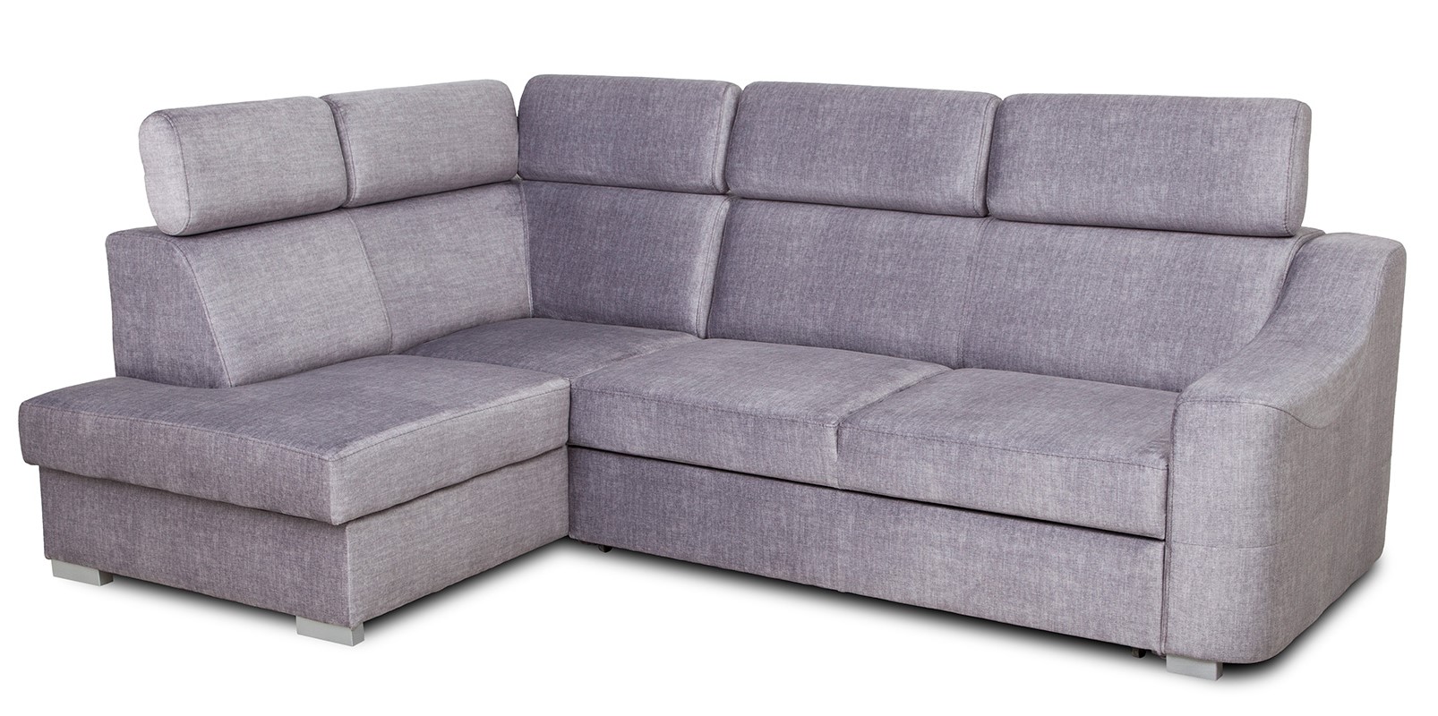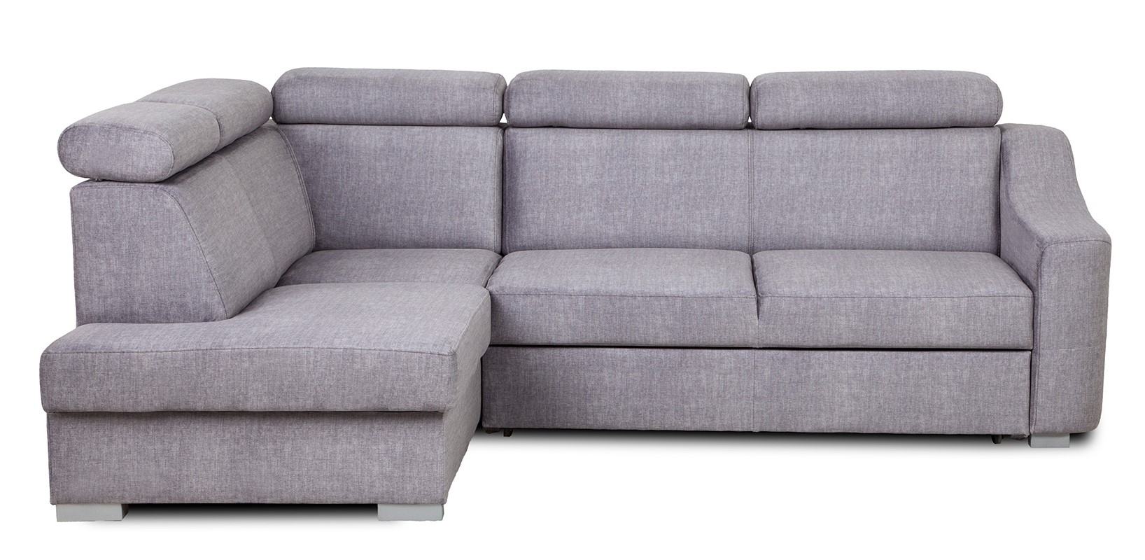 Stabilność konstrukcji podkreślają drewniane nóżki malowane na kolor srebrny matowy. Taki detal wizualnie „odciąża” bryłę i nadaje jej nowoczesny charakter. Połączenie geometrycznej formy, regulowanych zagłówków i popielatej tkaniny sprawia, że narożnik z funkcją spania Parma sprawdzi się zarówno w aranżacjach minimalistycznych, jak i bardziej klasycznych.