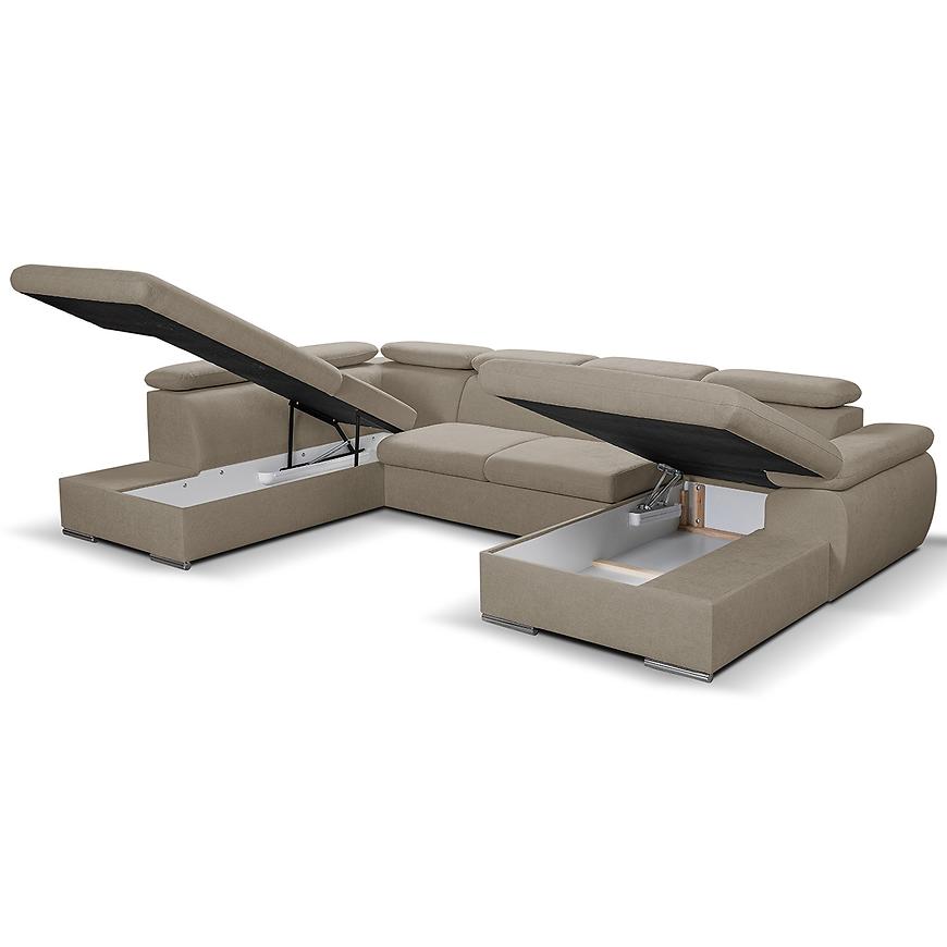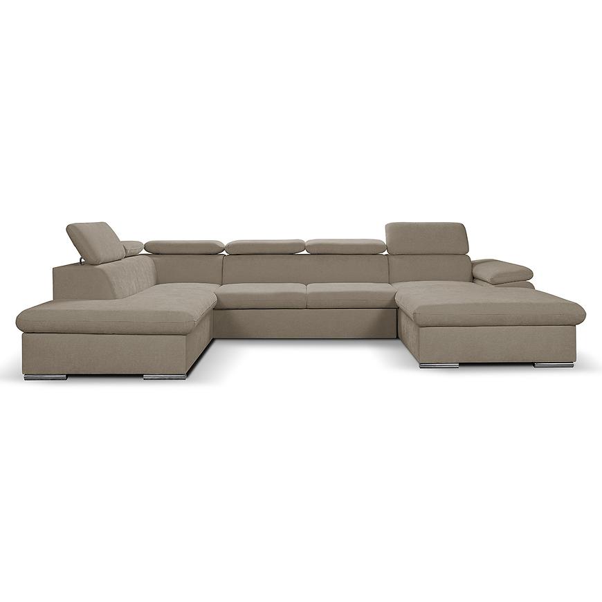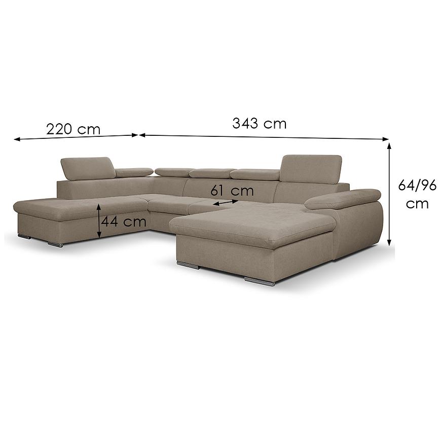 Narożnik Polo II Verita 16 prawostronny to przestronny narożnik w kształcie litery U o wymiarach 343x220 cm i wysokości 64/96 cm, tapicerowany brązową tkaniną. Siedzisko wypełnione sprężyną falistą gwarantuje wygodę podczas codziennego użytkowania, a funkcja spania typu delfin o powierzchni 125x268 cm pozwala na komfortowe spanie. Narożnik posiada dwa pojemniki na pościel, regulowane zagłówki oraz chromowane nogi, łącząc funkcjonalność z nowoczesnym stylem. Mebel waży 195 kg, wymaga montażu i nie zawiera poduszek ani pufy w zestawie. Idealny wybór dla osób szukających połączenia komfortu, przestrzeni i praktycznych rozwiązań.