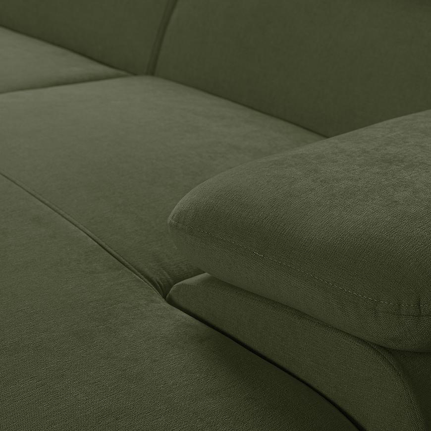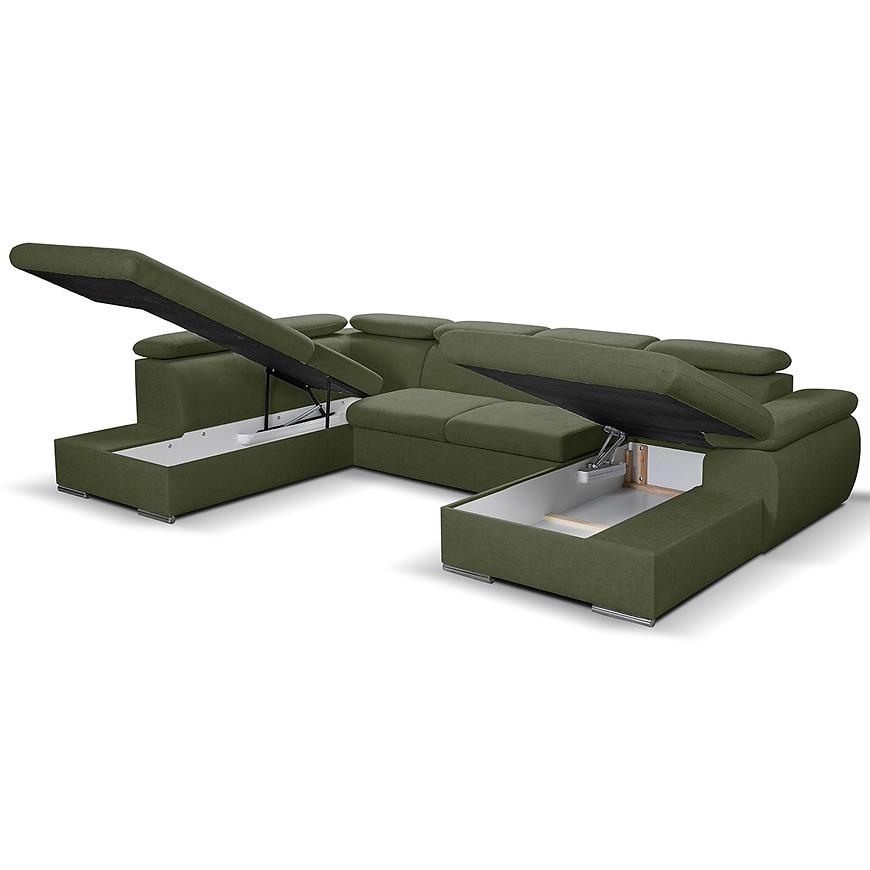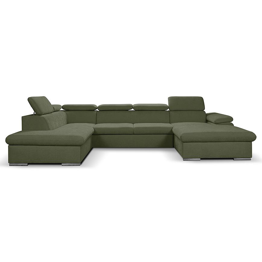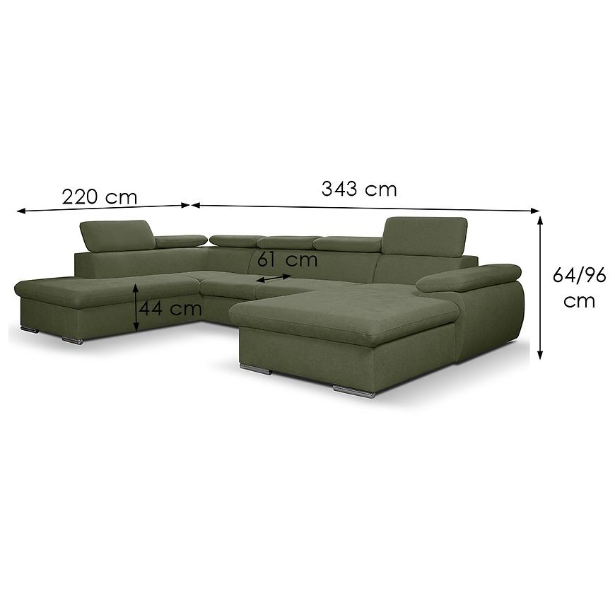Narożnik Polo II Verita 34 prawostronny to przestronny narożnik w kształcie litery U o wymiarach 343x220 cm i wysokości 64/96 cm, tapicerowany zieloną tkaniną. Siedzisko wypełnione sprężyną falistą zapewnia wygodę, a funkcja spania typu delfin daje powierzchnię 125x268 cm do nocnego odpoczynku. Posiada dwa pojemniki na pościel oraz regulowane zagłówki. Chromowane nogi dodają elegancji. Narożnik waży 195 kg, wymaga montażu i nie zawiera poduszek ani pufy w zestawie. Idealny dla osób potrzebujących dużej i funkcjonalnej przestrzeni wypoczynkowej.