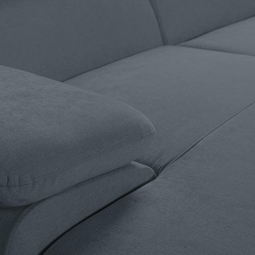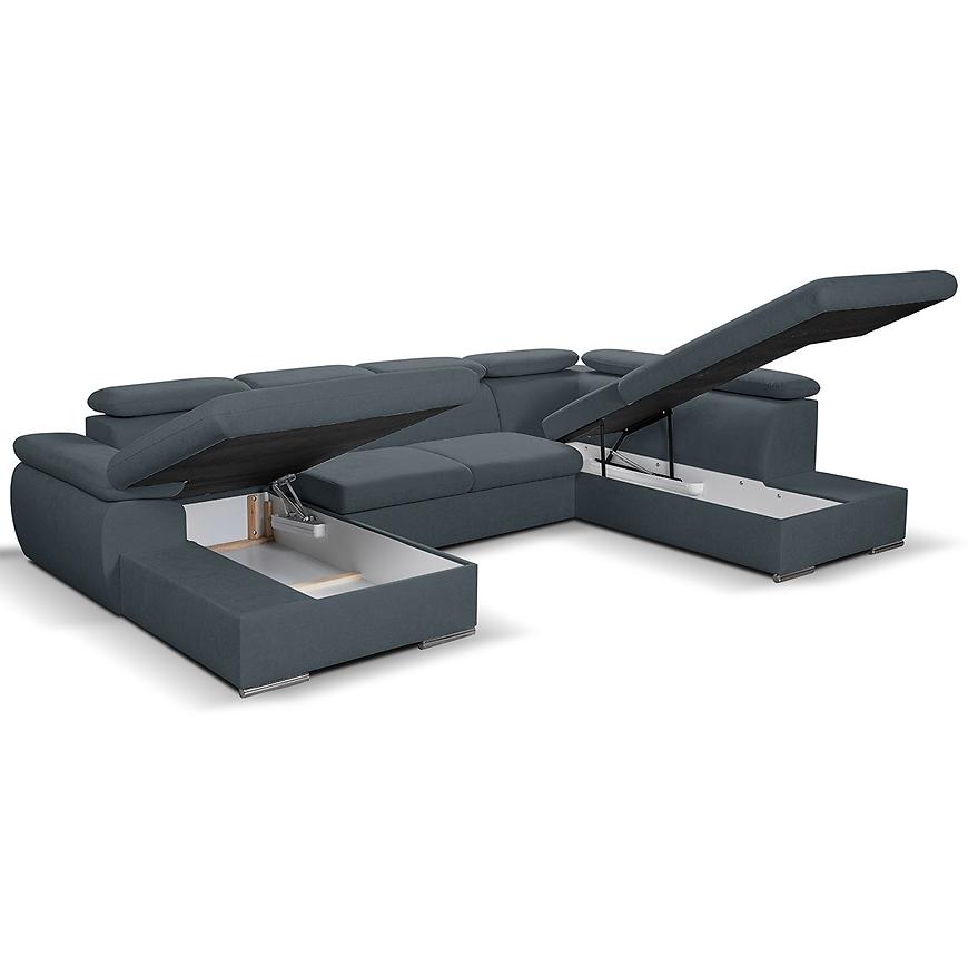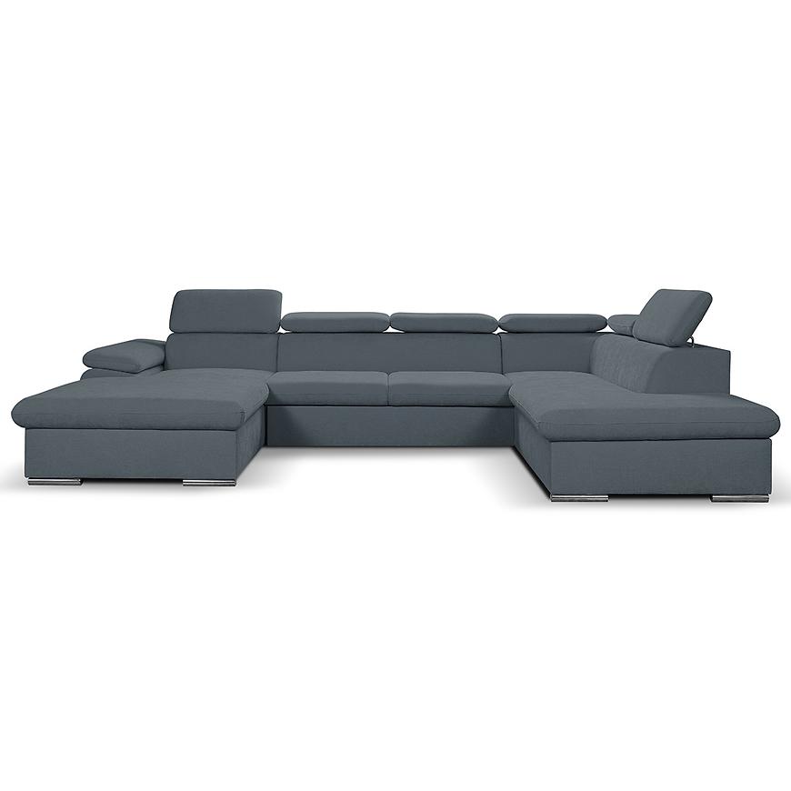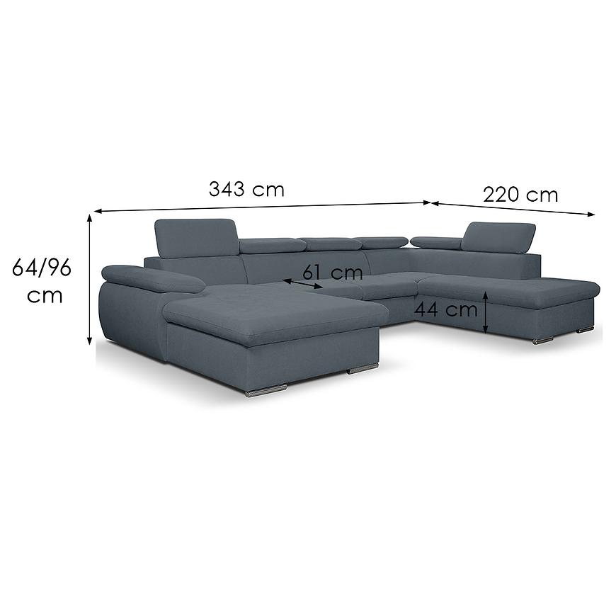 Narożnik Polo II Verita 73 lewostronny to duży narożnik w kształcie litery U o wymiarach 343x220 cm i wysokości 64/96 cm, tapicerowany niebieską tkaniną. Siedzisko wypełnione sprężyną falistą zapewnia komfort, a funkcja spania typu delfin daje powierzchnię 125x268 cm do spania. Posiada dwa pojemniki na pościel oraz regulowane zagłówki, a chromowane nogi nadają nowoczesny wygląd. Narożnik waży 195 kg, wymaga montażu i nie zawiera poduszek ani pufy w zestawie. Funkcjonalne rozwiązanie dla osób potrzebujących przestronnego narożnika z miejscem do spania.