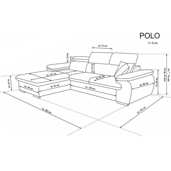 Sofa narożna Polo to najbardziej praktyczny mebel, który będzie pasował do salonu, ale znajdzie swoje miejsce również w innym pomieszczeniu. Nowoczesne narożniki rozkładane to doskonały wybór na długie lata. Funkcja spania to szczególnie ważne i świetne rozwiązanie, które zapewni miejsce snu, po rozłożeniu to okazjonalne miejsce do spania o wymiarach 124x210 cm. Polo posiada jeden pojemnik na pościel, a system rozkładania typu delfin to szybki, prosty i wygodny sposób rozkładania.