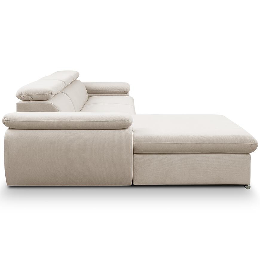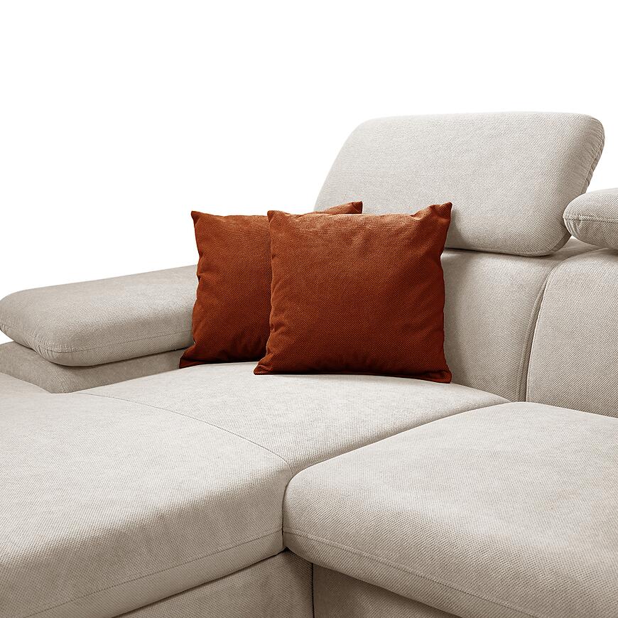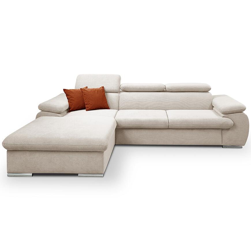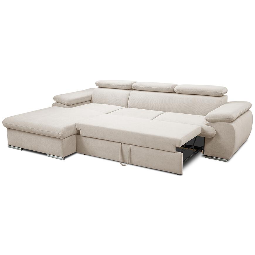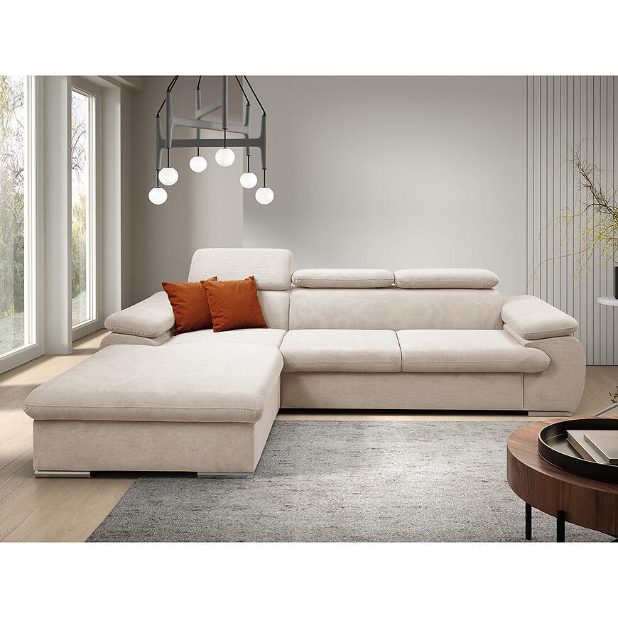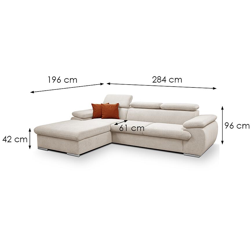 Narożnik Polo Pretty 03 lewostronny to średniej wielkości narożnik w kształcie litery L o wymiarach 284x196x96 cm z funkcją spania 210x124 cm. Wyposażony w schowek na pościel, automat do rozkładania typu delfin oraz regulowany zagłówek. Siedzisko wypełnione sprężyną falistą, tapicerka z tkaniny w kolorze beżowym. Narożnik posiada poduszki w zestawie, srebrne nogi i wymaga złożenia, łącząc komfort, funkcjonalność i nowoczesny design.