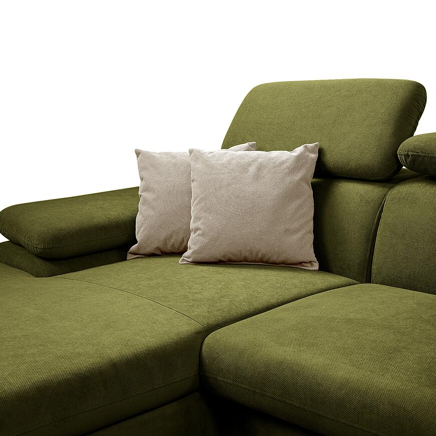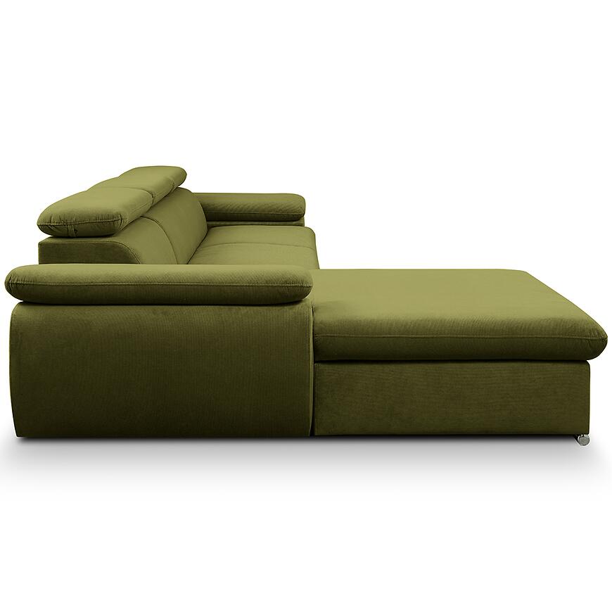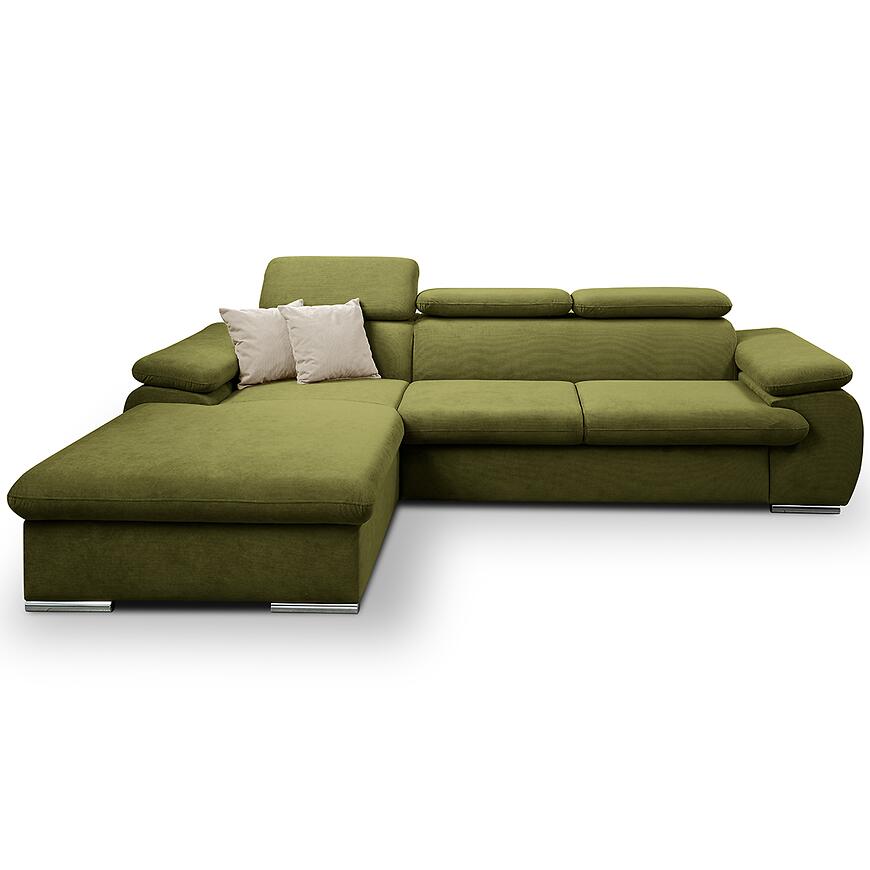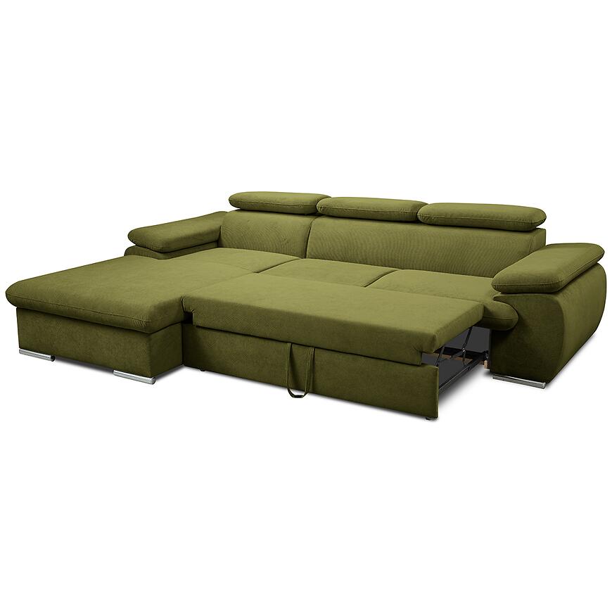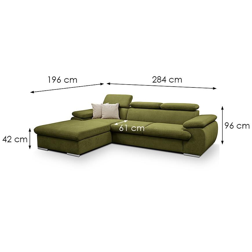 Narożnik Polo Pretty 12 lewostronny to średniej wielkości narożnik w kształcie litery L o wymiarach 284x196x96 cm z funkcją spania 210x124 cm. Posiada schowek na pościel, automat do rozkładania typu delfin oraz regulowany zagłówek. Siedzisko wypełnione sprężyną falistą, tapicerka z tkaniny w kolorze zielonym. Narożnik wyposażono w poduszki w zestawie, srebrne nogi i wymaga złożenia, łącząc komfort, funkcjonalność i nowoczesny design.