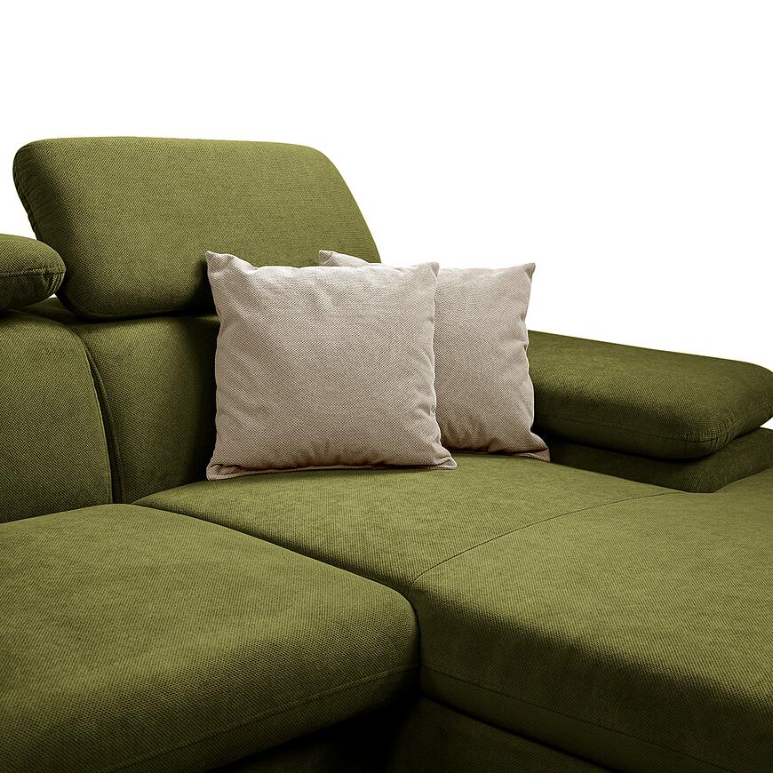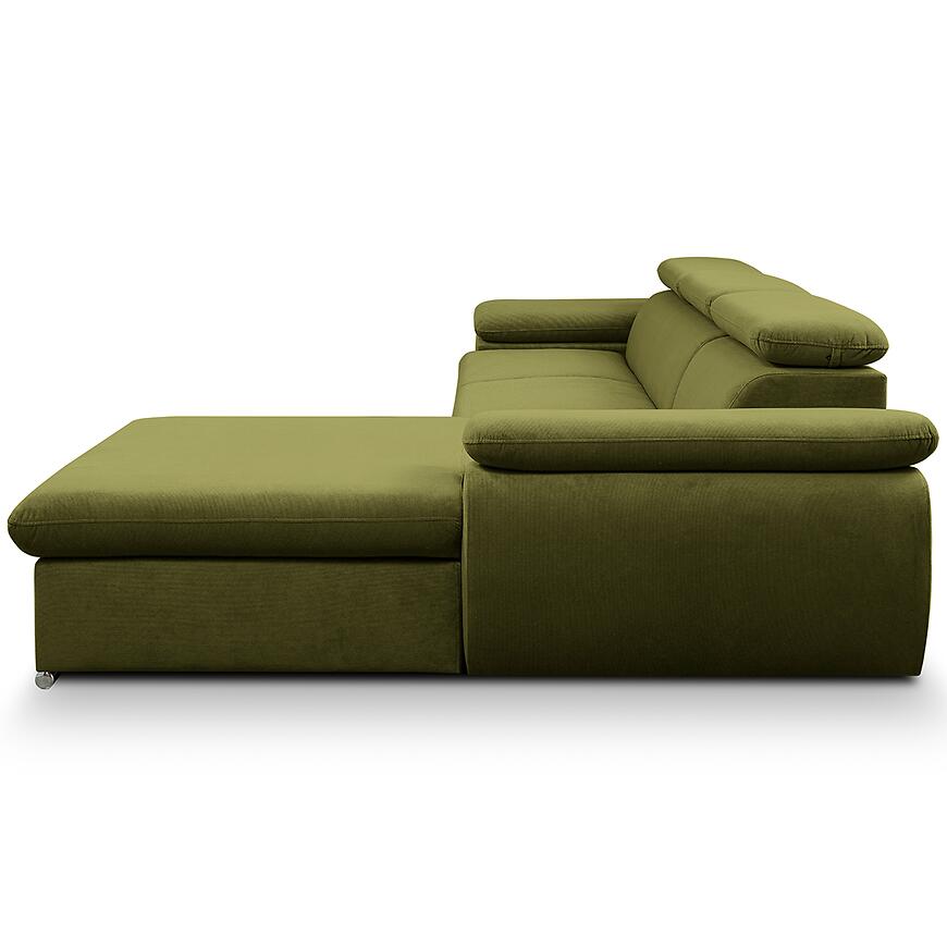 Narożnik Polo Pretty 12 prawostronny to średniej wielkości narożnik w kształcie litery L o wymiarach 284x196x96 cm z funkcją spania 210x124 cm. Wyposażony w schowek na pościel, automat do rozkładania typu delfin oraz regulowany zagłówek. Siedzisko wypełnione sprężyną falistą, tapicerka z tkaniny w kolorze zielonym. Narożnik posiada poduszki w zestawie, srebrne nogi i wymaga złożenia, oferując komfort, funkcjonalność i nowoczesny design.
