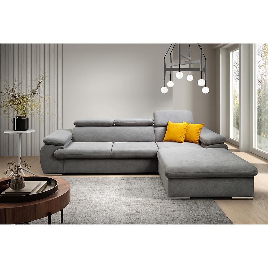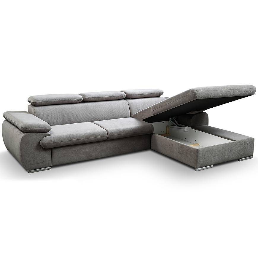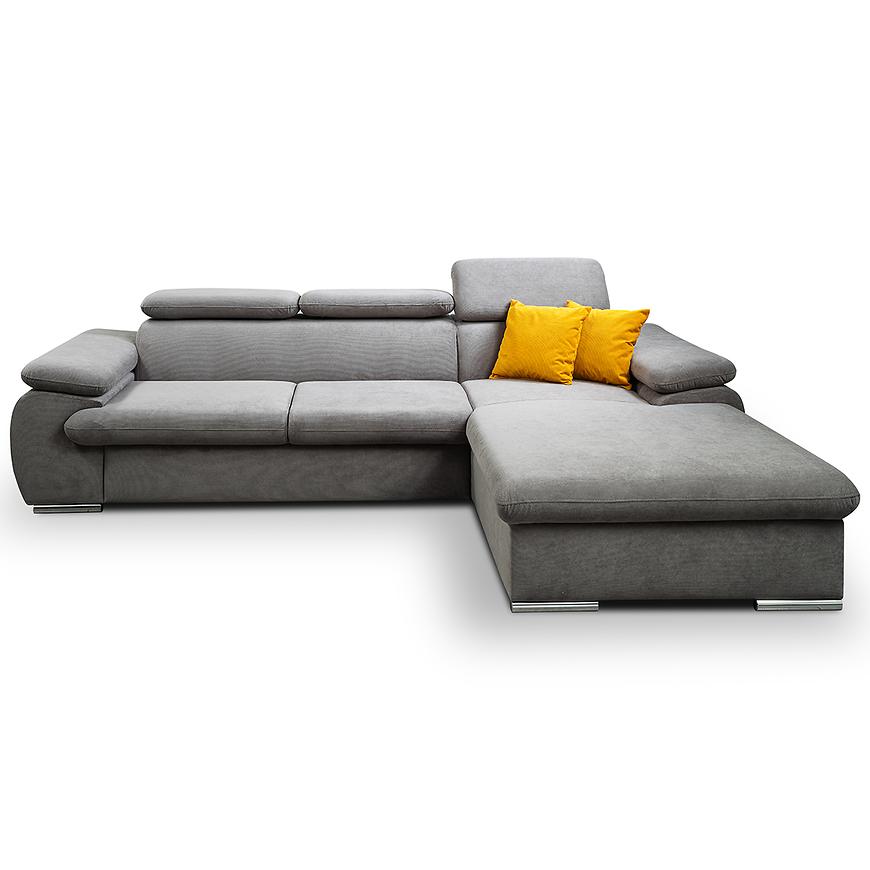 Narożnik z funkcją spania Polo oraz pojemnikiem na pościel. Narożnik w komplecie posiada dwie małe poduszki dekoracyjne. Model wykonany w tkaninie Pretty 17 w kolorze szarym. W siedzisku zastosowano sprężyny faliste. Narożnik dostępny jest w konfiguracji prawej lub lewej. Sposób rozkładania to popularny system delfin. Po rozłożeniu to okazjonalne miejsce do spania o wymiarach 124x210 cm. W narożniku zostosowano nóżki w kolorze srebrnym.