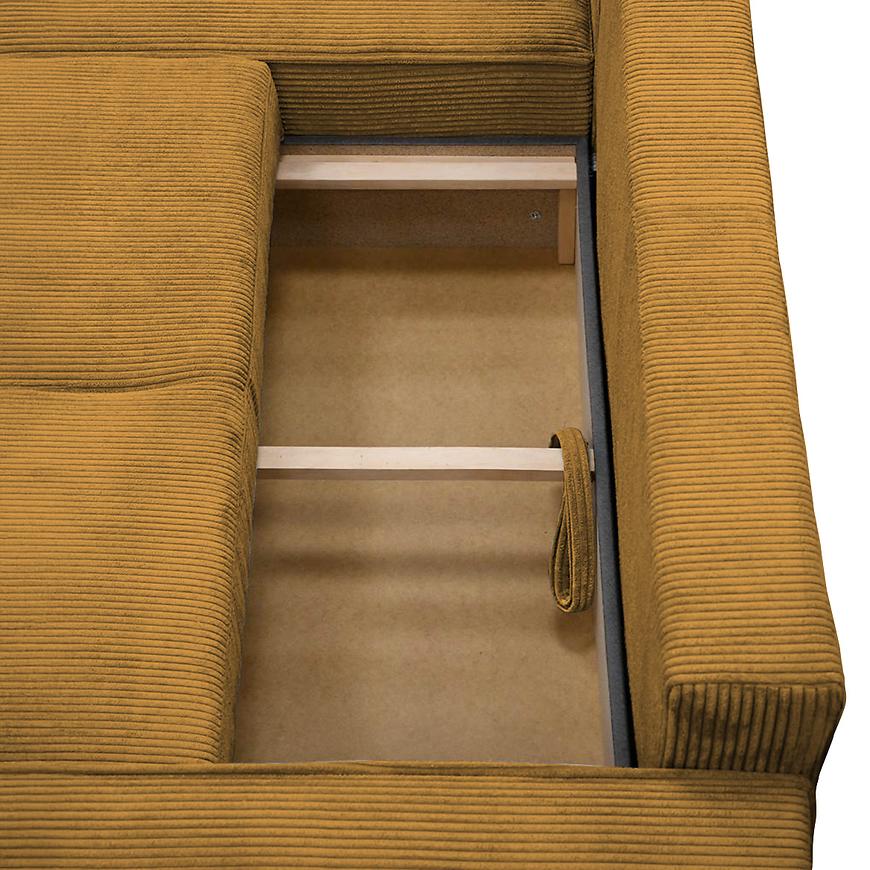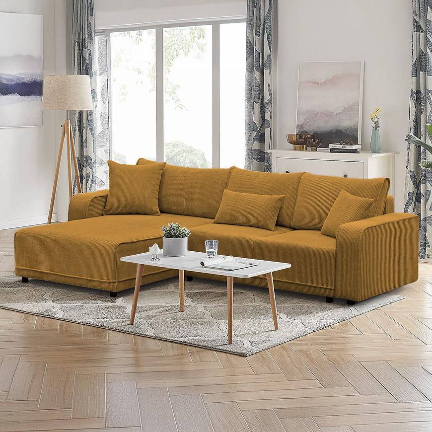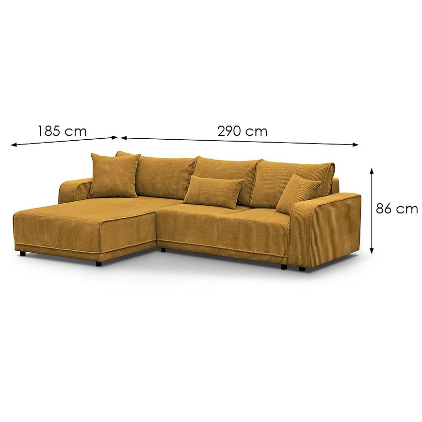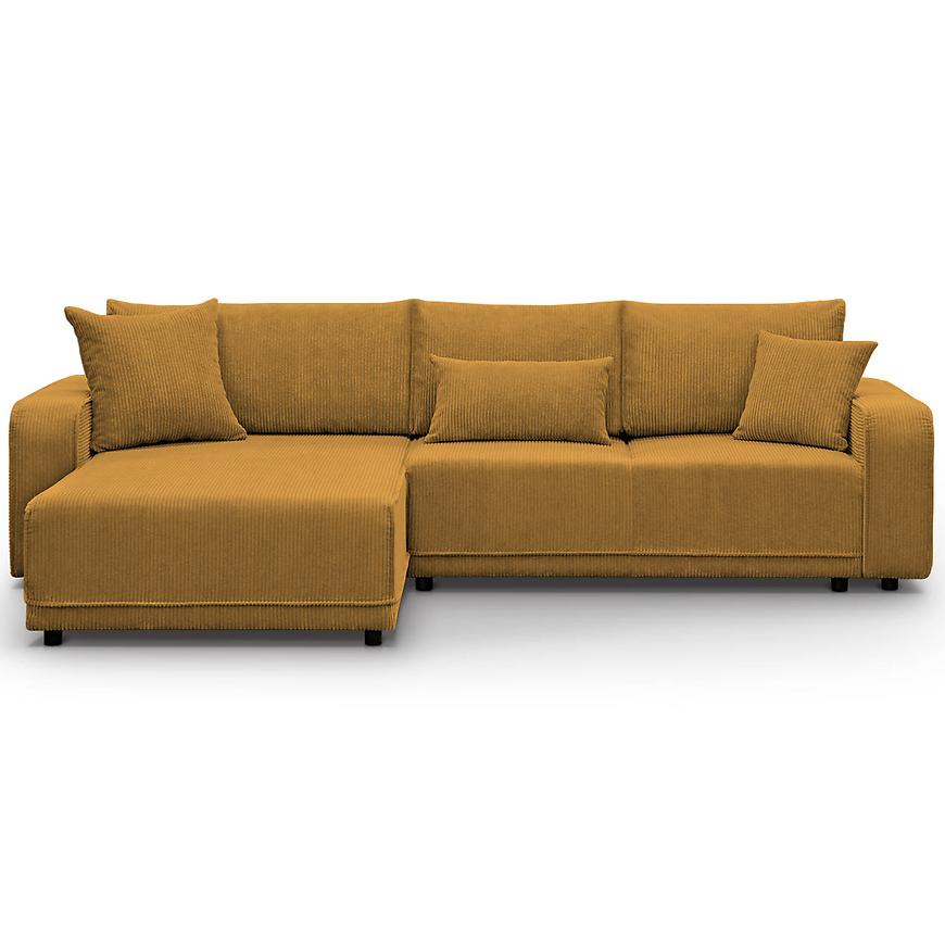 Narożnik Primo L Poso 01 w wersji lewostronnej to stylowy narożnik średniej wielkości w modnym musztardowym kolorze, który doskonale wpasuje się w nowoczesne wnętrza. Wyposażony w sprężynę falistą, funkcję spania o powierzchni DL oraz praktyczny pojemnik na pościel, pozwala na szybkie przekształcenie w wygodne łóżko. Solidne nogi, tapicerka z tkaniny oraz zestaw poduszek zapewniają komfort użytkowania i elegancki wygląd.