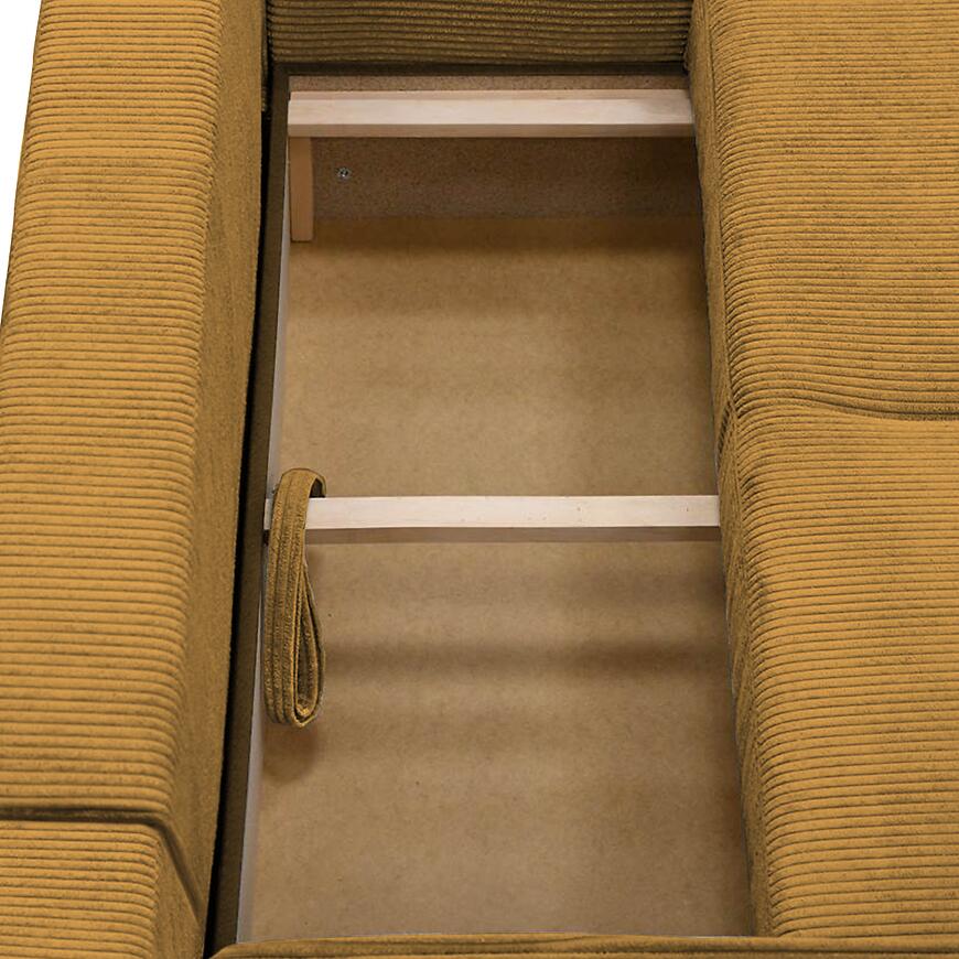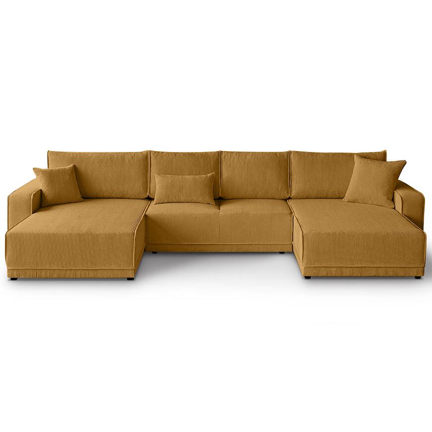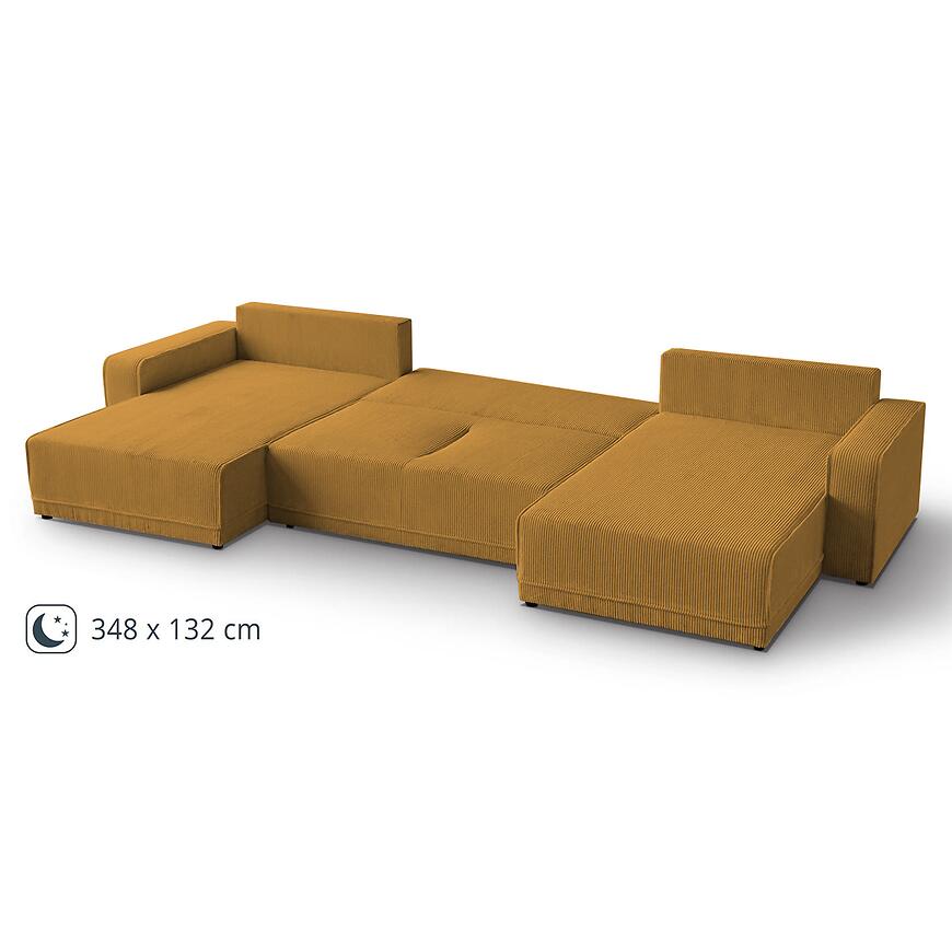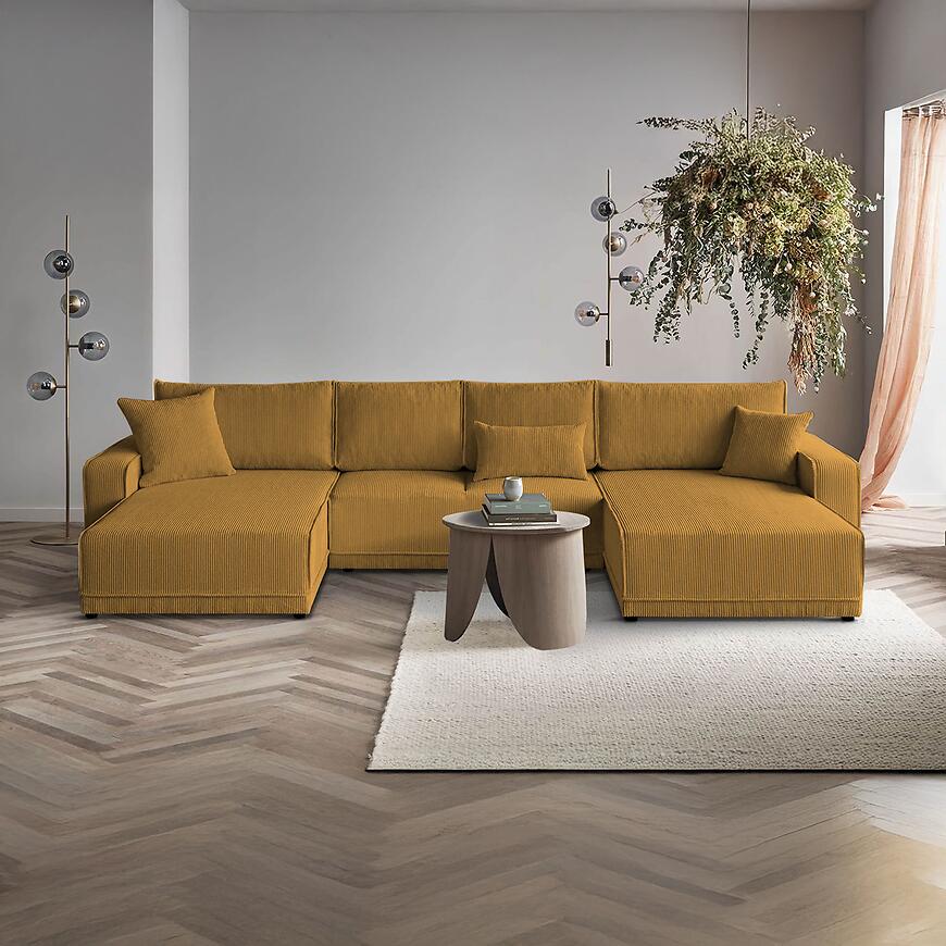Narożnik Primo U Poso 01 w uniwersalnym układzie i efektownym musztardowym kolorze to wyjątkowo przestronny i komfortowy mebel wypoczynkowy w kształcie litery U, idealny do dużych salonów. Tapicerowany wysokiej jakości tkaniną, z siedziskiem wypełnionym sprężyną falistą, zapewnia wygodę podczas codziennego użytkowania. Wyposażony w funkcję spania ze sposobem rozkładania DL oraz pojemnik na pościel, łączy praktyczność z nowoczesnym designem. Solidne nogi i starannie wykonane poduszki dopełniają elegancki charakter narożnika. Mebel wymaga złożenia, jest uniwersalny i doskonale sprawdzi się jako centralny element salonu, gwarantując komfort dla całej rodziny.