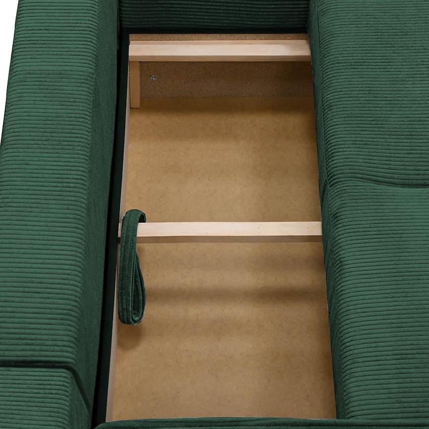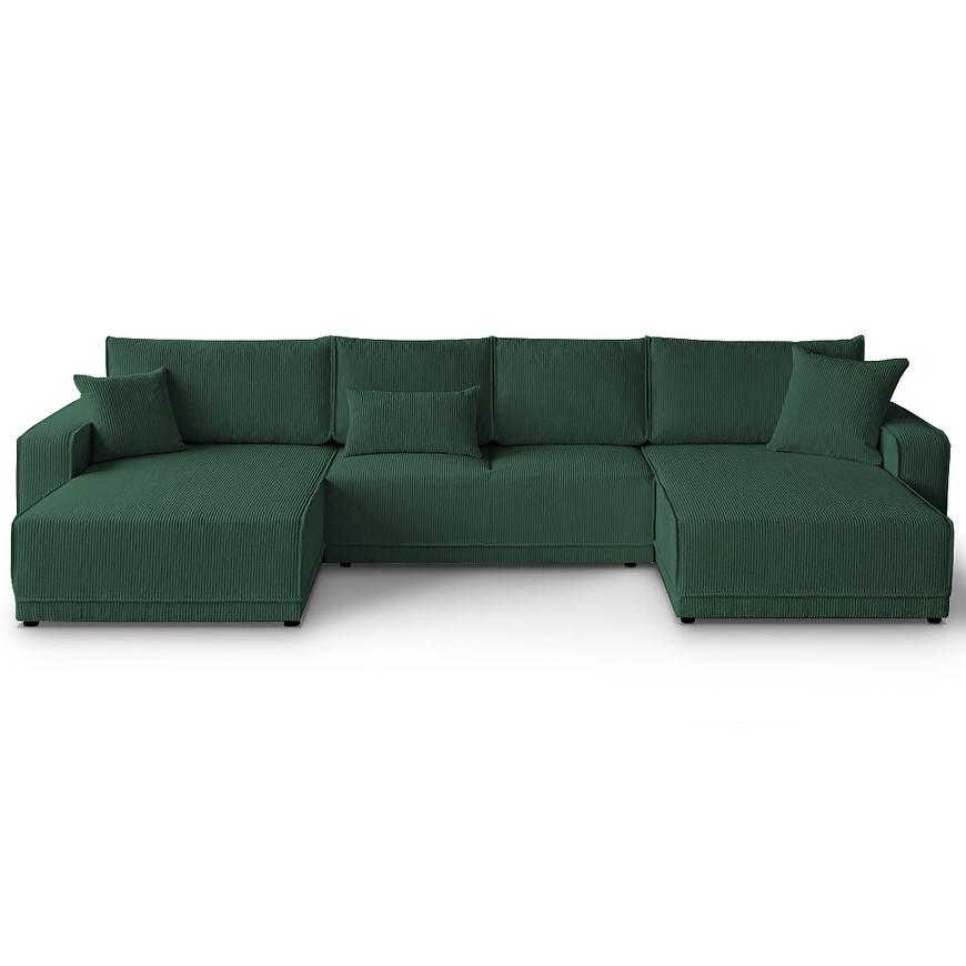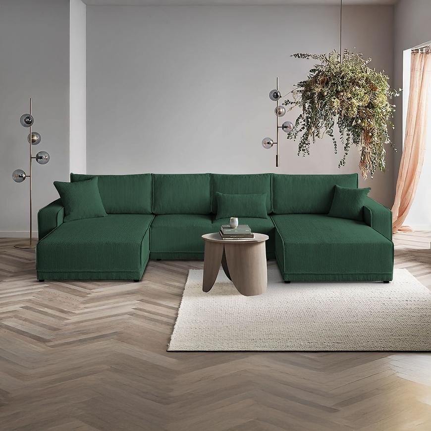 Narożnik Primo U Poso 14 w uniwersalnym układzie i intensywnym zielonym kolorze to przestronny, komfortowy mebel w kształcie litery U, idealny do bardzo dużych salonów. Tapicerowany wysokiej jakości tkaniną, z siedziskiem wypełnionym sprężyną falistą, zapewnia wygodę i relaks dla całej rodziny. Wyposażony w funkcję spania ze sposobem rozkładania DL oraz pojemnik na pościel, łączy praktyczność z nowoczesnym designem. Solidne nogi i poduszki w zestawie podkreślają elegancki charakter narożnika. Mebel wymaga złożenia, jest uniwersalny i doskonale sprawdzi się jako centralny element salonu, gwarantując komfort użytkowania na co dzień.