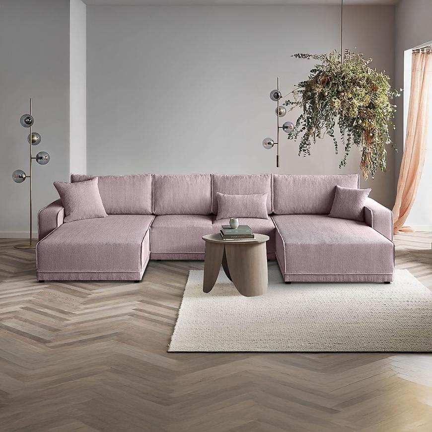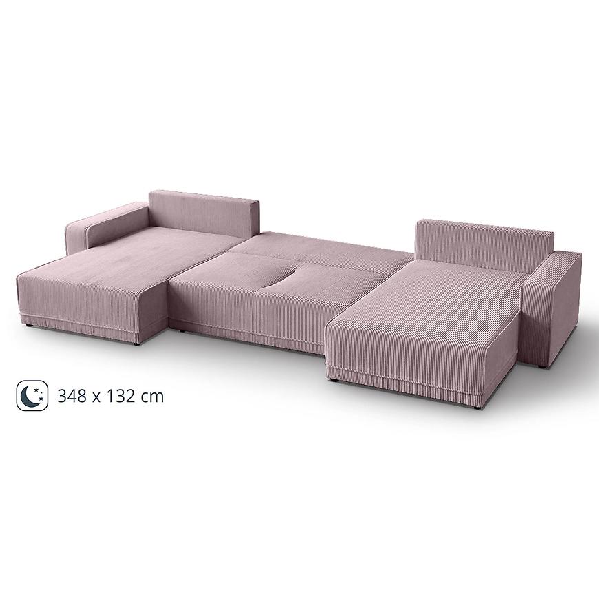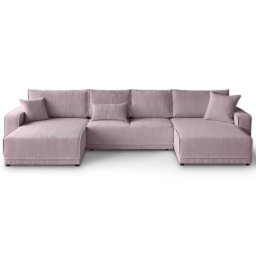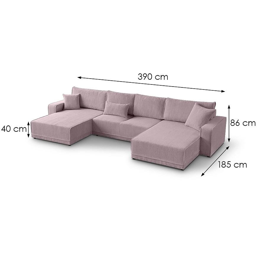 Narożnik Primo U Poso 27 w uniwersalnym układzie to bardzo duży narożnik w kształcie litery U, idealny do przestronnych salonów. Tapicerowany trwałą różową tkaniną, z komfortowym siedziskiem wypełnionym sprężyną falistą. Wyposażony w funkcję spania ze sposobem rozkładania DL oraz pojemnik na pościel. Solidne nogi i poduszki w komplecie podkreślają elegancki wygląd narożnika. Mebel wymaga złożenia i zapewnia wygodną przestrzeń do wypoczynku dla całej rodziny.