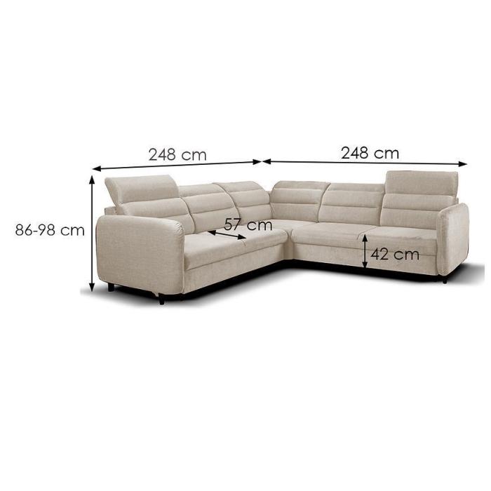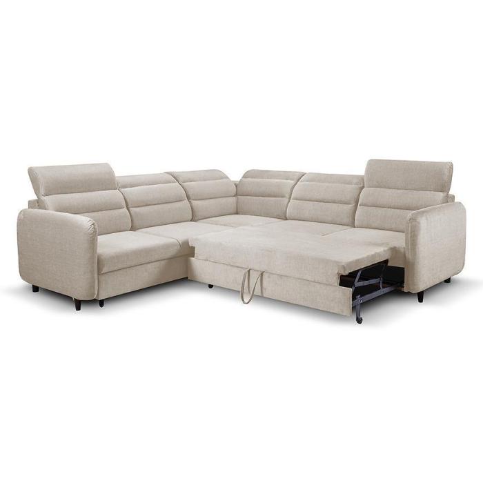 Narożnik Samos z funkcją spania został pokryty tkaniną. Prostotę i łatwość użytkowania gwarantuje system rozkładania typu delfin. Jest to szybki, prosty i wygodny sposób rozkładania. Jest jednym z najbardziej popularnych systemów rozkładania, który jest wykorzystywany w narożnikach. Po rozłożeniu to okazjonalne miejsce do spania o wymiarach 123x201 cm. Mebel posiada pojemnik, do którego można schować pościel, dodatkowe koce czy też poduszki. W siedzisku zastosowano sprężynę falistą, która dostosowuje się do ciężaru i kształtu ciała, zapewniając tym samym wysoki komfort siedzenia. Ten niepowtarzalny mebel wypoczynkowy stworzono z myślą o funkcjonalności i eleganckim wyglądzie. Narożnik dostępny w wersji prawostronnej i lewostronnej.