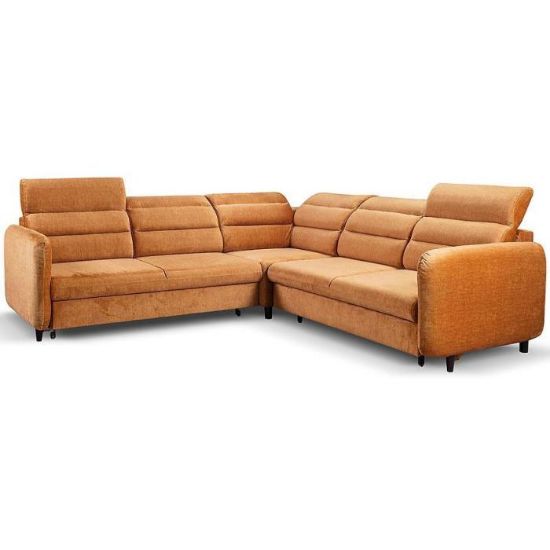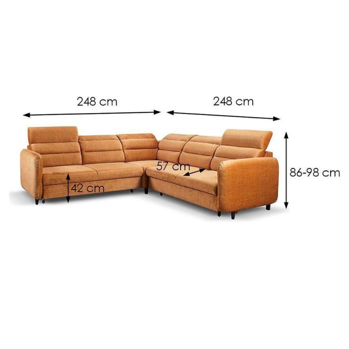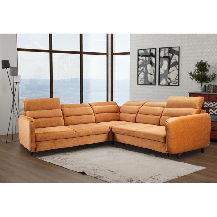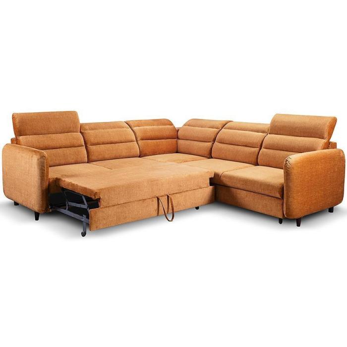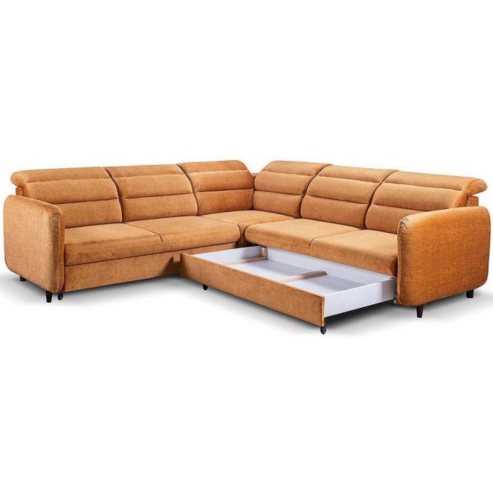 Narożnik Samos z funkcją spania został pokryty tkaniną. Prostotę i łatwość użytkowania gwarantuje system rozkładania typu delfin. Jest to szybki, prosty i wygodny sposób rozkładania. Jest jednym z najbardziej popularnych systemów rozkładania, który jest wykorzystywany w narożnikach. Po rozłożeniu to okazjonalne miejsce do spania o wymiarach 123x201 cm. Mebel posiada pojemnik, do którego można schować pościel, dodatkowe koce czy też poduszki. W siedzisku zastosowano sprężynę falistą, która dostosowuje się do ciężaru i kształtu ciała, zapewniając tym samym wysoki komfort siedzenia. Ten niepowtarzalny mebel wypoczynkowy stworzono z myślą o funkcjonalności i eleganckim wyglądzie. Narożnik dostępny w wersji prawostronnej i lewostronnej.