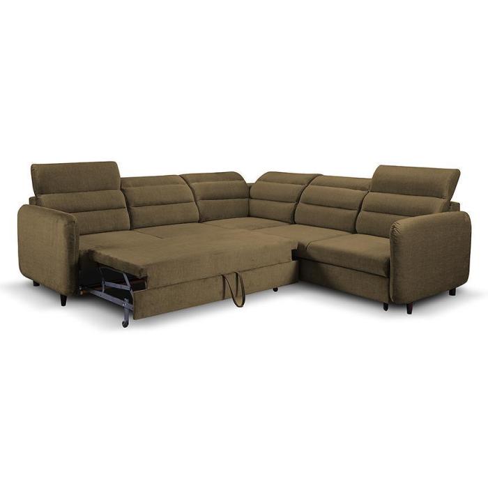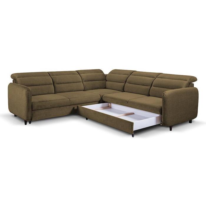 Narożnik Samos z funkcją spania został pokryty tkaniną. Prostotę i łatwość użytkowania gwarantuje system rozkładania typu delfin. Jest to szybki, prosty i wygodny sposób rozkładania. Jest jednym z najbardziej popularnych systemów rozkładania, który jest wykorzystywany w narożnikach. Po rozłożeniu to okazjonalne miejsce do spania o wymiarach 123x201 cm. Mebel posiada pojemnik, do którego można schować pościel, dodatkowe koce czy też poduszki. W siedzisku zastosowano sprężynę falistą, która dostosowuje się do ciężaru i kształtu ciała, zapewniając tym samym wysoki komfort siedzenia. Ten niepowtarzalny mebel wypoczynkowy stworzono z myślą o funkcjonalności i eleganckim wyglądzie. Narożnik dostępny w wersji prawostronnej i lewostronnej.