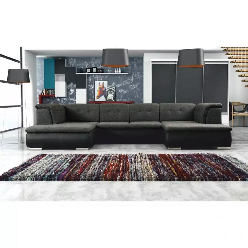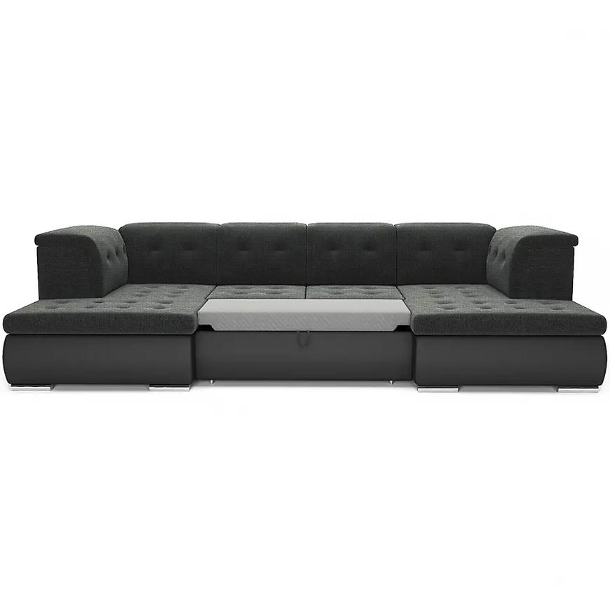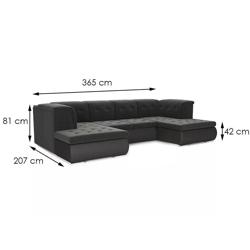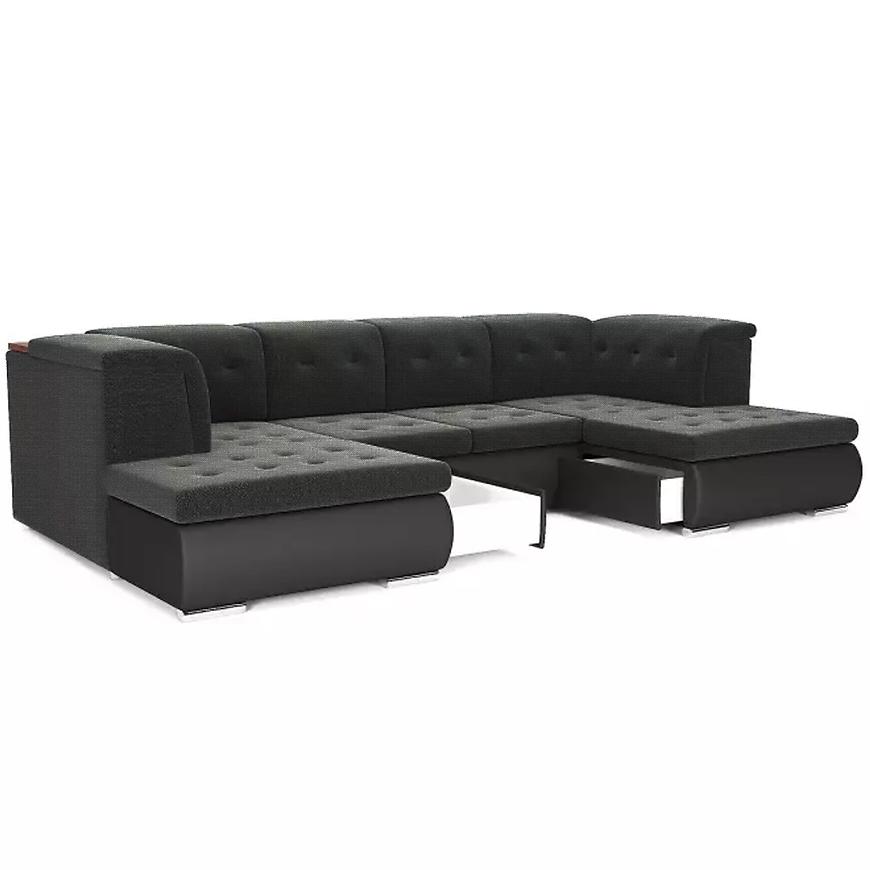 Narożnik Santiago Madryt 1100 + Inari 96 to bardzo duży narożnik w czarnym kolorze, o kształcie litery U, łączący nowoczesny design z funkcjonalnością. Wymiary: szerokość 365 cm, głębokość 207 cm, wysokość 81 cm, wysokość siedziska 42 cm, głębokość siedziska 80 cm. Wyposażony w funkcję spania o powierzchni 145x282 cm z systemem rozkładania delfin oraz dwa pojemniki na pościel. Tapicerka z tkaniny i ekoskóry, wypełnienie siedziska ze sprężyny falistej zapewnia wygodę i trwałość. Narożnik posiada srebrne nogi, wymaga złożenia i jest uniwersalny pod względem orientacji. Idealny do przestronnych, nowoczesnych wnętrz.