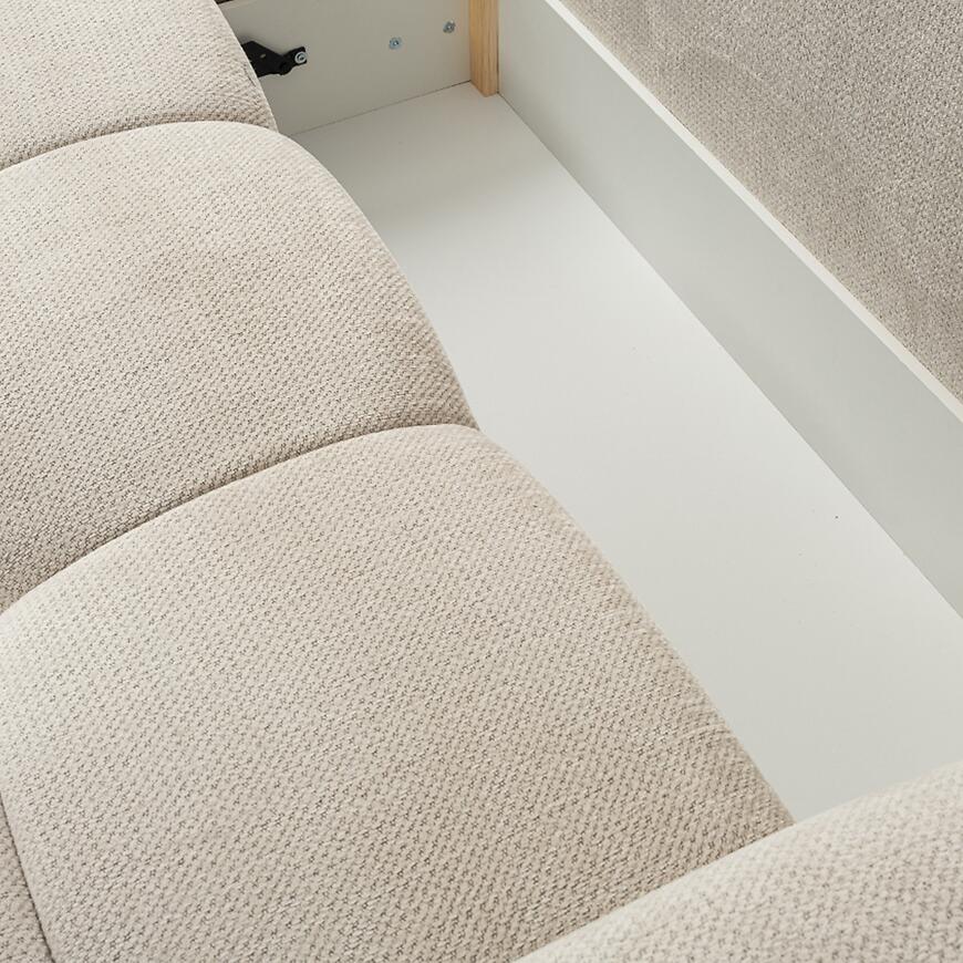 Pod siedziskiem znajduje się jeden pojemny schowek na pościel, który umożliwia przechowywanie kołder, poduszek czy koców. Rozwiązanie to ułatwia utrzymanie porządku i maksymalizuje wykorzystanie przestrzeni w salonie.