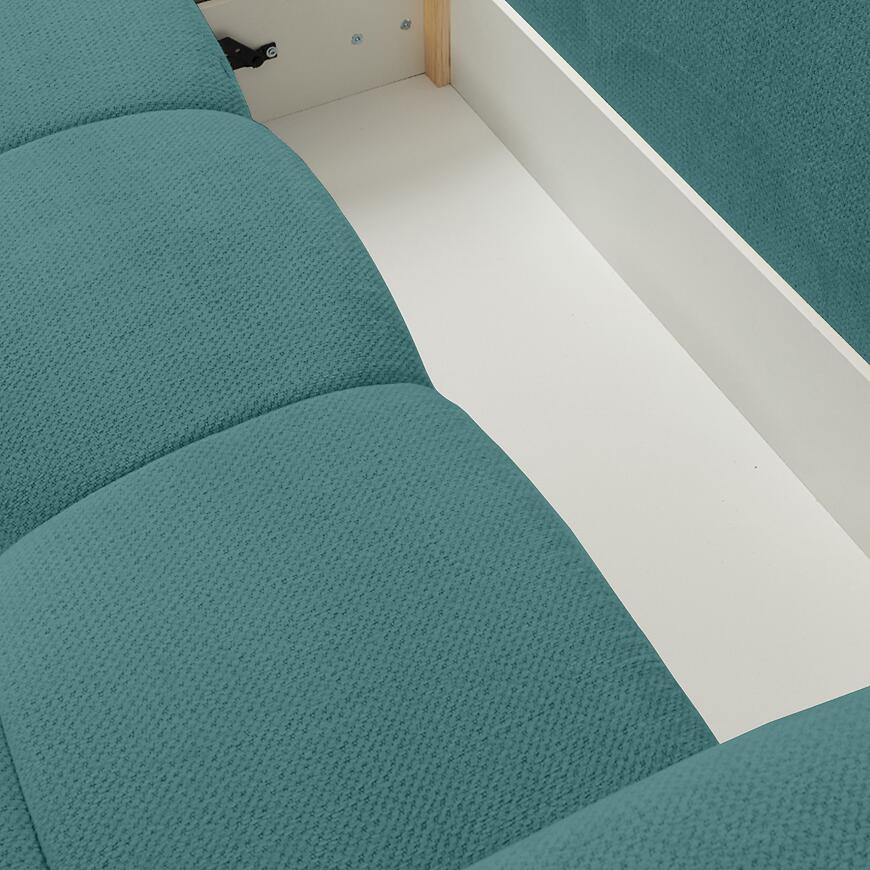 Pod siedziskiem znajduje się jeden pojemny schowek na pościel, który umożliwia wygodne przechowywanie kołder, poduszek czy koców, pomagając utrzymać porządek w salonie.
