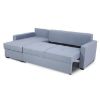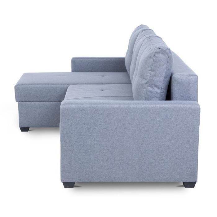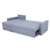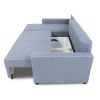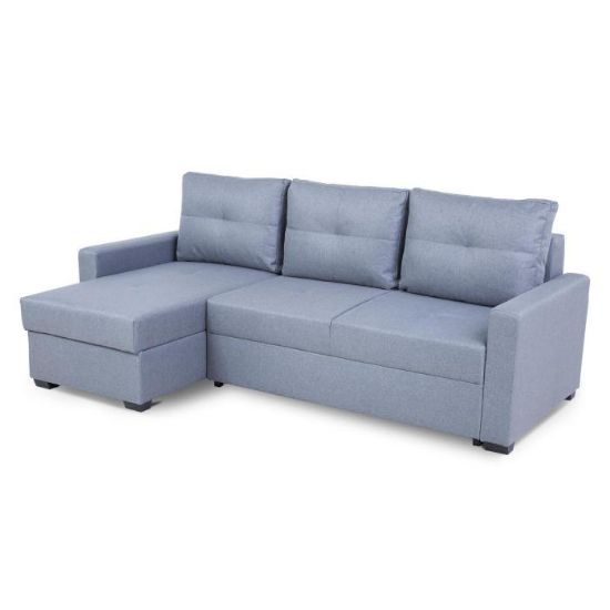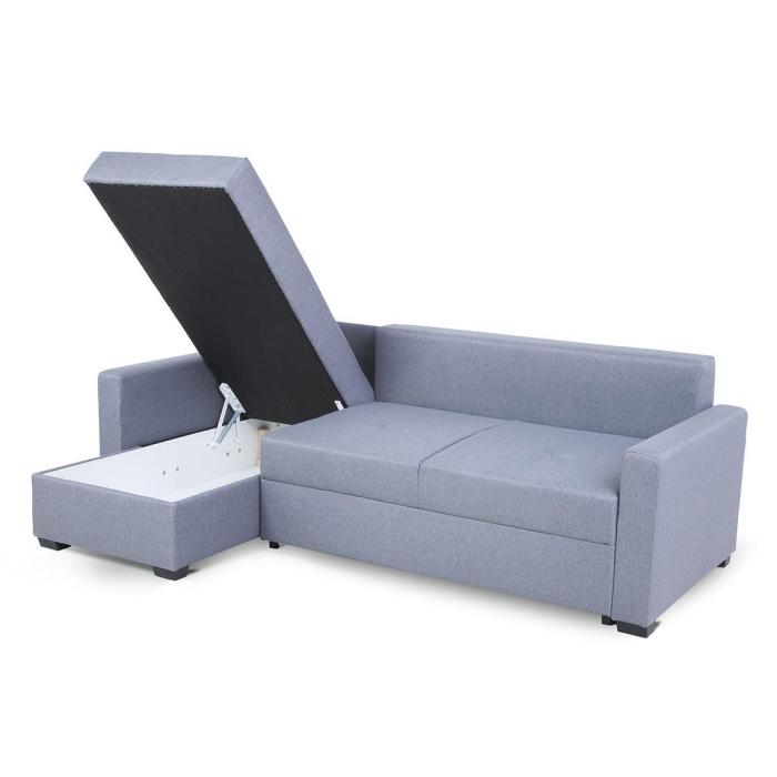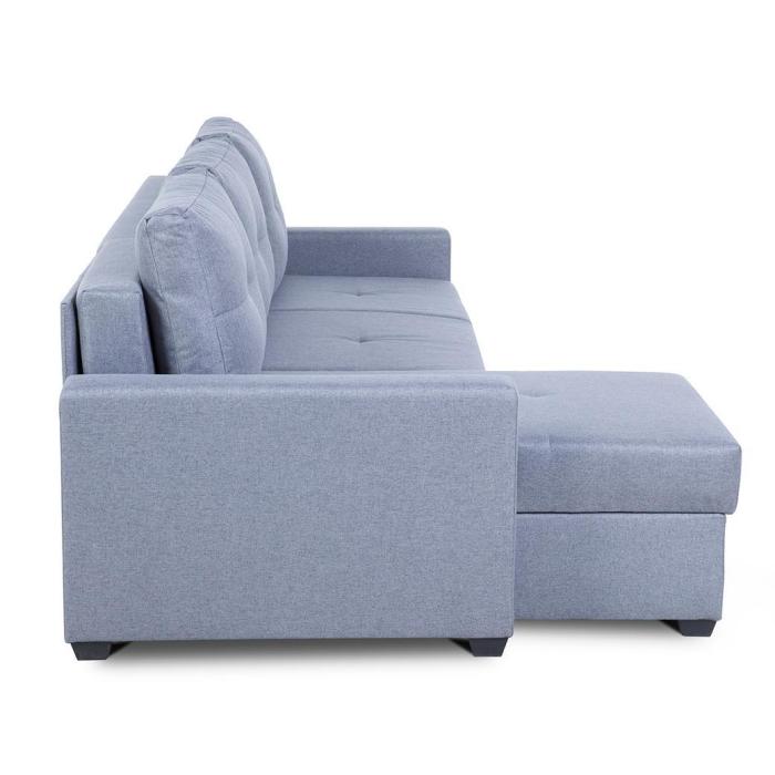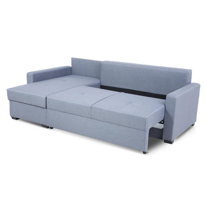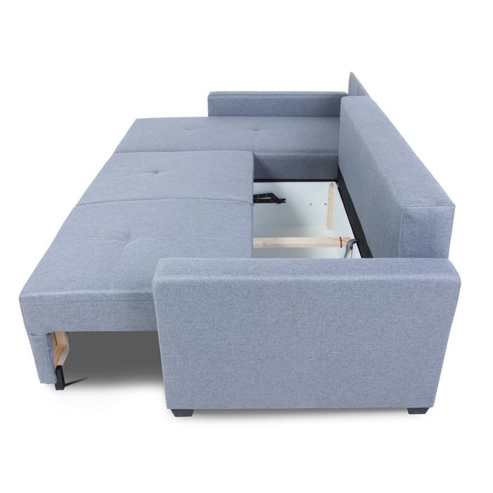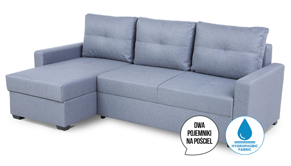 Narożnik Tobias z funkcją spania, dwoma pojemnikami na pościel oraz automatem ułatwiającym rozkładanie. Narożnik uniwersalny wykonany w tkaninie Stark, jest to tkanina hydrofobowa, która ogranicza wchłanianie rozlanych płynów. W siedzisku zastosowano sprężyny faliste, co znacznie podnosi komfort wypoczynku. Sposób rozkładania DL. Po rozłożeniu powierzchnia spania wynosi 139x202 cm. W komplecie mebla są 3 duże poduszki oparciowe. Jako element dekoracyjny zastosowano ozdobne wciągi na poduszkach oparciowych. W narożniku zamontowane zostały plastikowe nóżki w kolorze czarnym.
