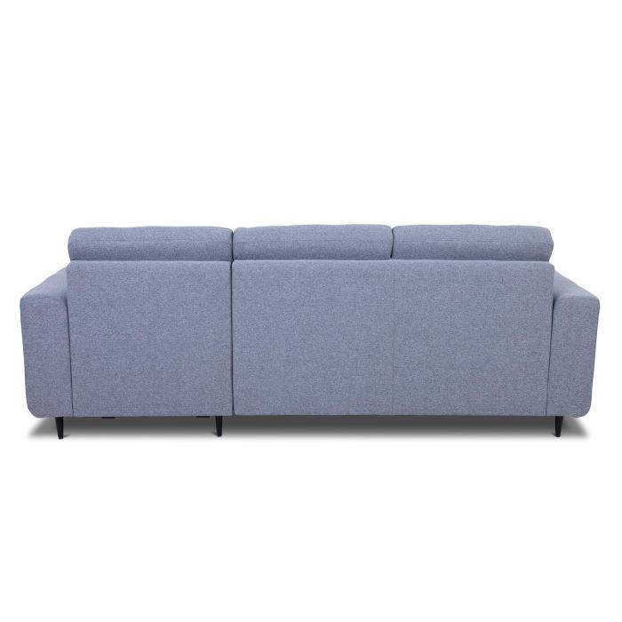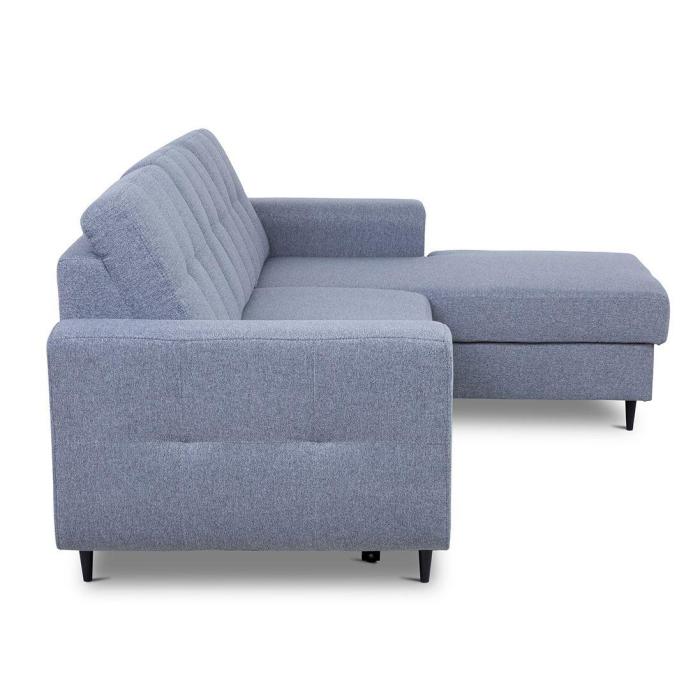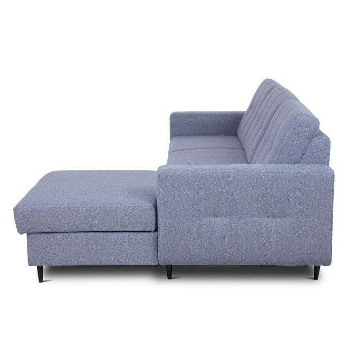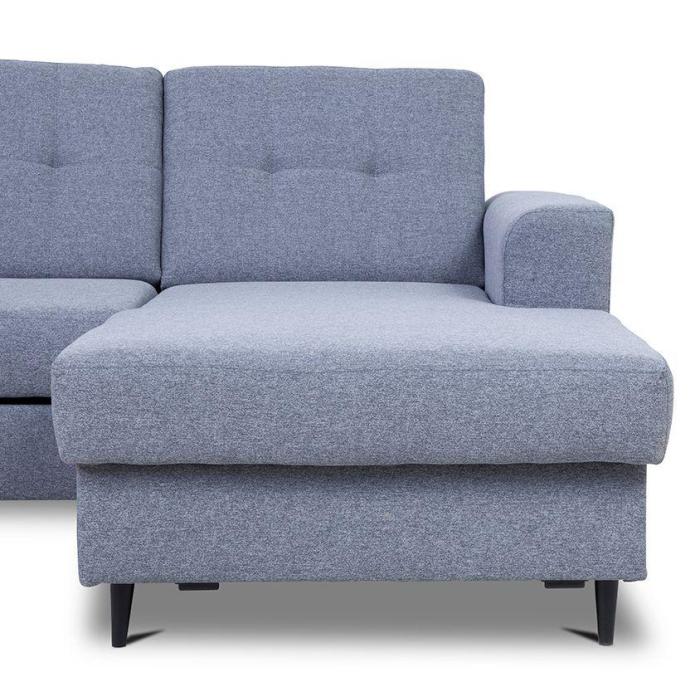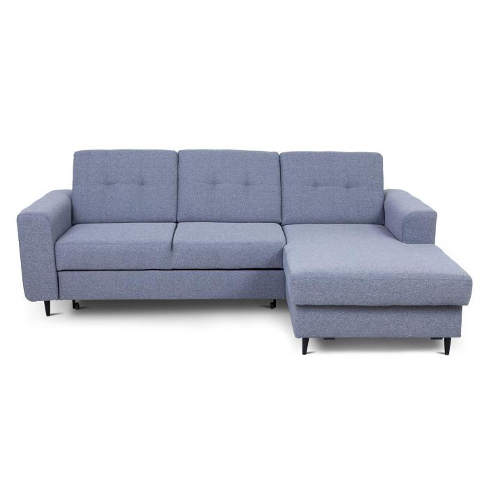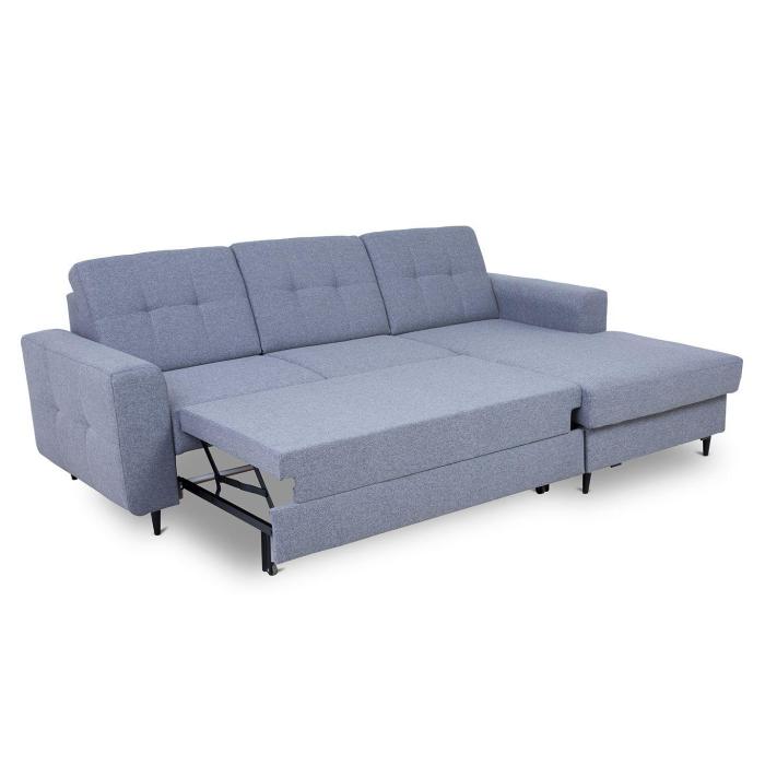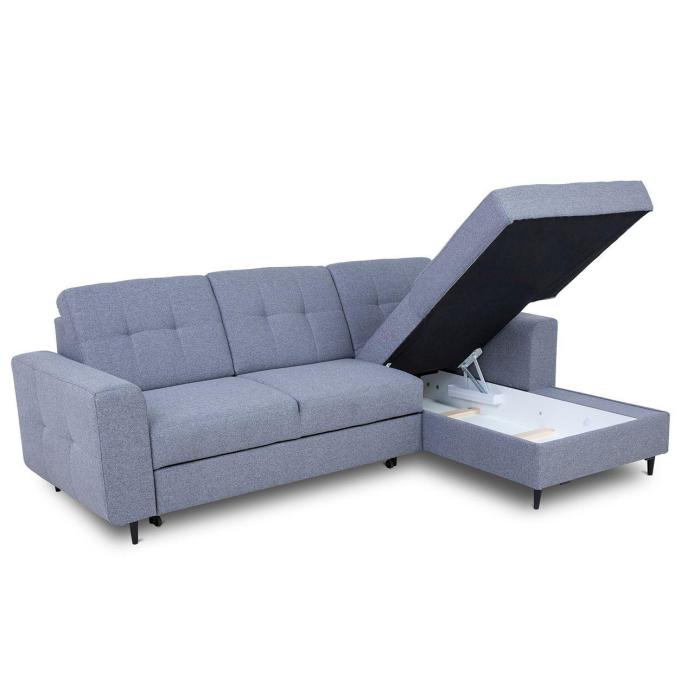 Sposób rozkładania to popularny Delfin, pomaga szybko i bezproblemowo przekształcić narożnik w przestronne łóżko. Rozkładanie typu Delfin jest najczęściej spotykane w narożnikach i kanapach, to bardzo prosty system rozkładania - spod siedziska wysuwamy wózek umieszczony na kółkach, a następnie podciągamy leżący element uzupełniający powierzchnię spania. Po rozłożeniu otrzymujemy powierzchnia spania o wymiarach 124 x 200 cm. Pościel można schować do pojemnika znajdującego się w otomanie, zapewniając ład i porządek w pomieszczeniu. Pojemnik na pościel wykonany jest z laminowanej płyty MDF.