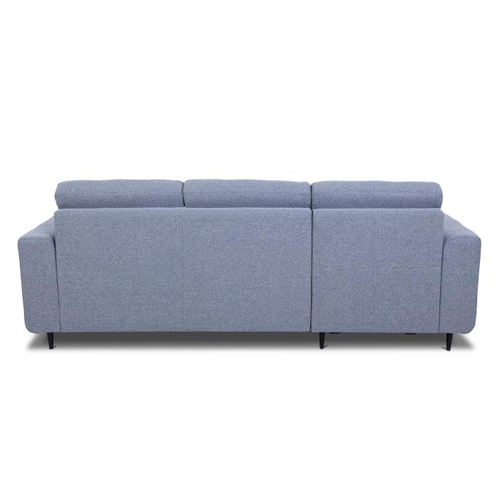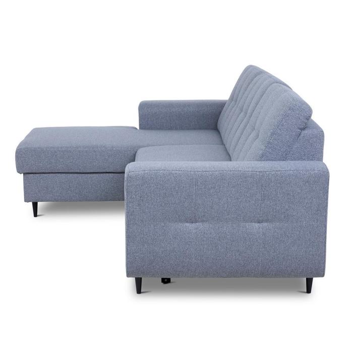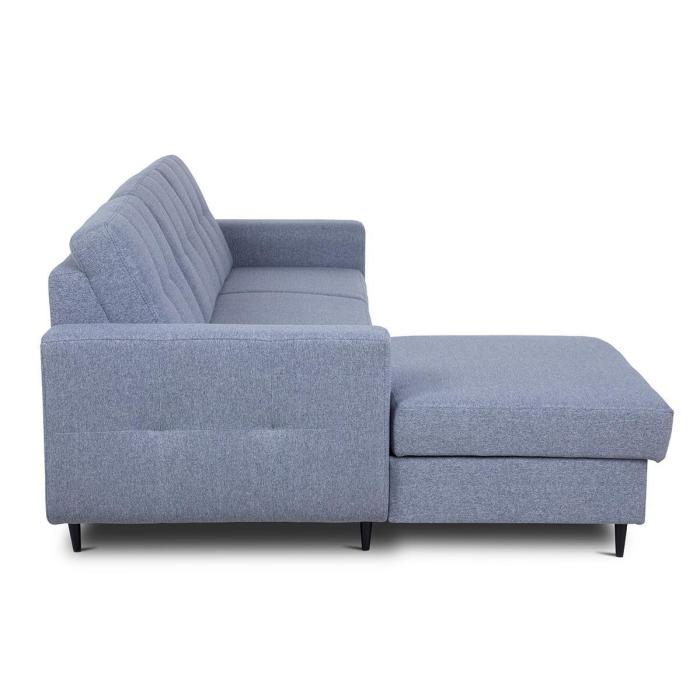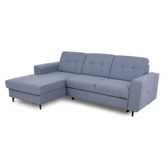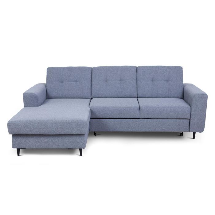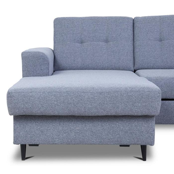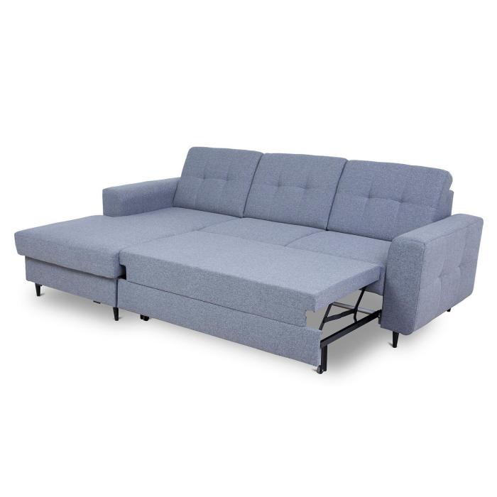 Sposób rozkładania to popularny Delfin, pomaga szybko i bezproblemowo przekształcić narożnik w przestronne łóżko. Rozkładanie typu Delfin jest najczęściej spotykane w narożnikach i kanapach, to bardzo prosty system rozkładania - spod siedziska wysuwamy wózek umieszczony na kółkach, a następnie podciągamy leżący element uzupełniający powierzchnię spania. Po rozłożeniu otrzymujemy powierzchnia spania o wymiarach 124 x 200 cm. Pościel można schować do pojemnika znajdującego się w otomanie, zapewniając ład i porządek w pomieszczeniu. Pojemnik na pościel wykonany jest z laminowanej płyty MDF.