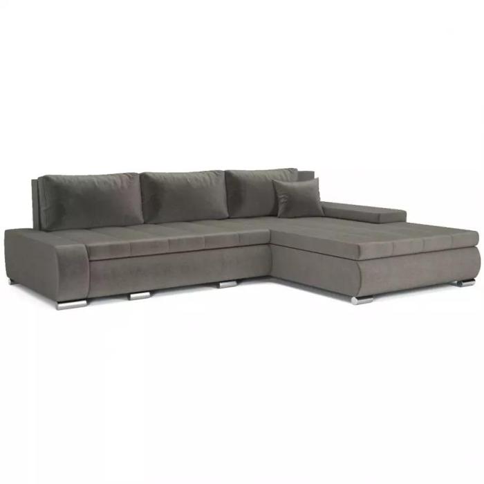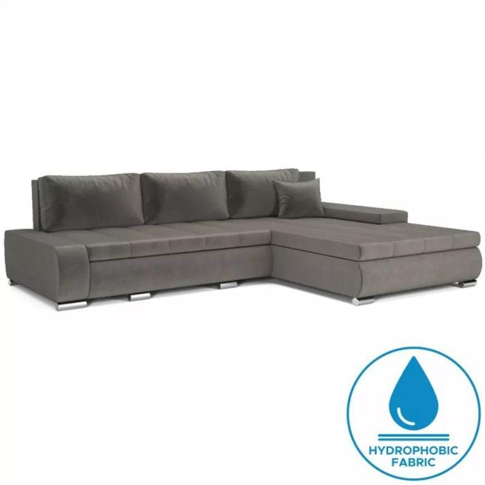 Narożnik z funkcją spania Toscania to mebel idealny dla rodzin. Wykonany w tkaninie Chill Me 7 w kolorze szarym, jest to tkanina hydrofobowa, która ogranicza wchłanianie rozlanych płynów. Kanapa narożna Toscania dostępna jest w wersji uniwersalnej. Wyposażona w jeden pojemnik na pościel. Oparcie stanowią 3 wygodne poduszki. W siedzisku narożnika zastosowano sprężynę falistą. Narożnik tapicerowany świetnie sprawdzi się salonie lub innym pomieszczeniu. Meble wypoczynkowe wyposażone w funkcję spania to doskonały wybór na długie lata.
