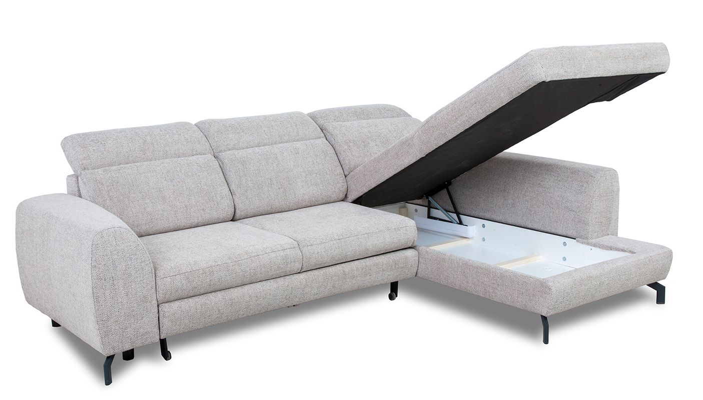 Narożnik Tybet Lux to nie tylko elegancki mebel wypoczynkowy, ale także praktyczne miejsce do spania. Dzięki mechanizmowi rozkładania typu „wózek”, w szybki sposób można uzyskać powierzchnię spania o wymiarach 128x211 cm. Dodatkowo, wbudowany pojemnik na pościel ułatwia przechowywanie kołder i poduszek, pomagając utrzymać porządek w salonie.