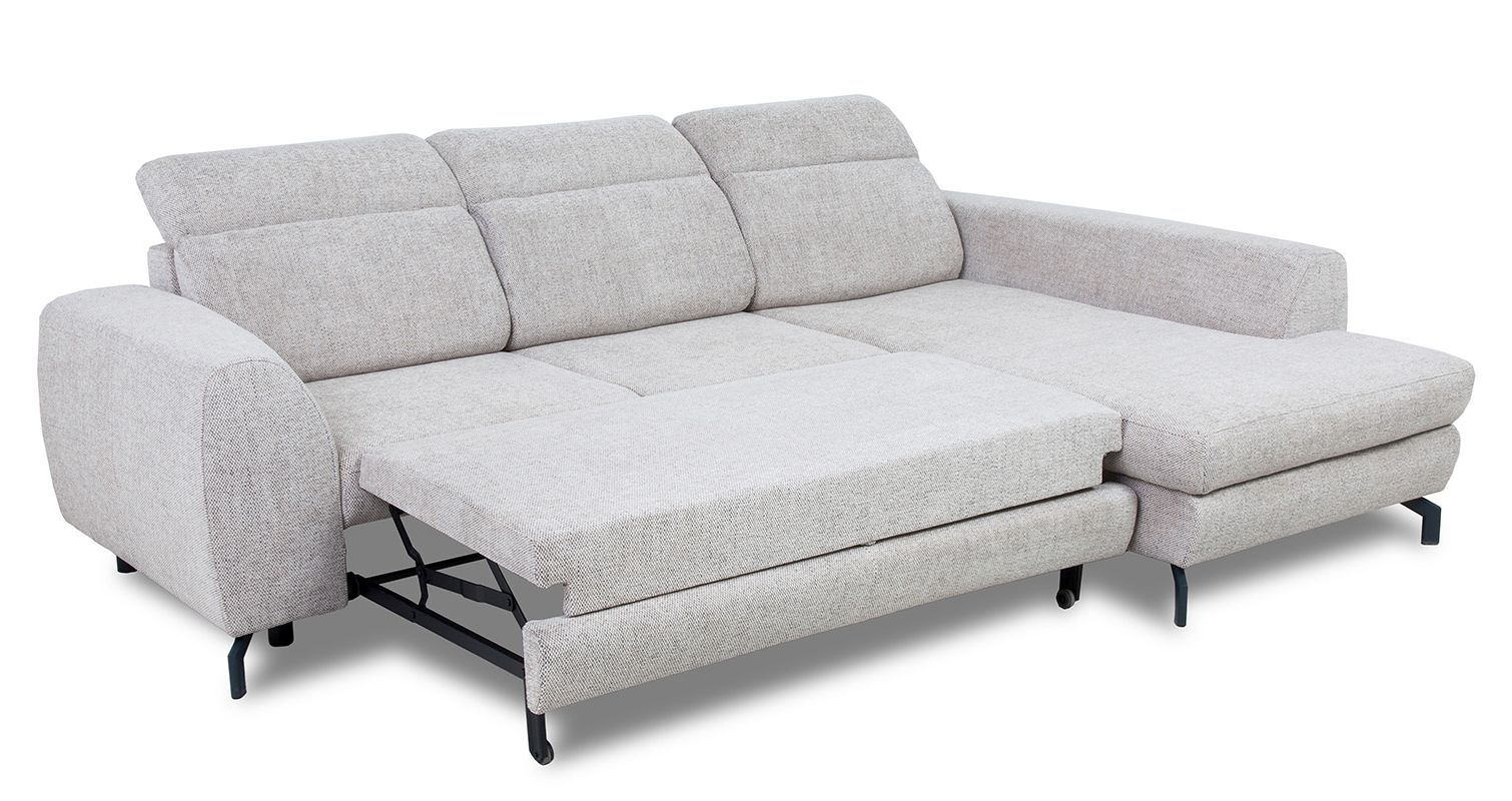 Narożnik Tybet Lux to nie tylko elegancki mebel wypoczynkowy, ale także praktyczne miejsce do spania. Dzięki mechanizmowi rozkładania typu „wózek”, w szybki sposób można uzyskać powierzchnię spania o wymiarach 128x211 cm. Dodatkowo, wbudowany pojemnik na pościel ułatwia przechowywanie kołder i poduszek, pomagając utrzymać porządek w salonie.