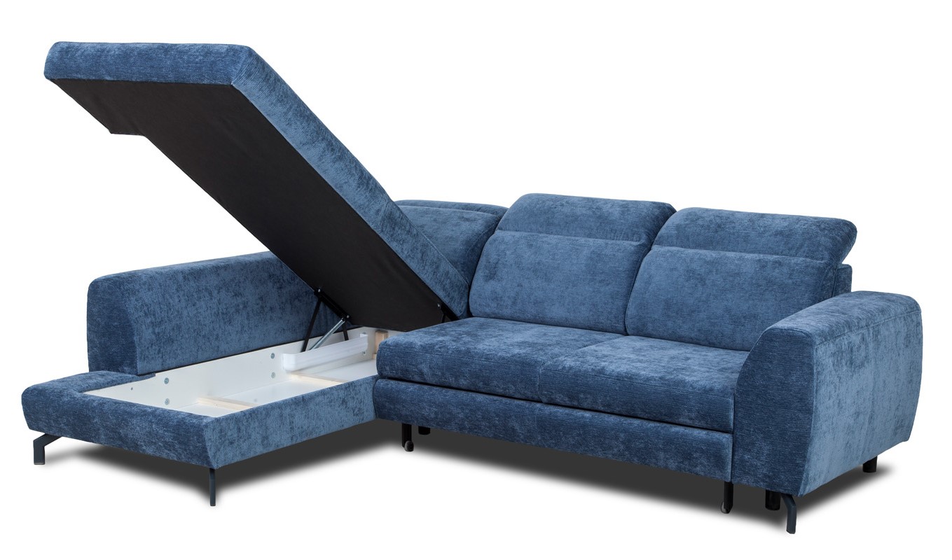 W konstrukcji mebla znajduje się pojemnik na pościel, który ułatwia utrzymanie porządku w salonie. To praktyczna przestrzeń do przechowywania kołder, poduszek, koców lub rzadziej używanych tekstyliów. Pojemnik jest łatwo dostępny, a zastosowany w narożniku automat wspomagający sprawia, że otwieranie i zamykanie odbywa się lekko i intuicyjnie.
