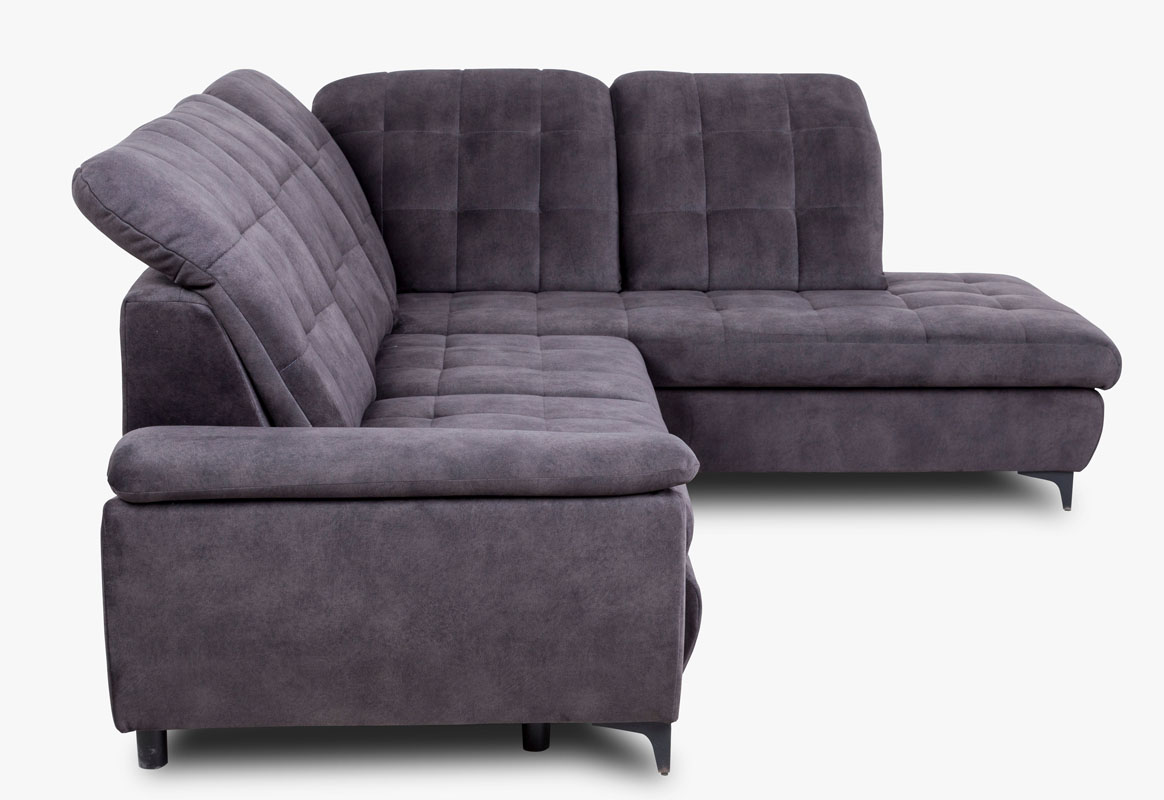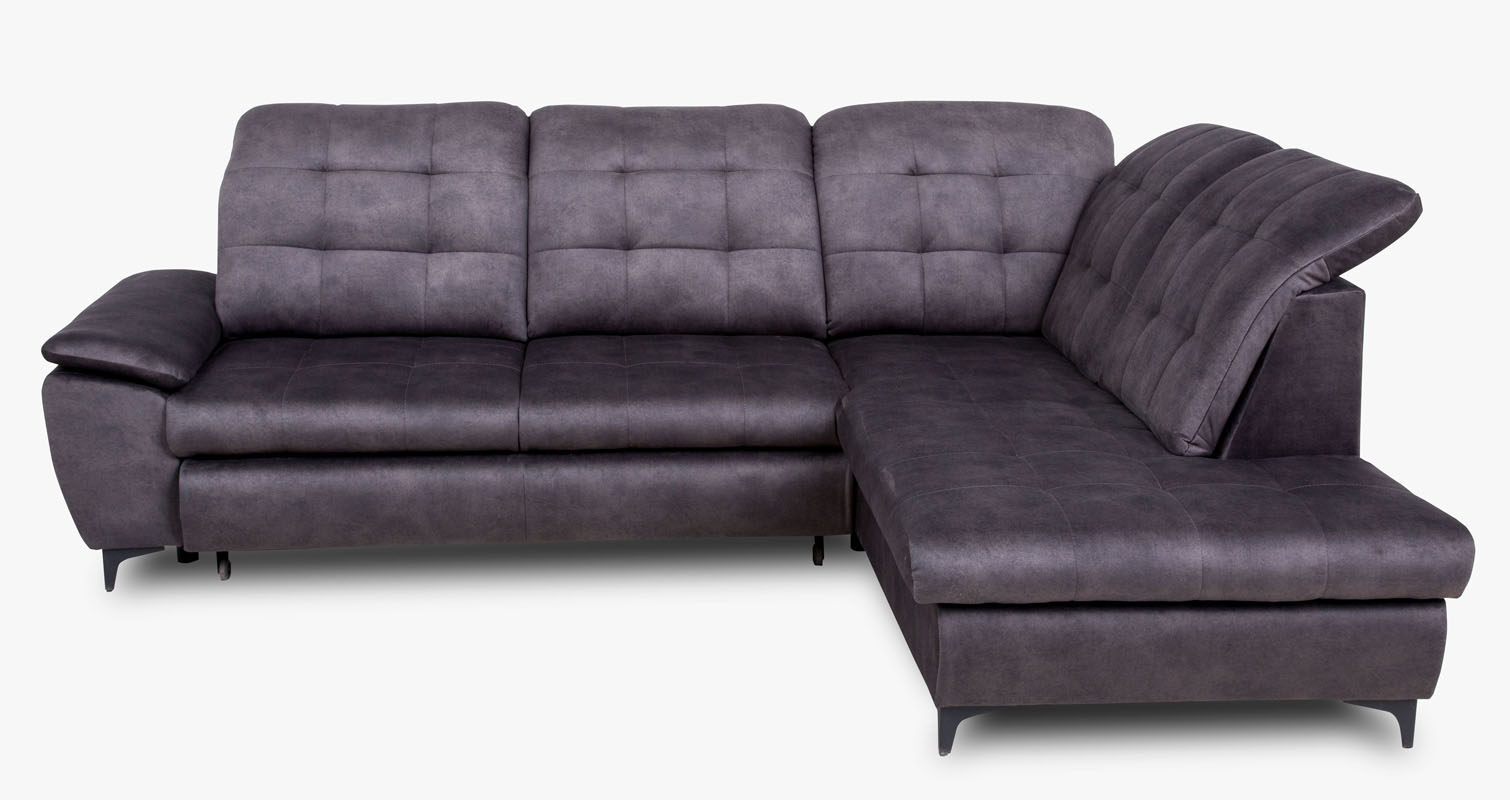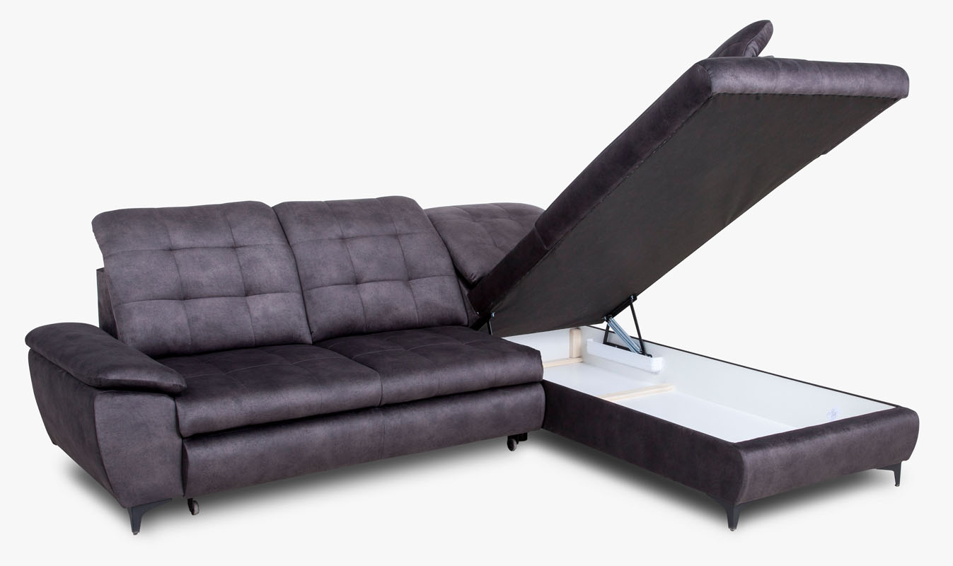 Narożnik Verto z funkcją spania oraz pojemnikiem na pościel. Narożnik posiada stałe poduchy oparciowe z regulowanymi zagłówkami. Model wykonany w tkaninie Salvador w kolorze grafitowym. Elementem ozdobnym są pikowania na siedzisku oraz oparciu narożnika. W siedzisku  mebla zastosowano sprężyny faliste oraz piankę T-25 w oparciu pianka T-28. Narożnik dostępny w wersji prawej lub lewej. Sposób rozkładania wózek. Po rozłożeniu otrzymujemy  powierzchnię spania o wymiarach 125x195 cm. W narożniku zastosowano metalowe nóżki w kolorze czarnym.