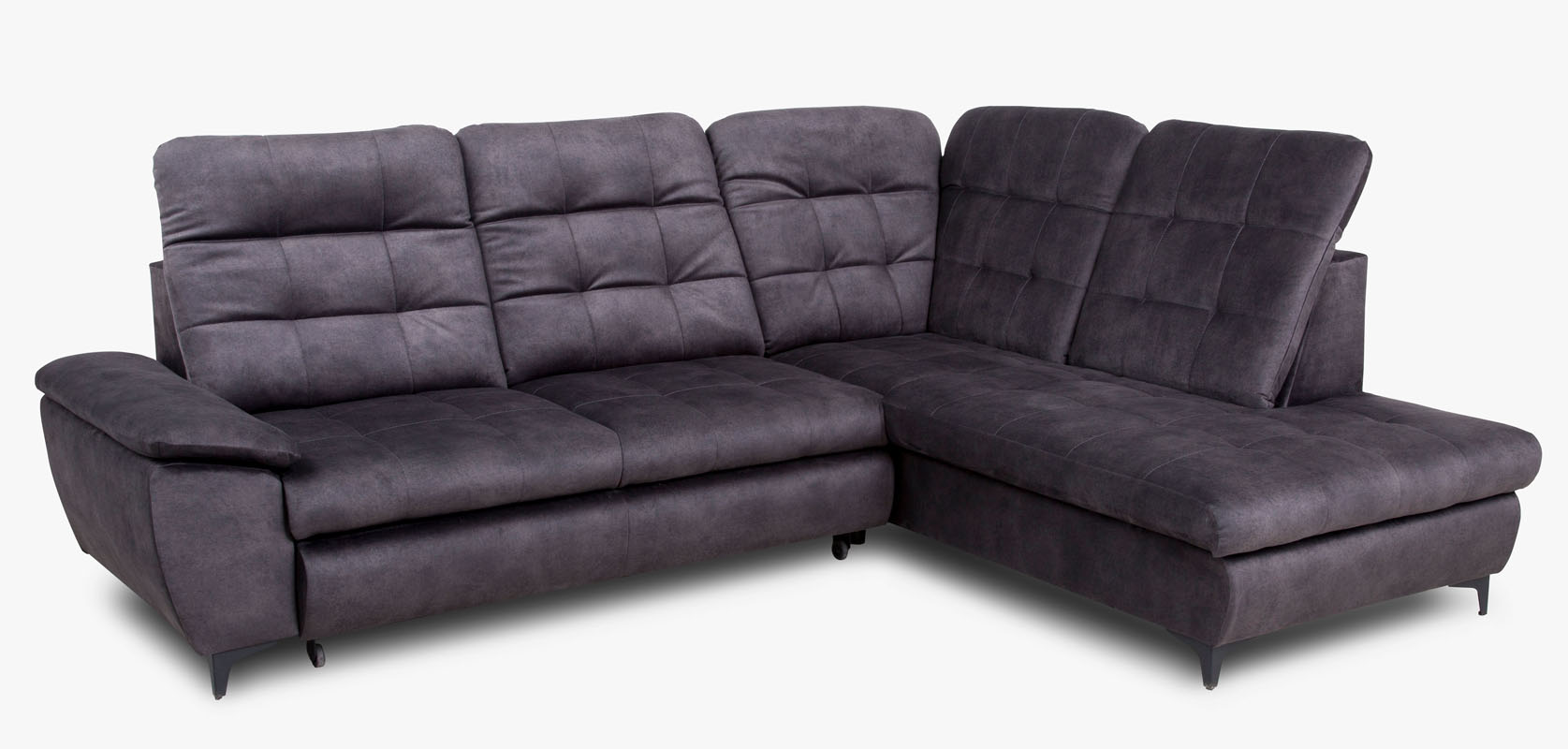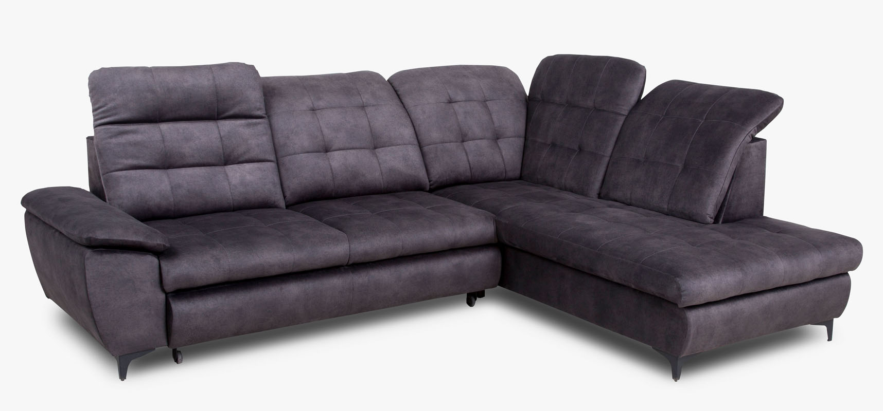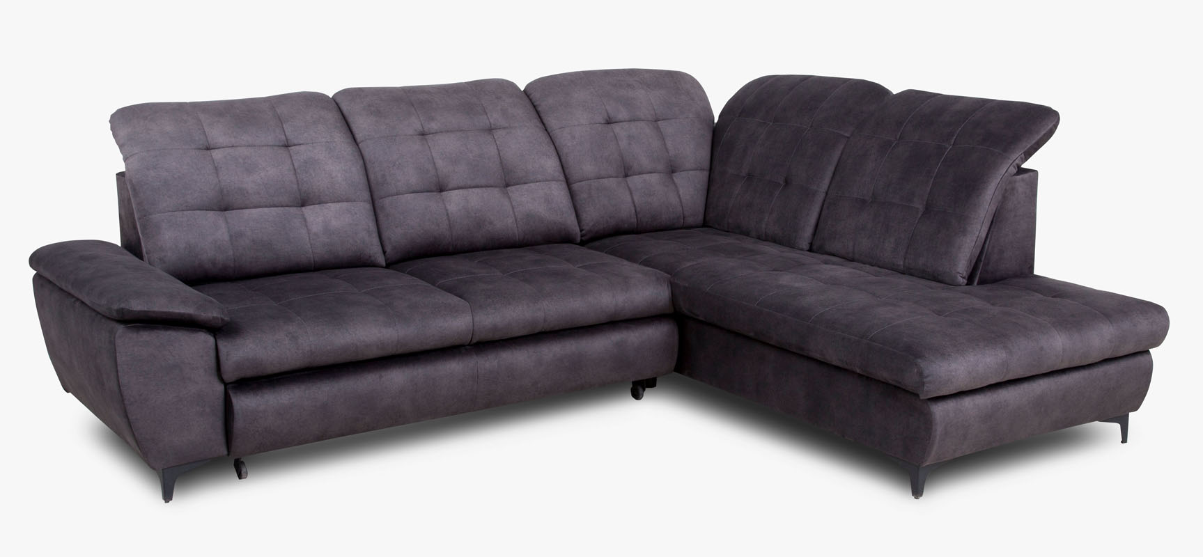 Narożnik Verto z funkcją spania oraz pojemnikiem na pościel. Narożnik posiada stałe poduchy oparciowe z regulowanymi zagłówkami. Model wykonany w tkaninie Salvador w kolorze grafitowym. Elementem ozdobnym są pikowania na siedzisku oraz oparciu narożnika. W siedzisku  mebla zastosowano sprężyny faliste oraz piankę T-25 w oparciu pianka T-28. Narożnik dostępny w wersji prawej lub lewej. Sposób rozkładania wózek. Po rozłożeniu otrzymujemy  powierzchnię spania o wymiarach 125x195 cm. W narożniku zastosowano metalowe nóżki w kolorze czarnym.