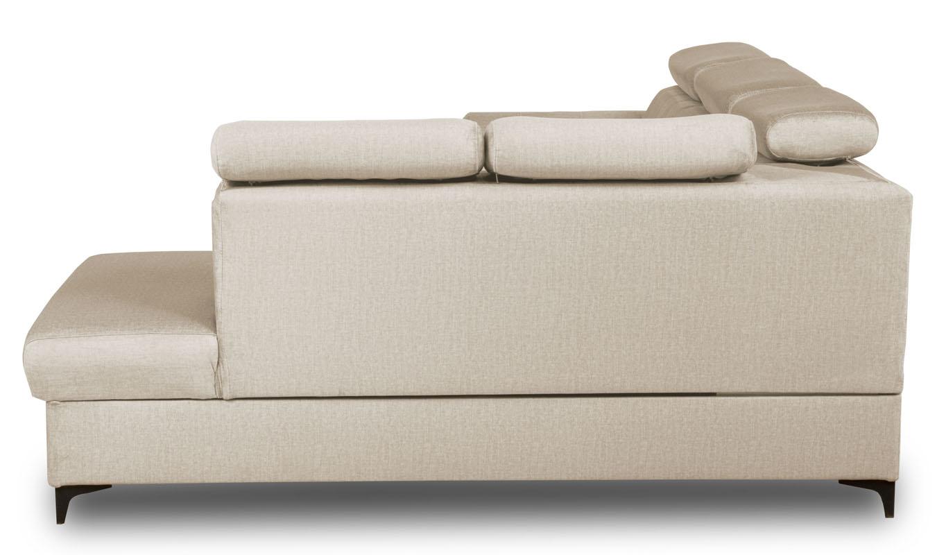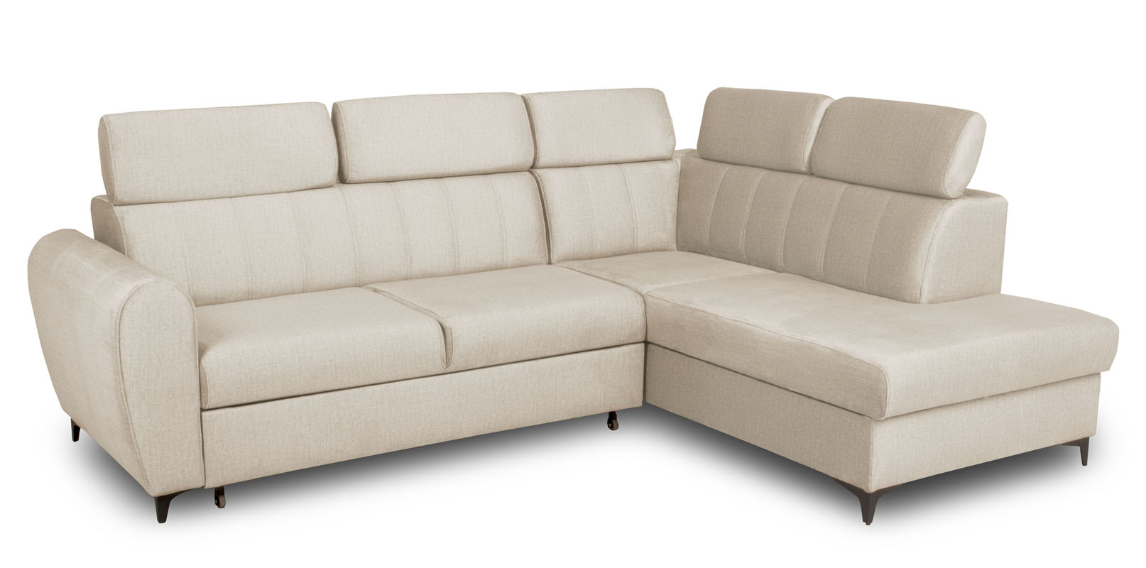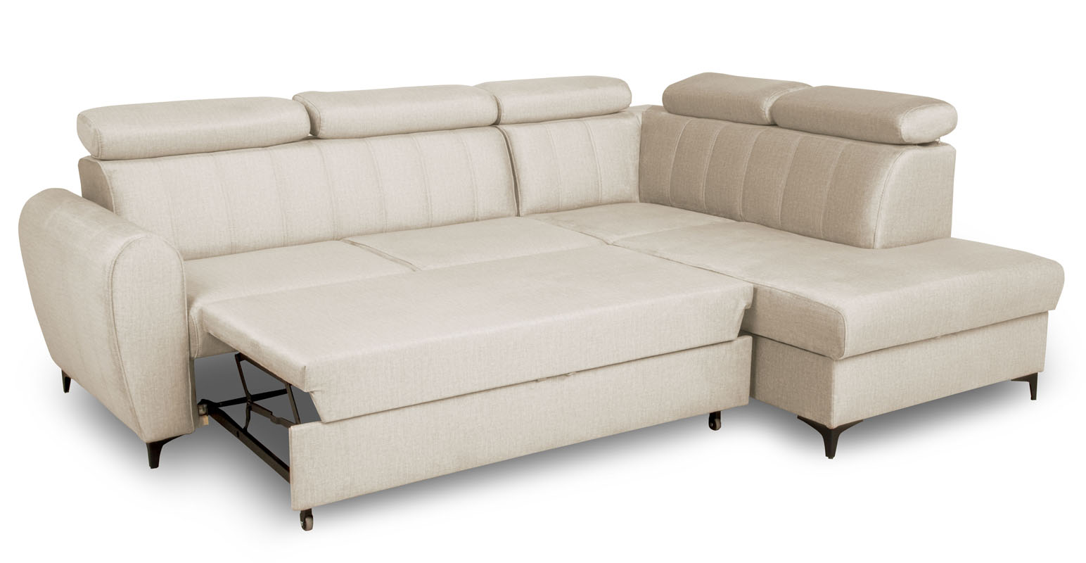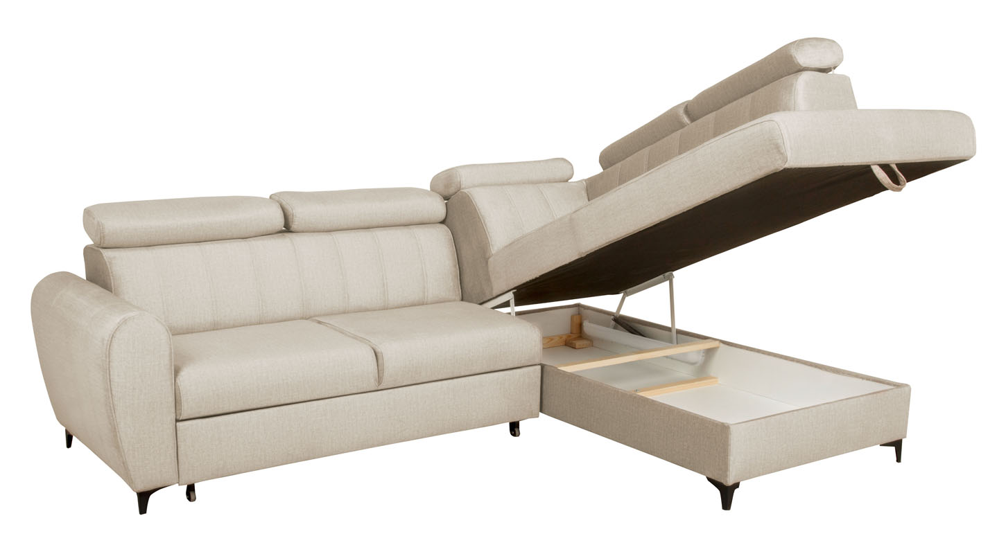 Praktycznym dodatkiem jest pojemnik na pościel, który ułatwia przechowywanie koców, poduszek i innych akcesoriów. Czarne metalowe nóżki nadają konstrukcji lekkości i podkreślają nowoczesny design narożnika.