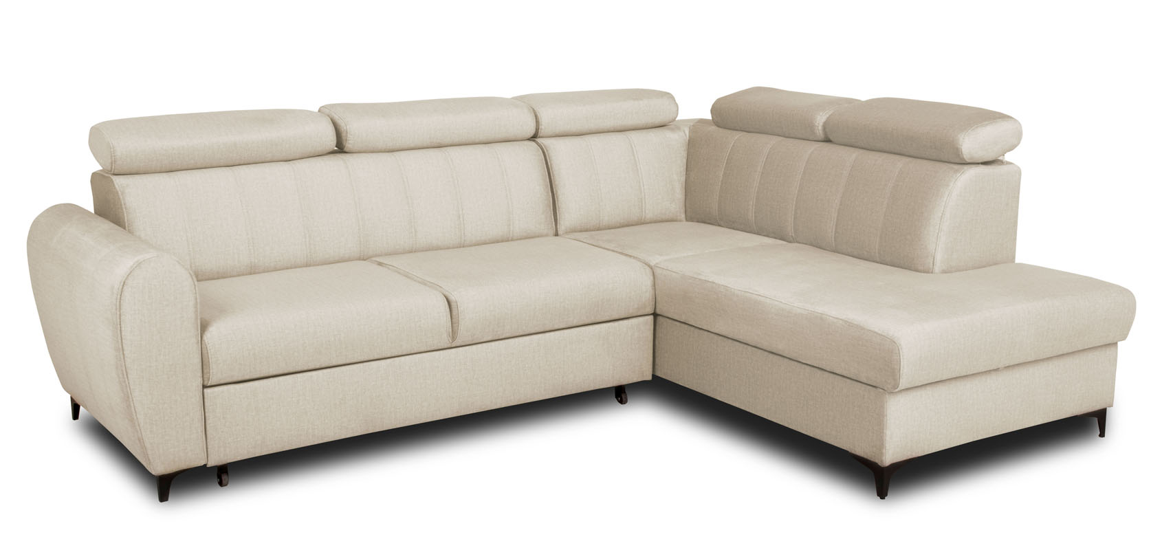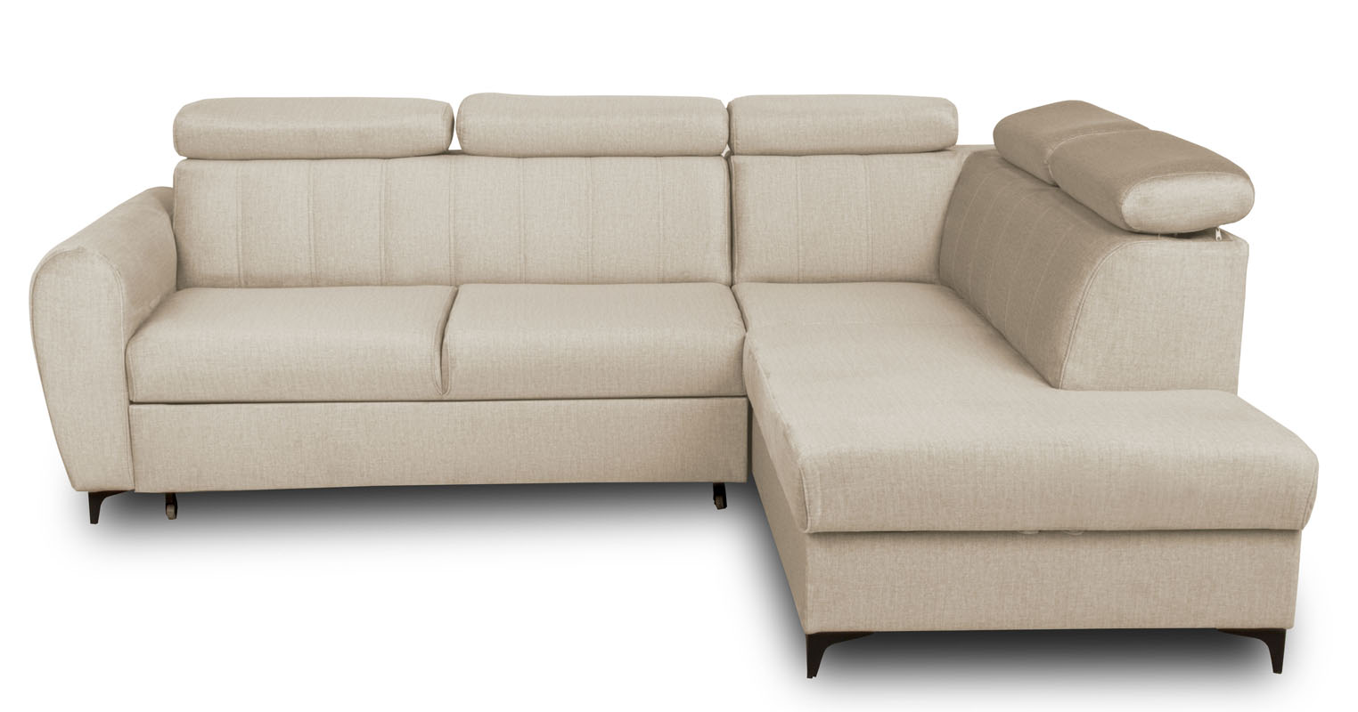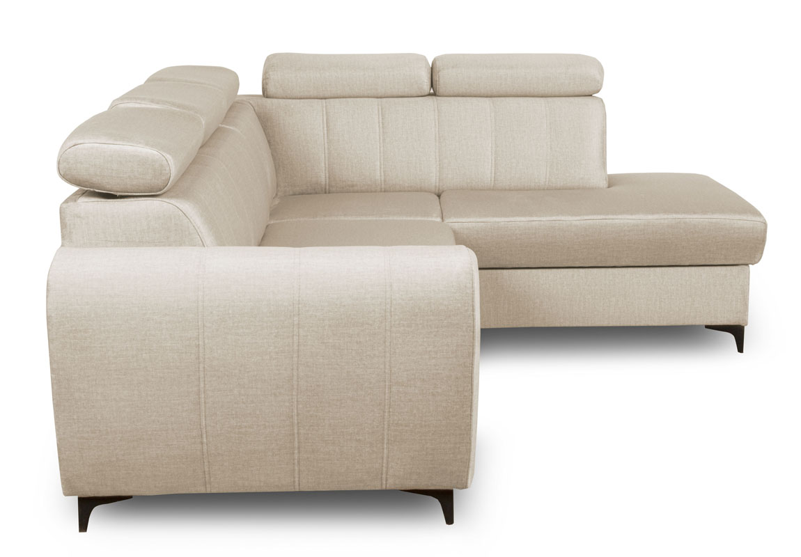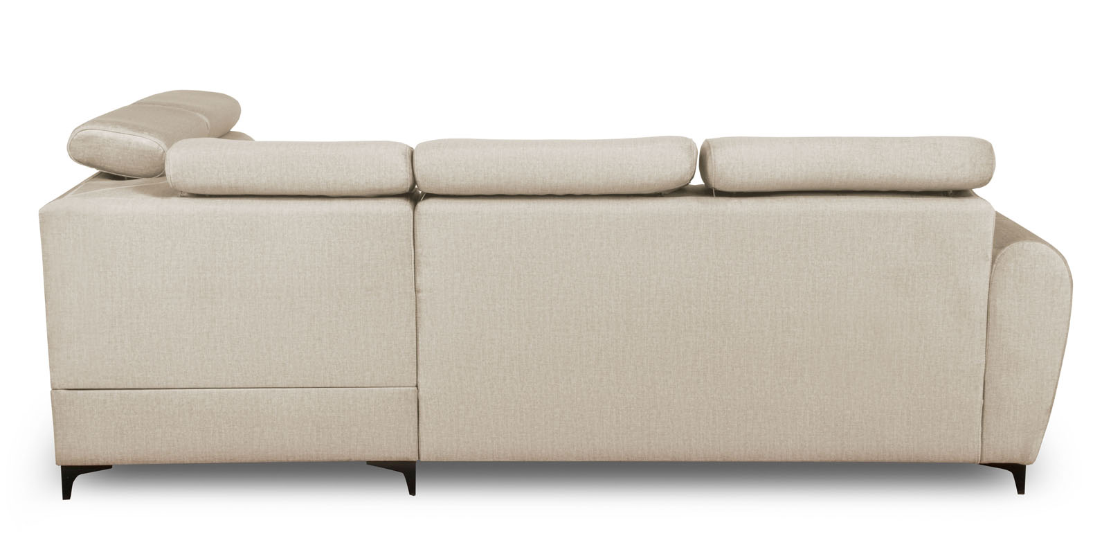 Praktycznym dodatkiem jest pojemnik na pościel, który ułatwia przechowywanie koców, poduszek i innych akcesoriów. Czarne metalowe nóżki nadają konstrukcji lekkości i podkreślają nowoczesny design narożnika.