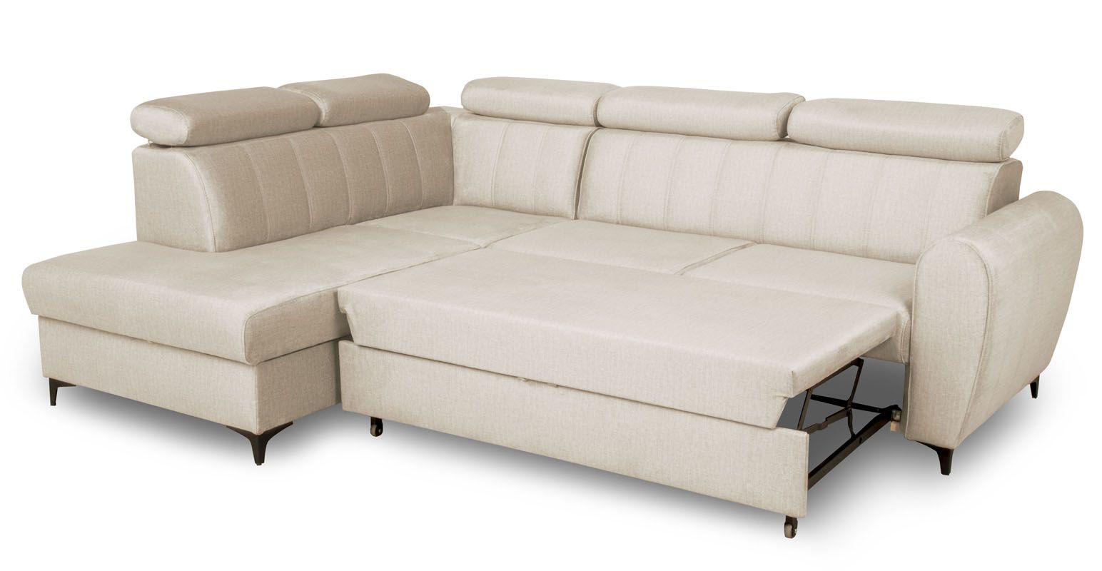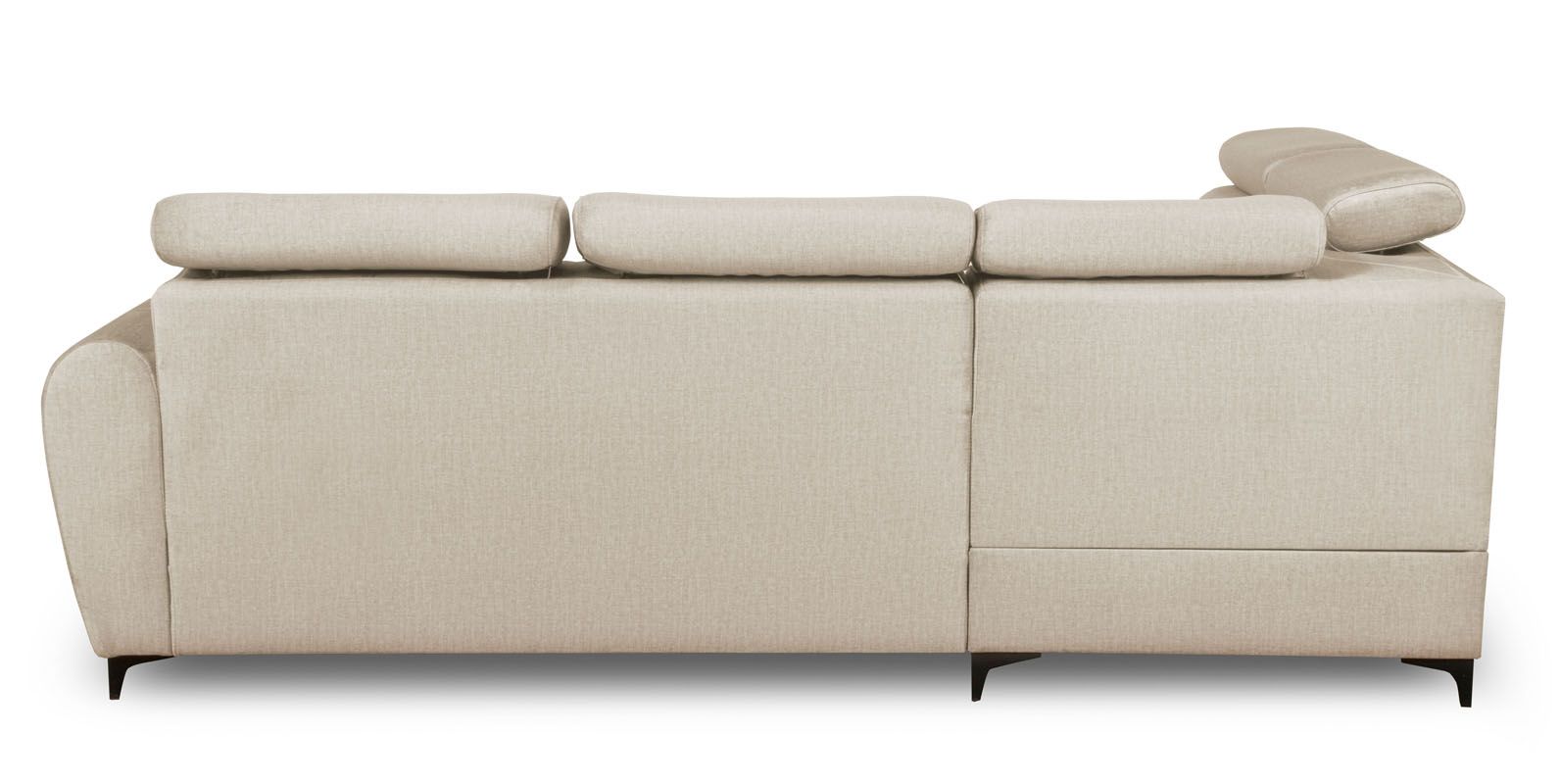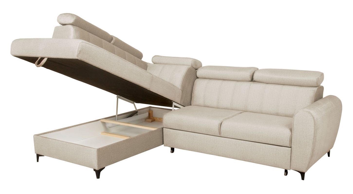 Praktycznym dodatkiem jest pojemnik na pościel, który ułatwia przechowywanie koców, poduszek i innych akcesoriów. Czarne metalowe nóżki nadają konstrukcji lekkości i podkreślają nowoczesny design narożnika.