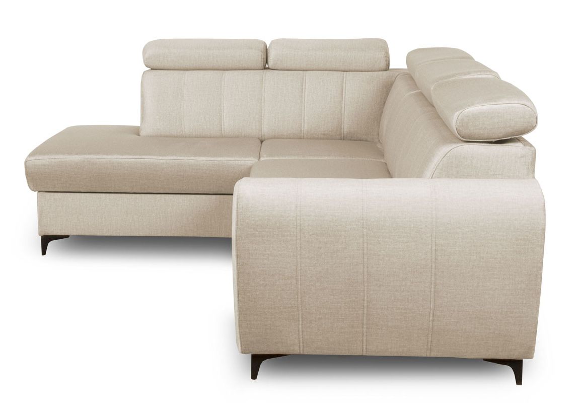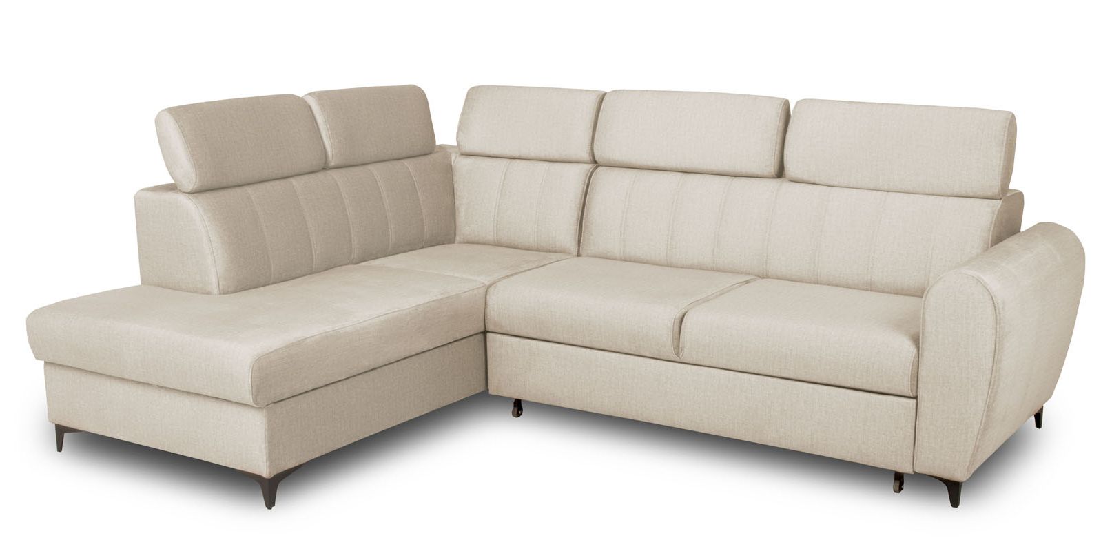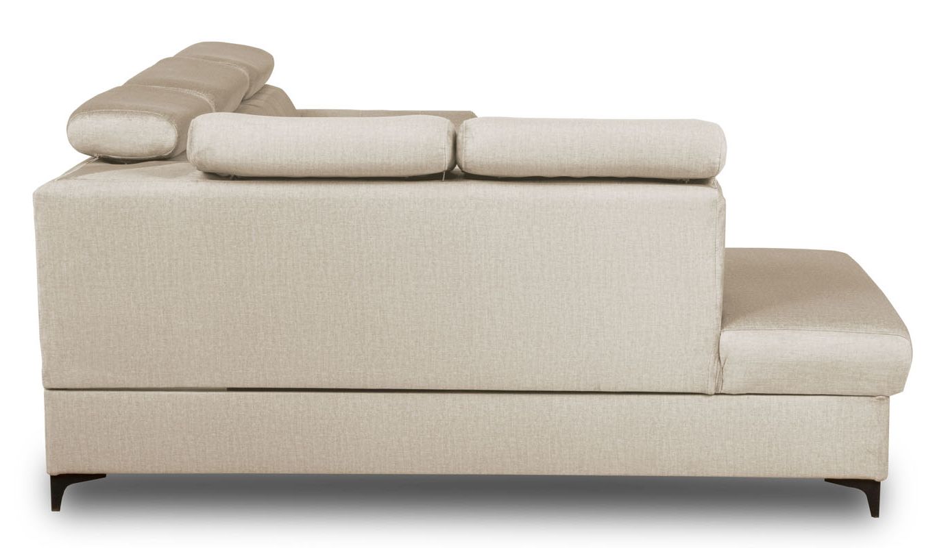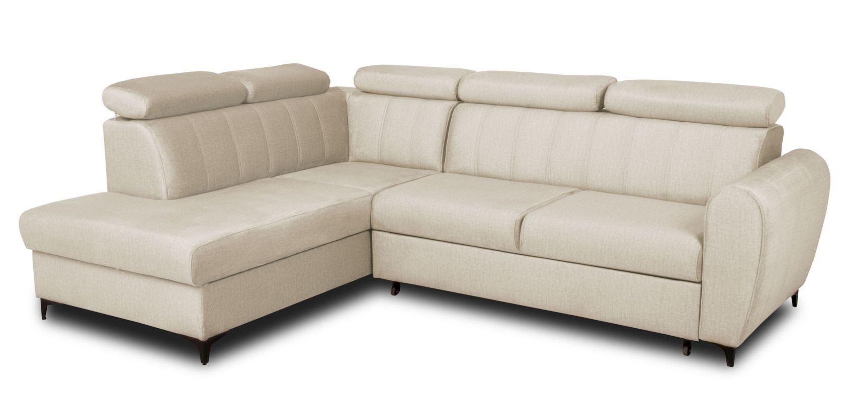 Praktycznym dodatkiem jest pojemnik na pościel, który ułatwia przechowywanie koców, poduszek i innych akcesoriów. Czarne metalowe nóżki nadają konstrukcji lekkości i podkreślają nowoczesny design narożnika.
