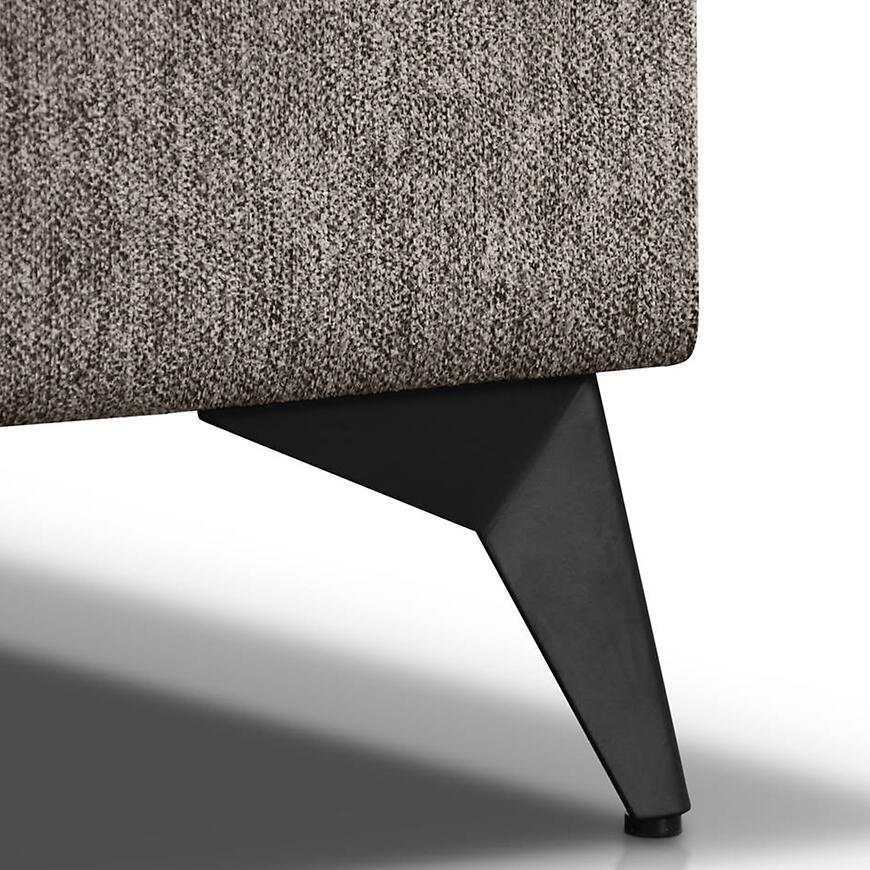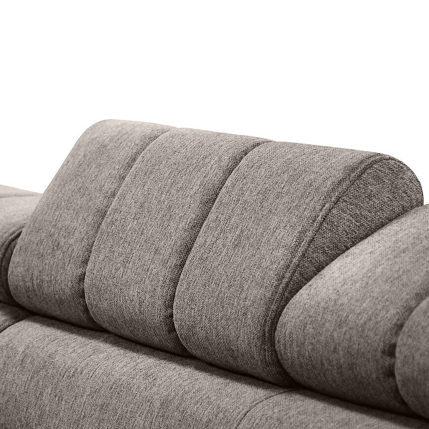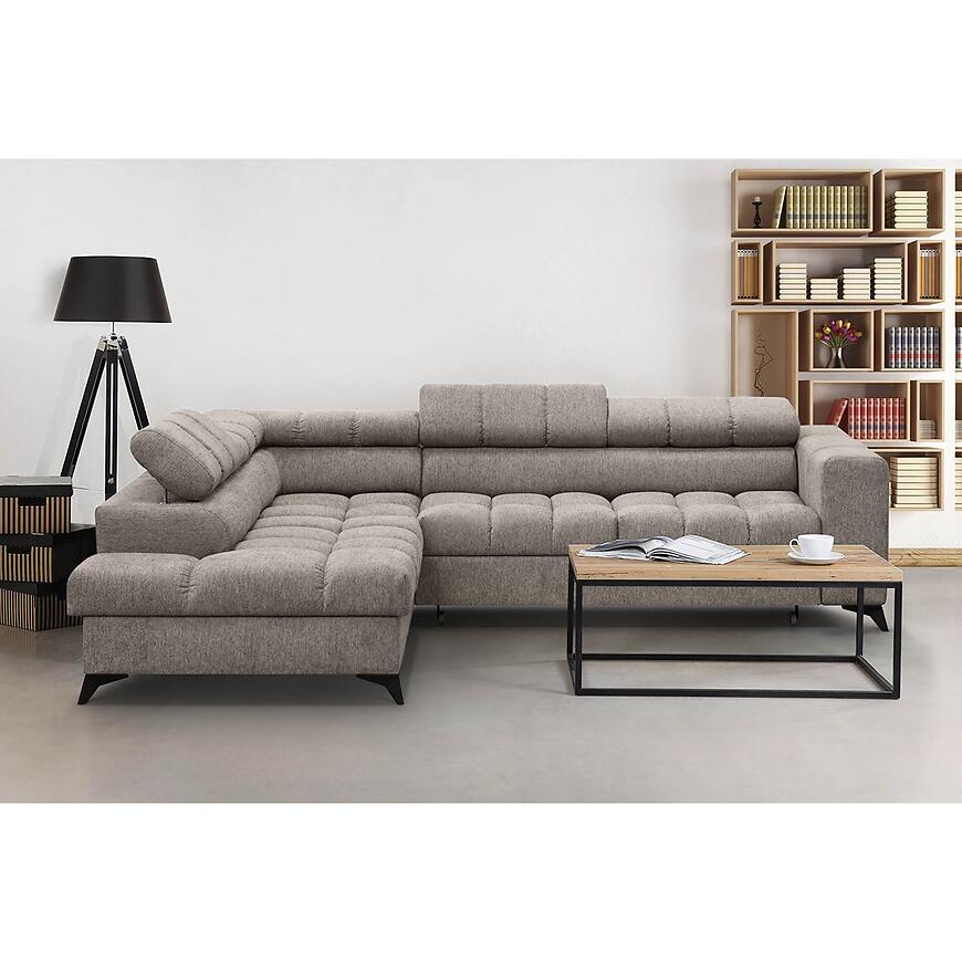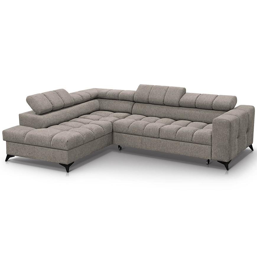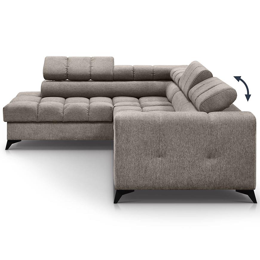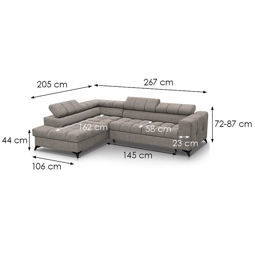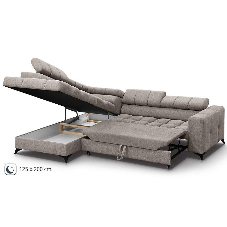 Narożnik Volf L Polaris 03 w kolorze brązowym to nowoczesny narożnik w kształcie litery L o wymiarach 267x205 cm. Wyposażony jest w funkcję spania z powierzchnią 200x125 cm i mechanizm rozkładania typu „delfin”. Siedzisko wypełnione sprężyną falistą ma wysokość 44 cm i głębokość 58 cm. Narożnik posiada jeden pojemnik na pościel oraz regulowany zagłówek. Stoi na czarnych nogach i wymaga samodzielnego montażu. W zestawie nie ma poduszek ani pufy.