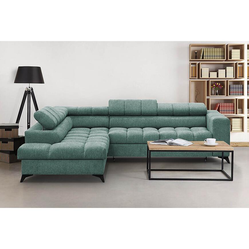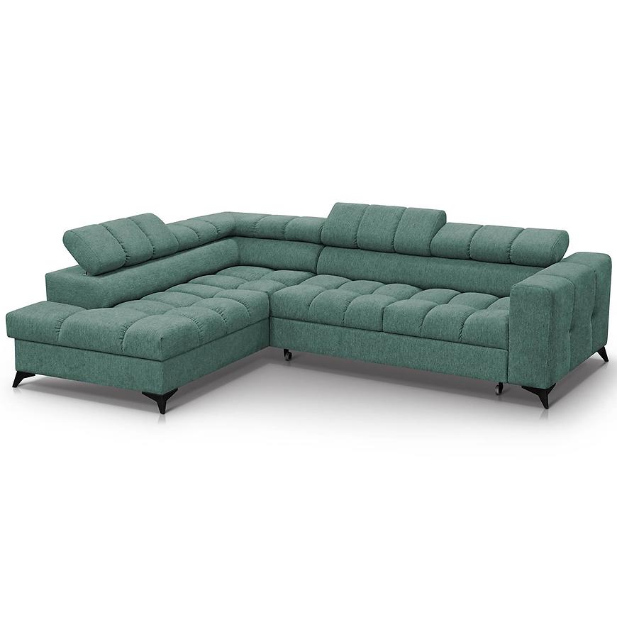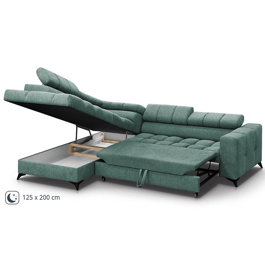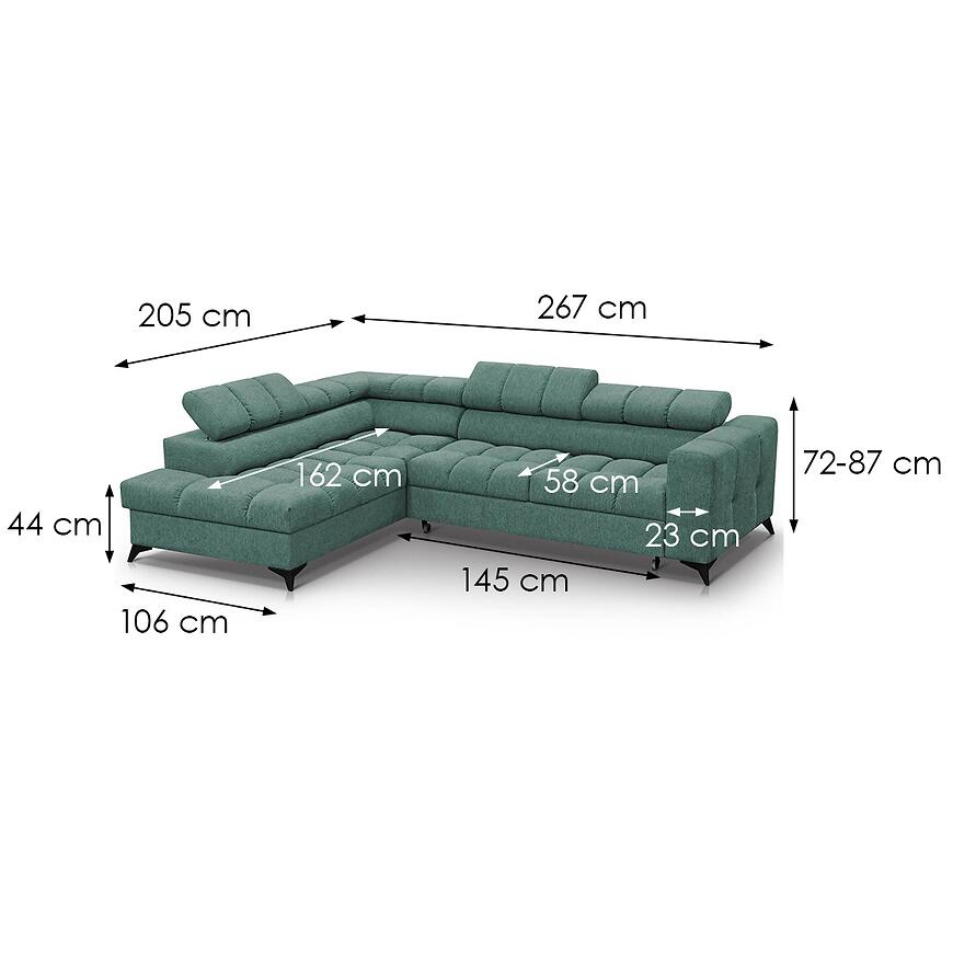 Narożnik Volf L Polaris 14 w kolorze zielonym to nowoczesny narożnik w kształcie litery L o wymiarach 267x205 cm. Posiada funkcję spania z powierzchnią 200x125 cm i mechanizm rozkładania typu „delfin”. Siedzisko wypełnione jest sprężyną falistą, ma wysokość 44 cm i głębokość 58 cm. Narożnik wyposażony jest w jeden pojemnik na pościel oraz regulowany zagłówek. Stoi na czarnych nogach i wymaga samodzielnego montażu. W zestawie nie ma pufy ani poduszek.