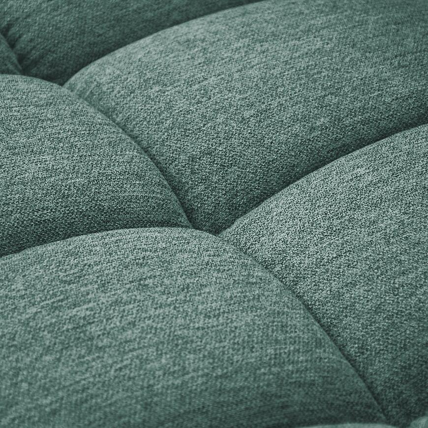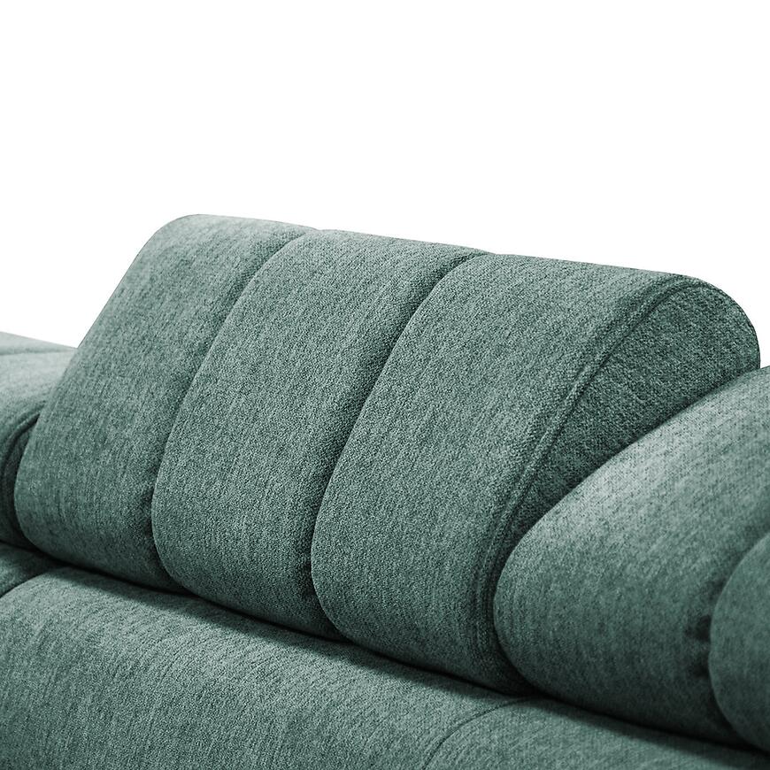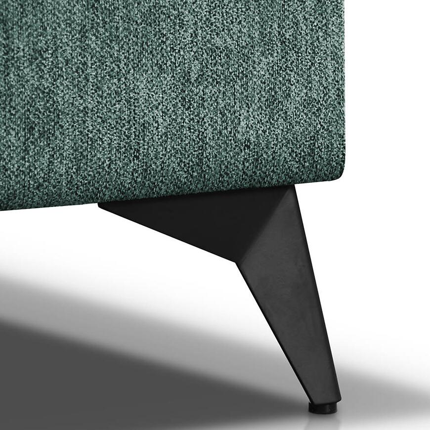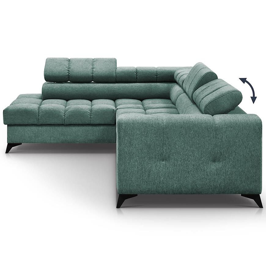 Narożnik Volf L Polaris 14 w kolorze zielonym to nowoczesny narożnik w kształcie litery L o wymiarach 267x205 cm. Posiada funkcję spania z powierzchnią 200x125 cm i mechanizm rozkładania typu „delfin”. Siedzisko wypełnione jest sprężyną falistą, ma wysokość 44 cm i głębokość 58 cm. Narożnik wyposażony jest w jeden pojemnik na pościel oraz regulowany zagłówek. Stoi na czarnych nogach i wymaga samodzielnego montażu. W zestawie nie ma pufy ani poduszek.