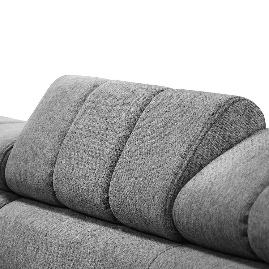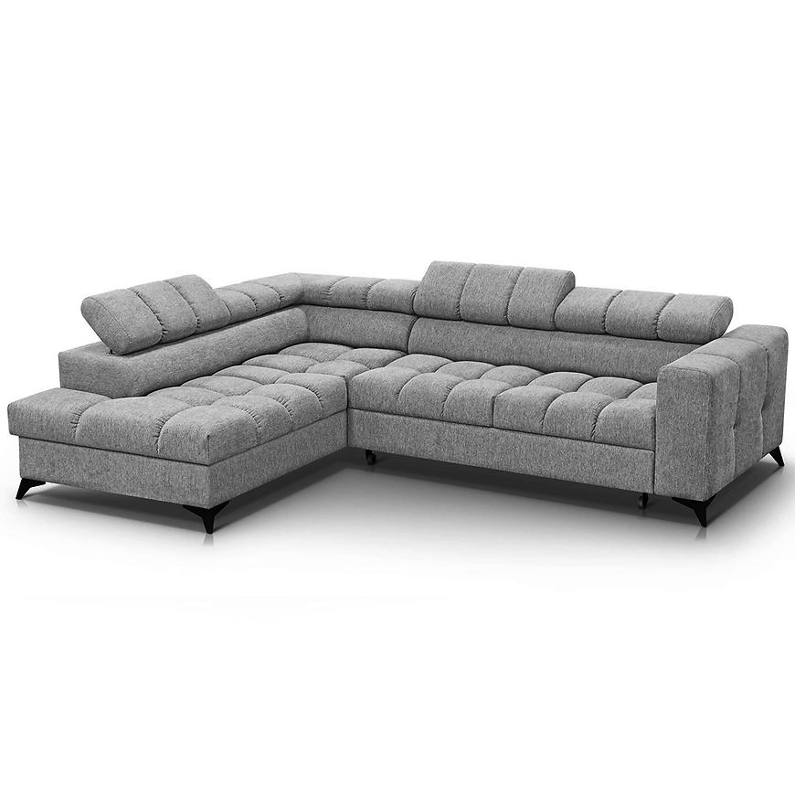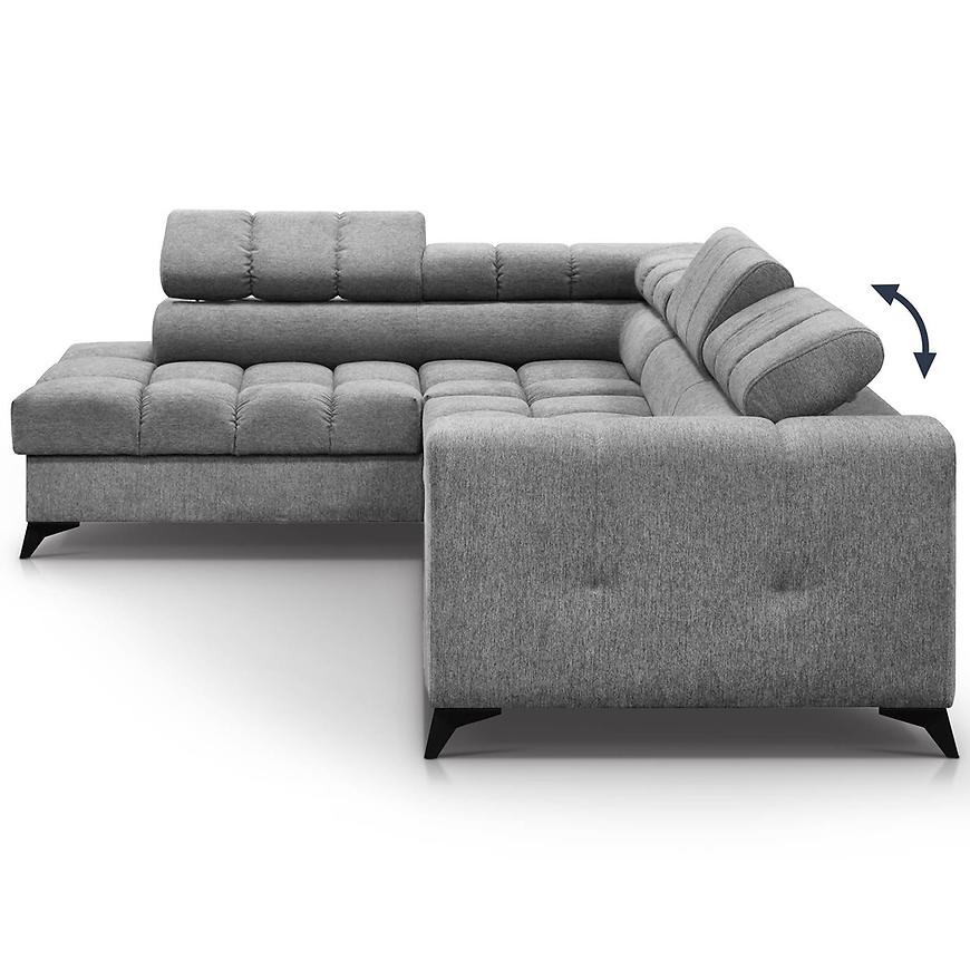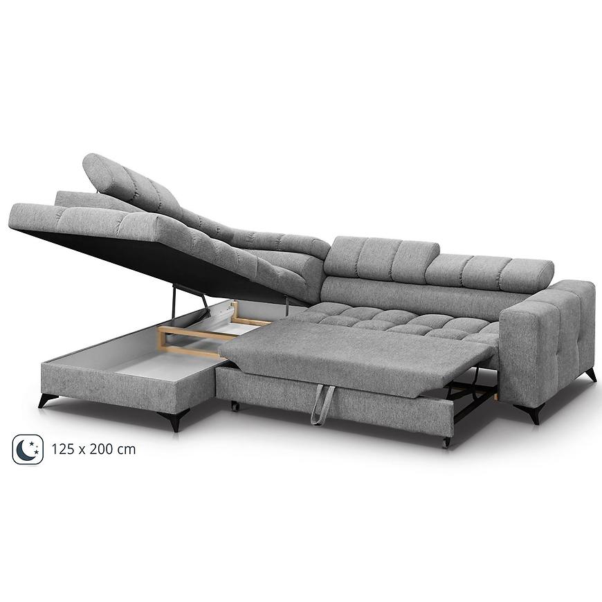 Narożnik Volf L Polaris 18 w kolorze szarym to nowoczesny mebel w kształcie litery L o wymiarach 267x205 cm. Wyposażony jest w funkcję spania z powierzchnią 200x125 cm i mechanizm rozkładania typu „delfin”. Siedzisko wypełnione jest sprężyną falistą, a wysokość do siedziska wynosi 44 cm przy głębokości 58 cm. Narożnik posiada jeden pojemnik na pościel oraz regulowany zagłówek. Mebel stoi na czarnych nogach i wymaga samodzielnego montażu. Nie zawiera pufy ani poduszek w zestawie.