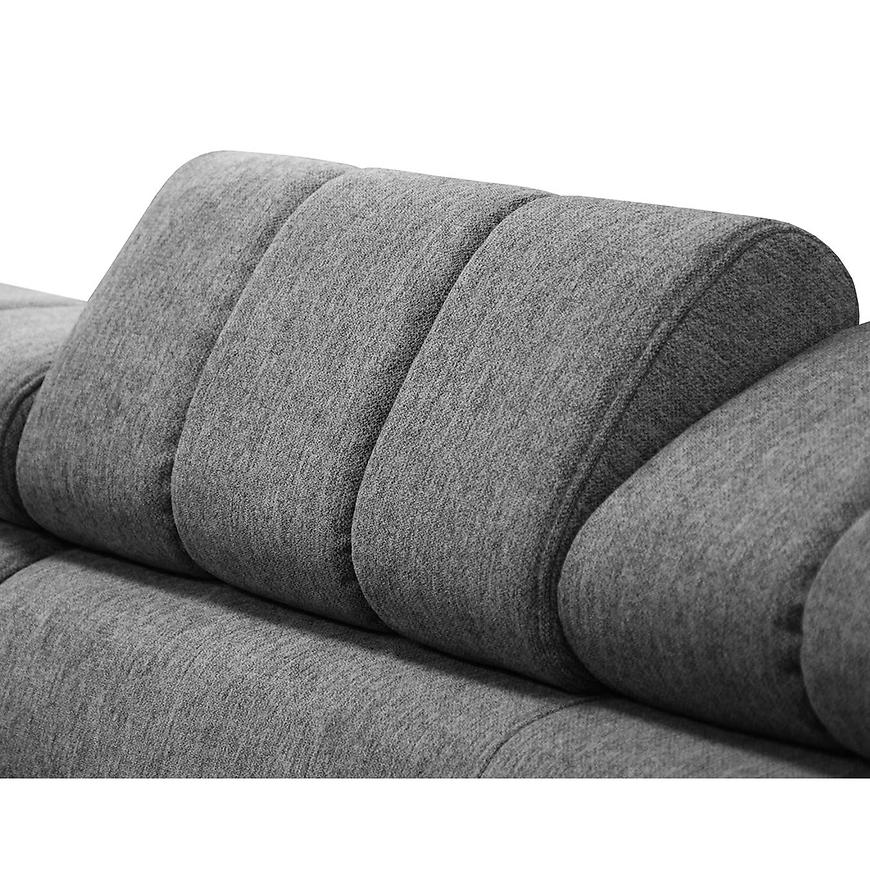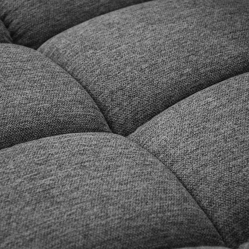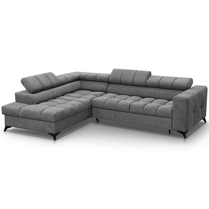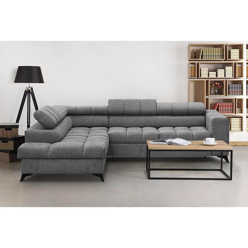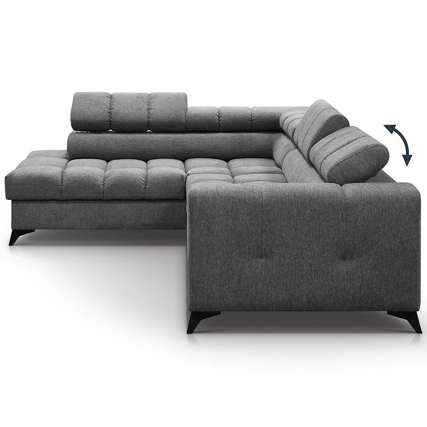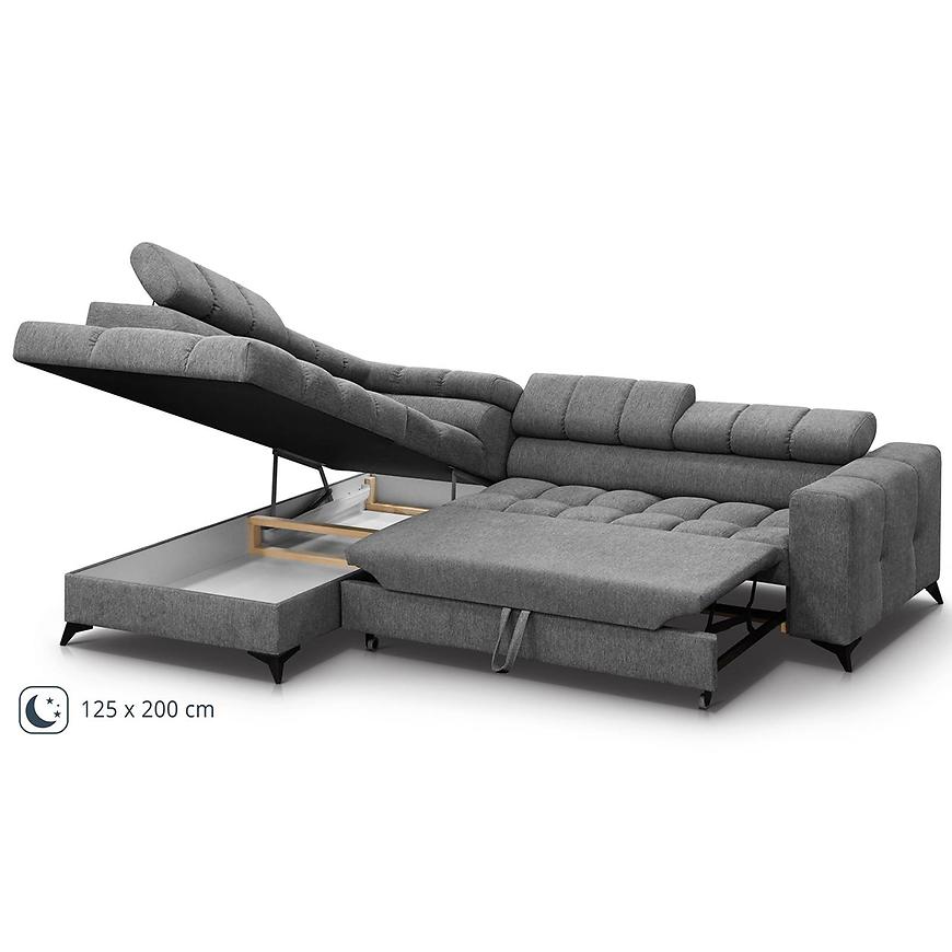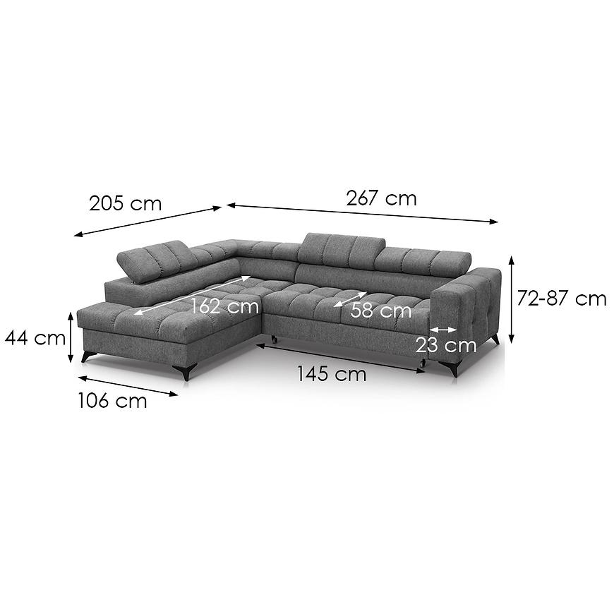 Narożnik Volf L Polaris 19 w kolorze szarym to nowoczesny narożnik w kształcie litery L o wymiarach 267x205 cm. Wyposażony jest w funkcję spania z powierzchnią 200x125 cm i mechanizm rozkładania typu „delfin”. Siedzisko wypełnione sprężyną falistą ma wysokość 44 cm i głębokość 58 cm. Narożnik posiada jeden pojemnik na pościel oraz regulowany zagłówek. Stoi na czarnych nogach i wymaga samodzielnego montażu. W zestawie nie ma poduszek ani pufy.