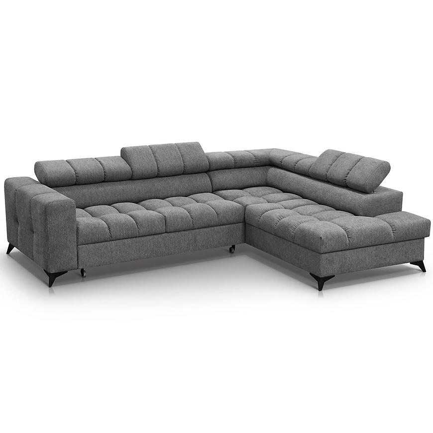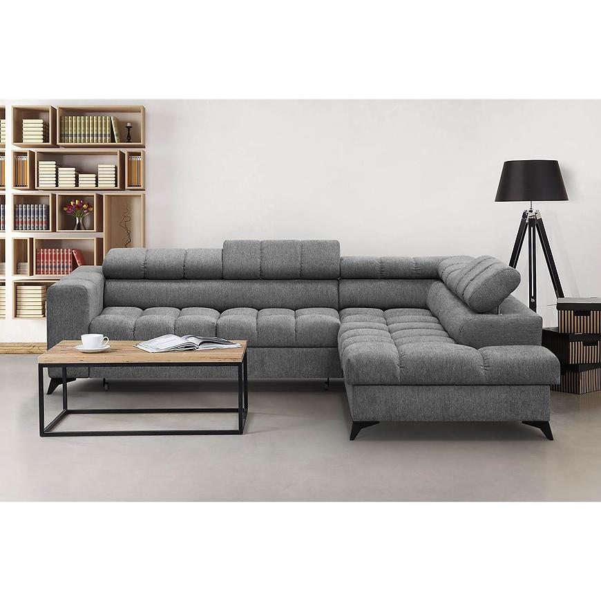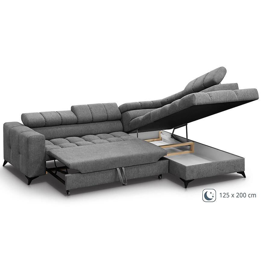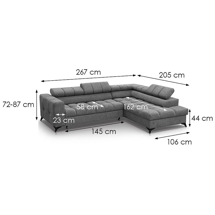 Narożnik Volf L Polaris 19 w szarym kolorze to nowoczesny narożnik w kształcie litery L o orientacji prawostronnej, o wymiarach 267x205 cm. Posiada funkcję spania z powierzchnią 200x125 cm i mechanizm rozkładania typu „delfin”. Siedzisko wypełnione sprężyną falistą ma wysokość 44 cm i głębokość 58 cm. Narożnik wyposażony jest w jeden pojemnik na pościel oraz regulowany zagłówek. Stoi na czarnych nogach, wymaga montażu i nie zawiera poduszek ani pufy w zestawie.