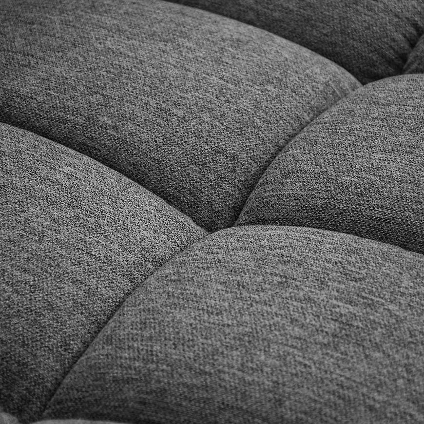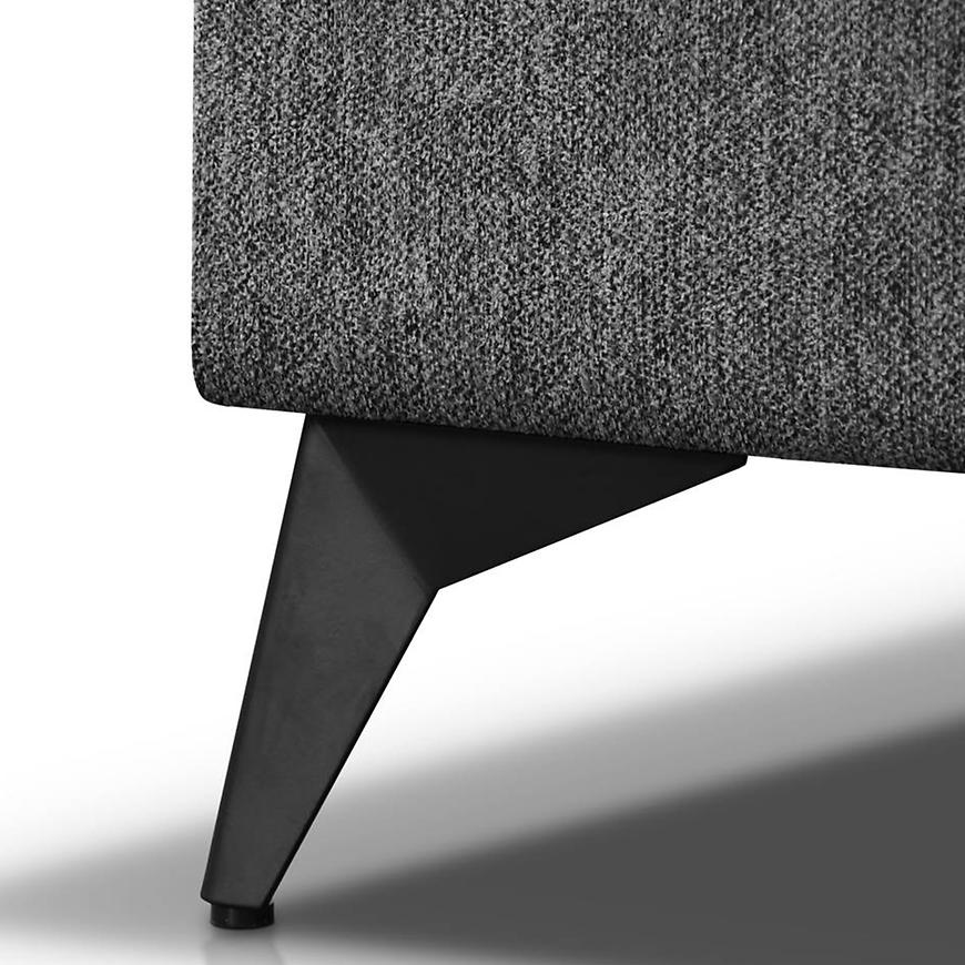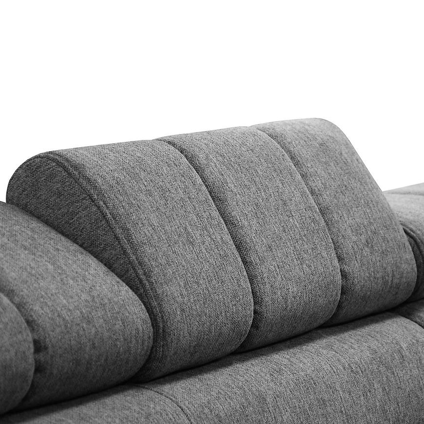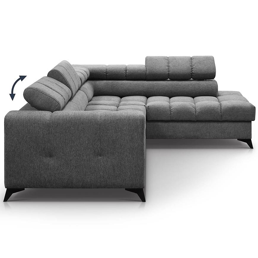 Narożnik Volf L Polaris 19 w szarym kolorze to nowoczesny narożnik w kształcie litery L o orientacji prawostronnej, o wymiarach 267x205 cm. Posiada funkcję spania z powierzchnią 200x125 cm i mechanizm rozkładania typu „delfin”. Siedzisko wypełnione sprężyną falistą ma wysokość 44 cm i głębokość 58 cm. Narożnik wyposażony jest w jeden pojemnik na pościel oraz regulowany zagłówek. Stoi na czarnych nogach, wymaga montażu i nie zawiera poduszek ani pufy w zestawie.