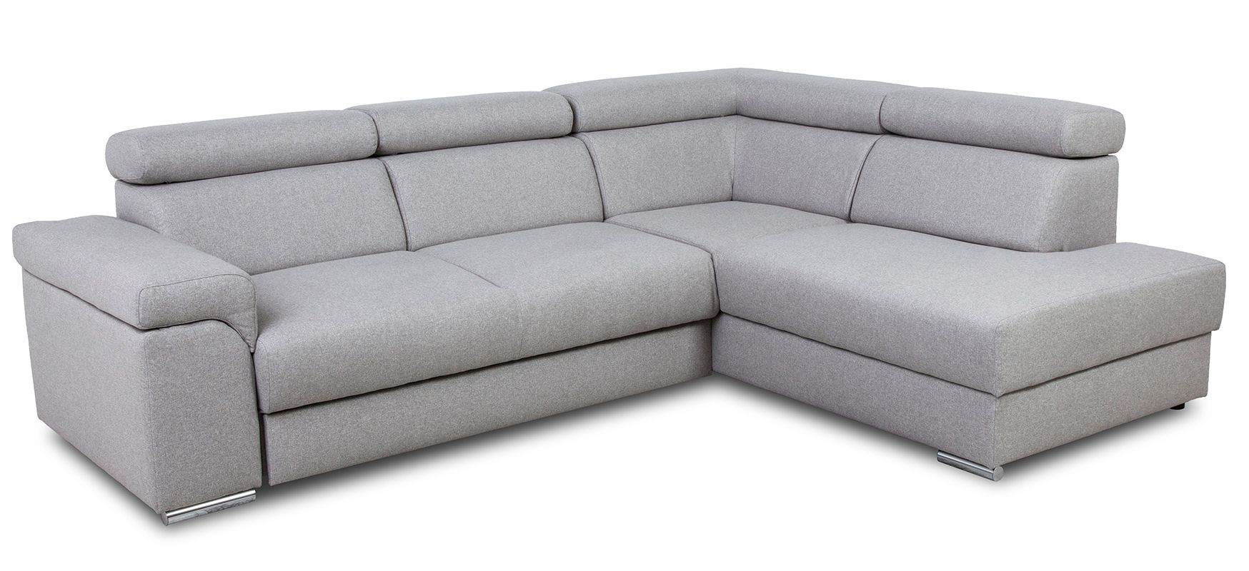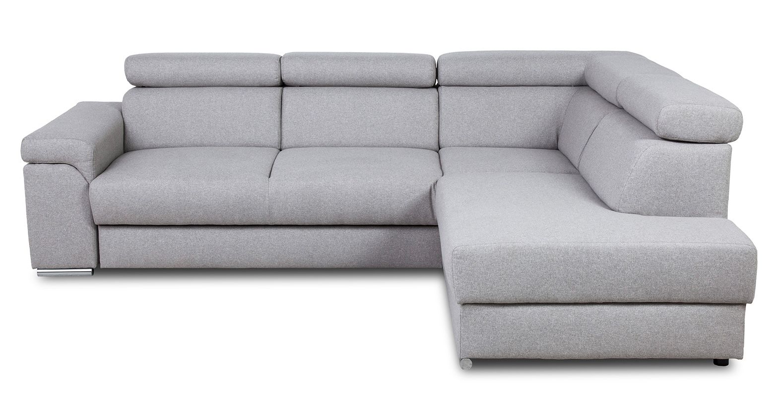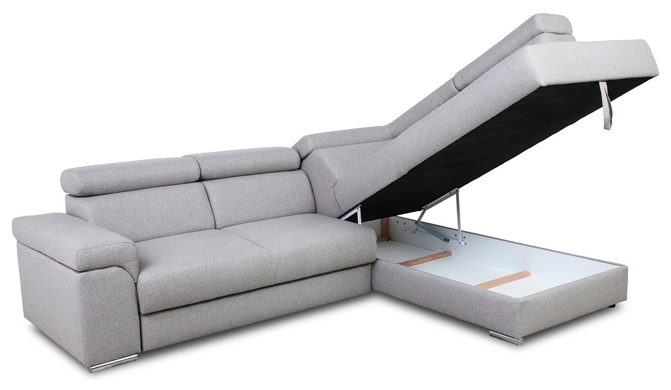 Narożnik Wersal wyróżnia się także trzema regulowanymi zagłówkami na oparciach, które pozwalają dostosować narożnik do własnych preferencji i zapewnić optymalne podparcie dla głowy i szyi. Metalowe nóżki w kolorze chrom dodają meblowi elegancji i lekkości, jednocześnie zapewniając stabilność i wytrzymałość konstrukcji.
