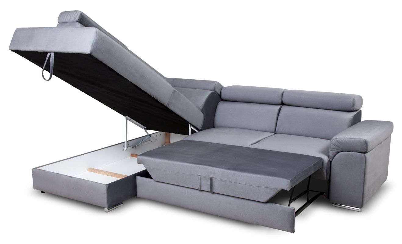 Jedną z kluczowych cech narożnika Wersal jest jego funkcja spania, która pozwala na szybkie i łatwe przekształcenie go w wygodne łóżko. Dodatkowo pojemnik na pościel, zintegrowany w konstrukcji narożnika, umożliwia przechowywanie dodatkowego wyposażenia łóżkowego, jednocześnie utrzymując porządek w pomieszczeniu.