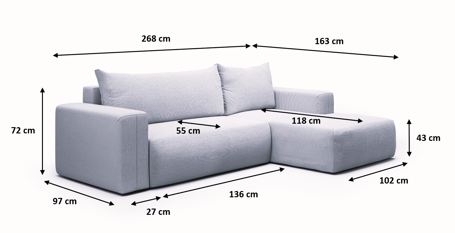 Siedzisko narożnika, wyposażone w sprężynę falistą typu B i piankę poliuretanową T3030, zapewnia niezrównany komfort podczas codziennego użytkowania. Wysokość siedziska wynosząca 43 cm sprawia, że odpoczynek staje się jeszcze bardziej relaksujący.