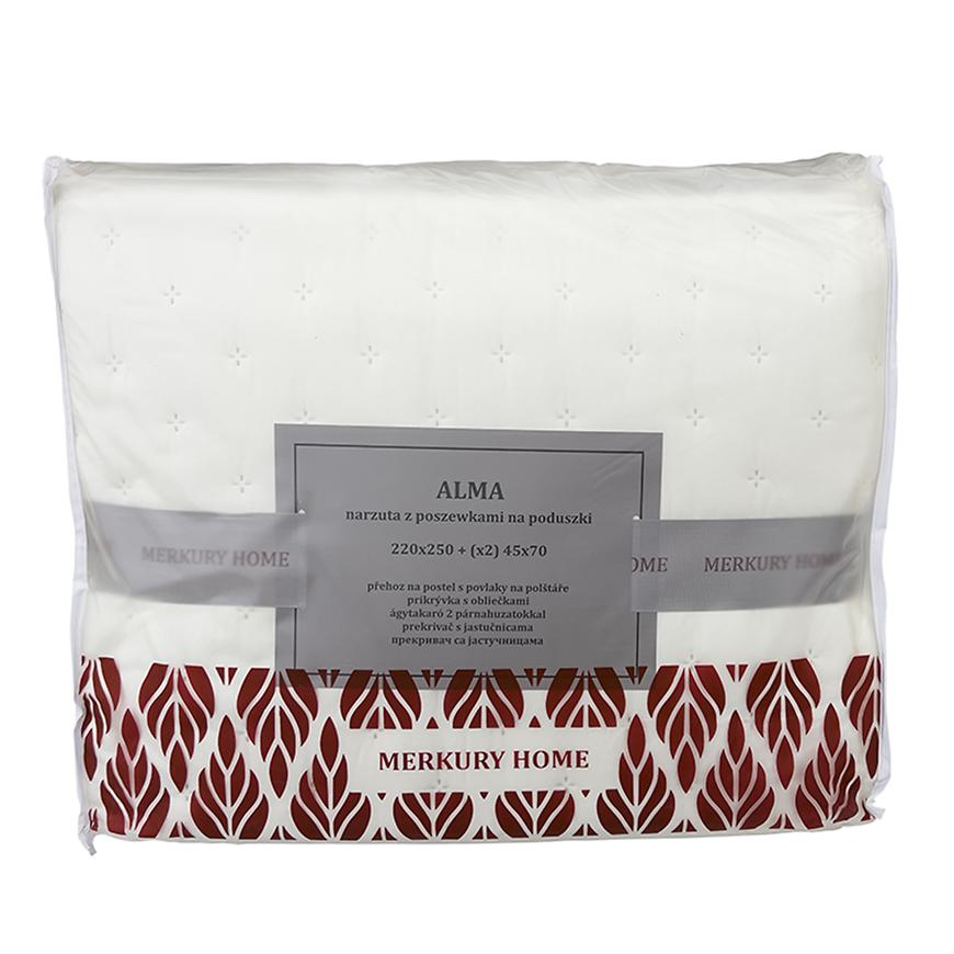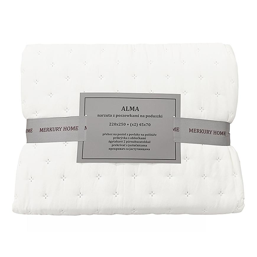 Gustowna i elegancka narzuta Alma idealnie będzie pasować jako dodatek do wykończenia wnętrza każdej sypialni zarówno w stylu nowoczesnym jak i klasycznym. Jest miła i przyjemna w dotyku, wprowadzi do wnętrza ład i harmonie. Ciekawe tłoczenia nadają niepowtarzalnego charakteru. W zestawie znajdują się również dwie poszewki o wymiarze 45x70 cm.