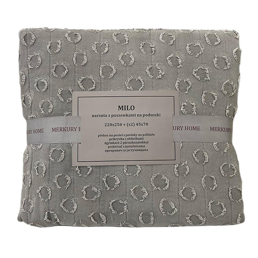 Gustowna i elegancka narzuta Milo idealnie będzie pasować jako dodatek do wykończenia wnętrza każdej sypialni zarówno w stylu nowoczesnym jak i klasycznym. Jest miła i przyjemna w dotyku, wprowadzi do wnętrza ład i harmonie. Ciekawe tłoczenia nadają niepowtarzalnego charakteru. W zestawie znajdują się również dwie poszewki o wymiarze 45x70 cm.