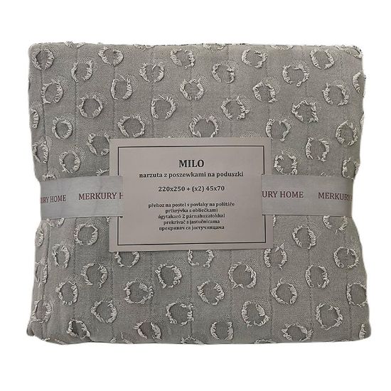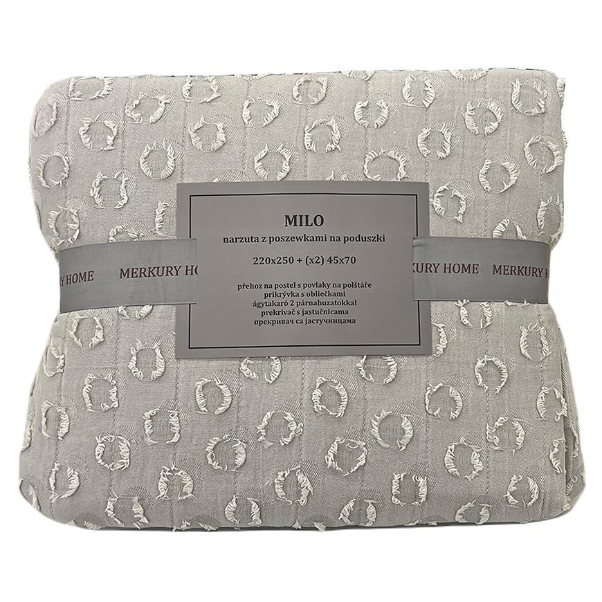 Gustowna i elegancka narzuta Milo idealnie będzie pasować jako dodatek do wykończenia wnętrza każdej sypialni zarówno w stylu nowoczesnym jak i klasycznym. Jest miła i przyjemna w dotyku, wprowadzi do wnętrza ład i harmonie. Ciekawe tłoczenia nadają niepowtarzalnego charakteru. W zestawie znajdują się również dwie poszewki o wymiarze 45x70 cm.