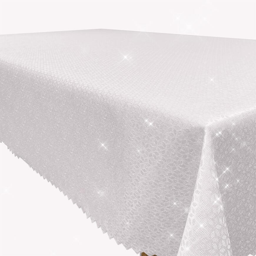 Obrus z kolekcji Glitter 140x250 cm to połączenie klasycznej bieli z subtelnym srebrnym połyskiem. Wykonany w 100% z poliestru, zapewnia trwałość, łatwość w pielęgnacji oraz elegancki wygląd podczas uroczystych spotkań, takich jak święta, kolacje czy wesela. Dodatek błyszczącej nici w formie delikatnego plastra miodu nadaje wnętrzu nowoczesny i luksusowy akcent.